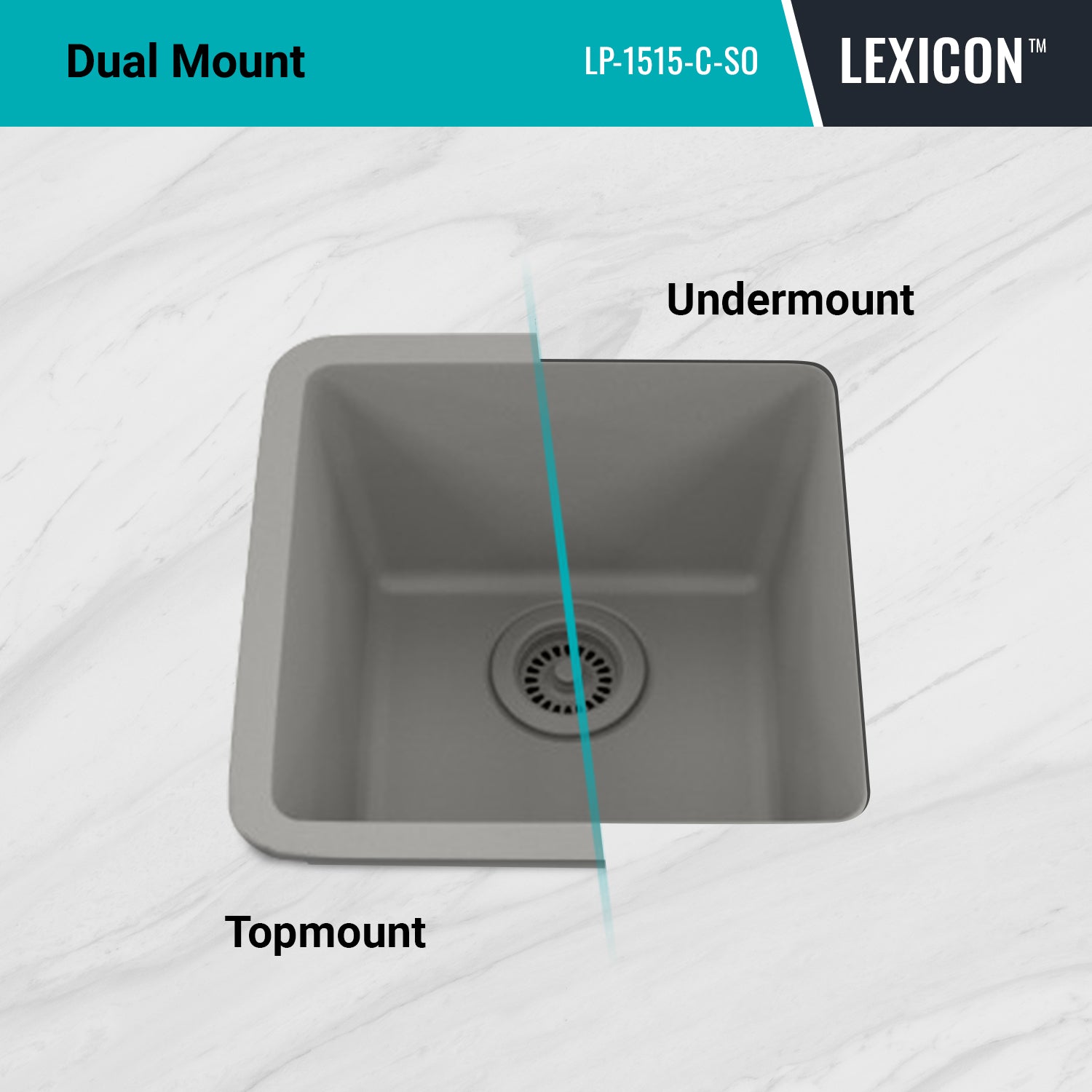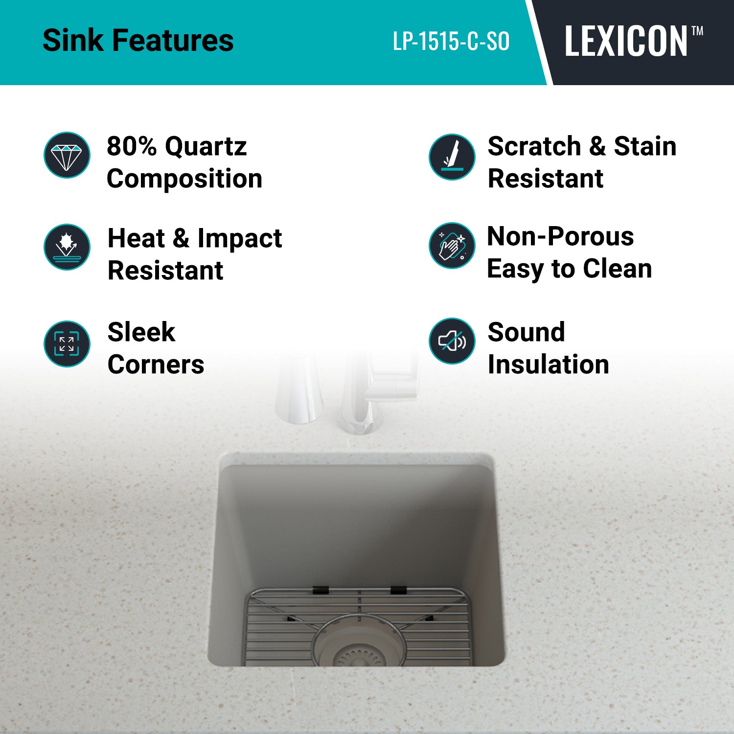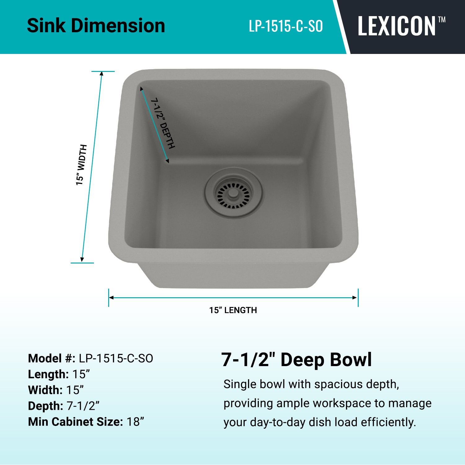 Elevate your Kitchen with the unmatched quality of the LEXICON™ Platinum Quartz Small Single Bowl Kitchen Sink. The LP-1515 Concrete contemporary design and unparalleled convenience. Experience the luxury of a deep 7-1/2 inch bowl with rear positioned drain for optimal under-counter space utilization, and flawlessly smooth corner radius for effortless maintenance and care.