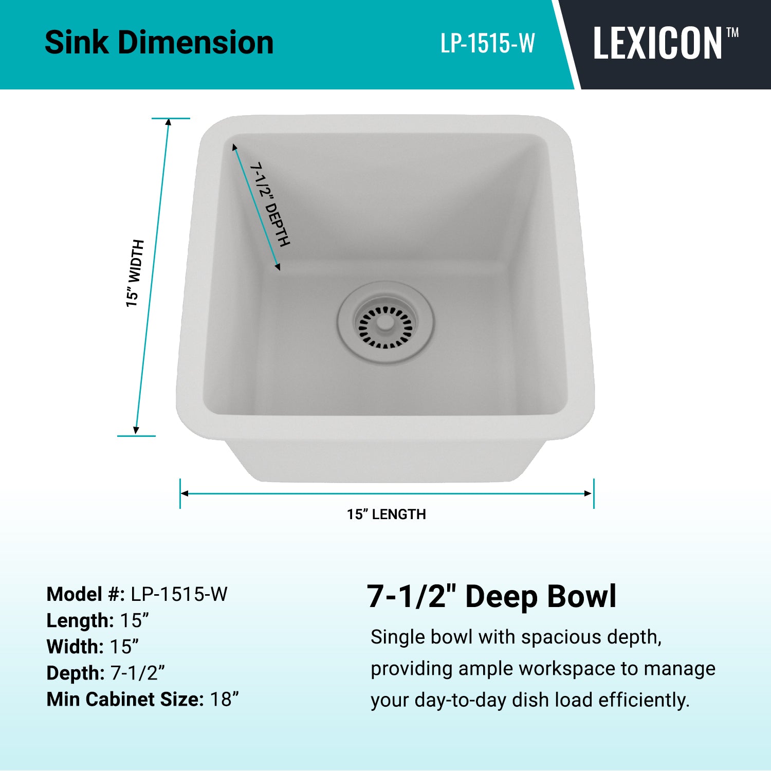 Elevate your Kitchen with the unmatched quality of the LEXICON™ Platinum Quartz Small Single Bowl Kitchen Sink. The LP-1515 White contemporary design and unparalleled convenience, includes meticulously crafted matching drain and bottom grid. Experience the luxury of a deep 7-1/2 inch bowl with rear positioned drain for optimal under-counter space utilization, and flawlessly smooth corner radius for effortless maintenance and care.