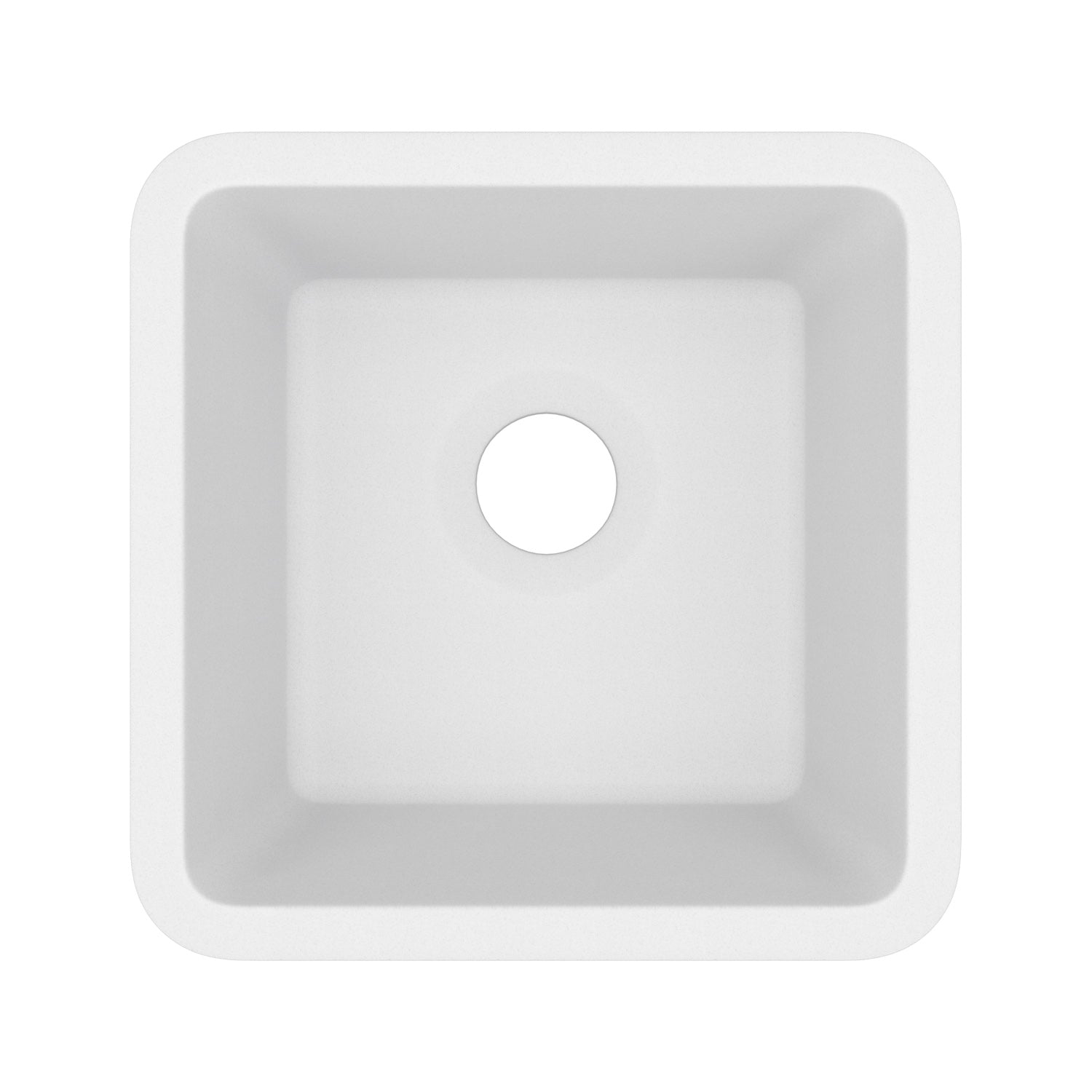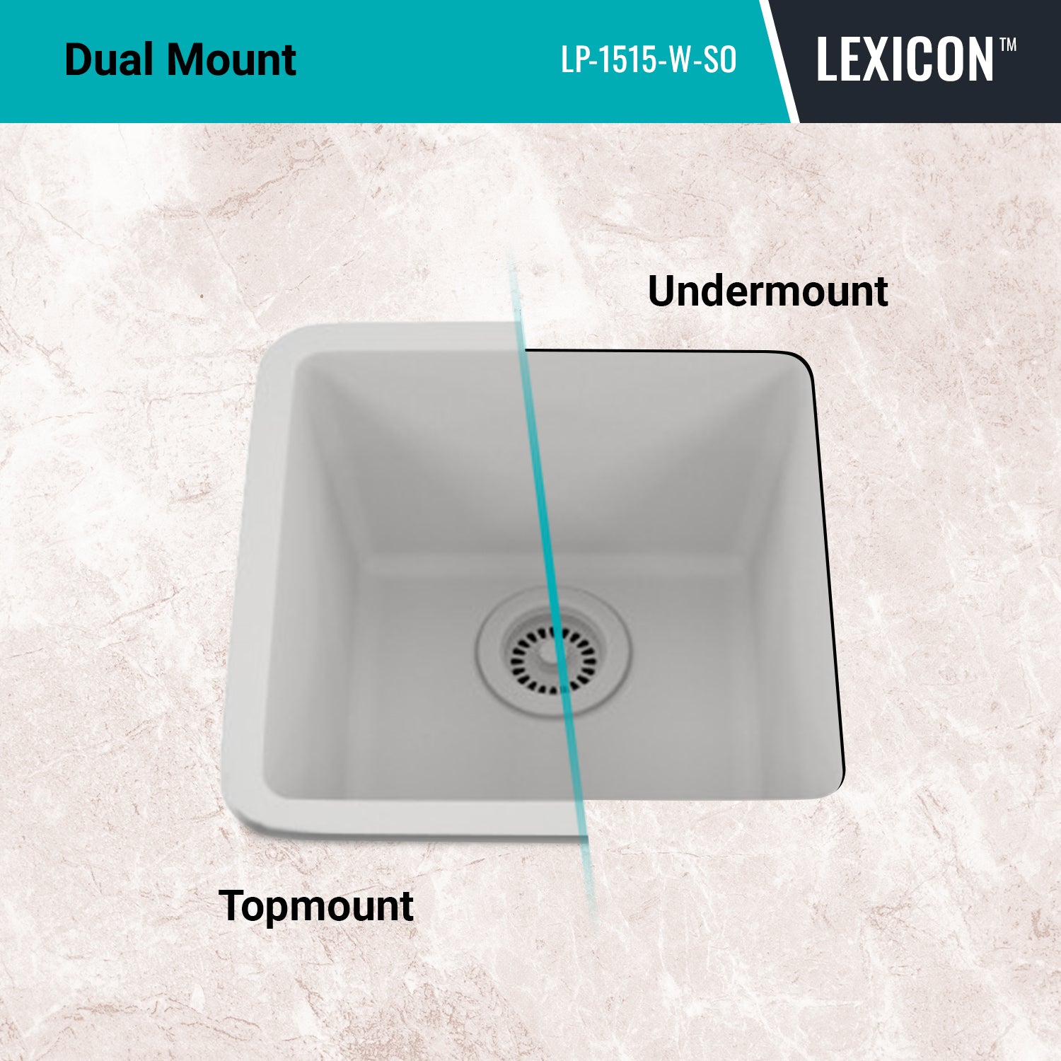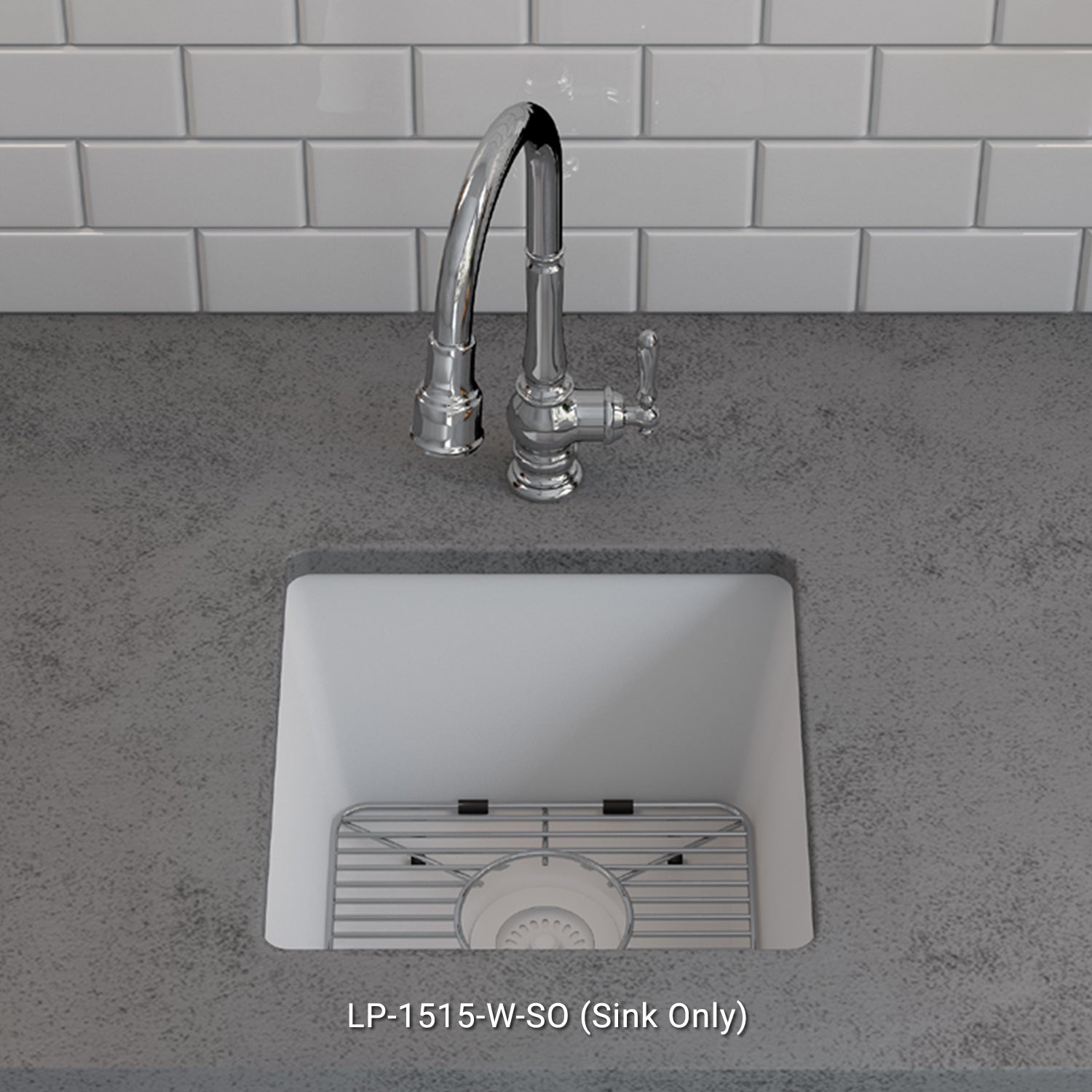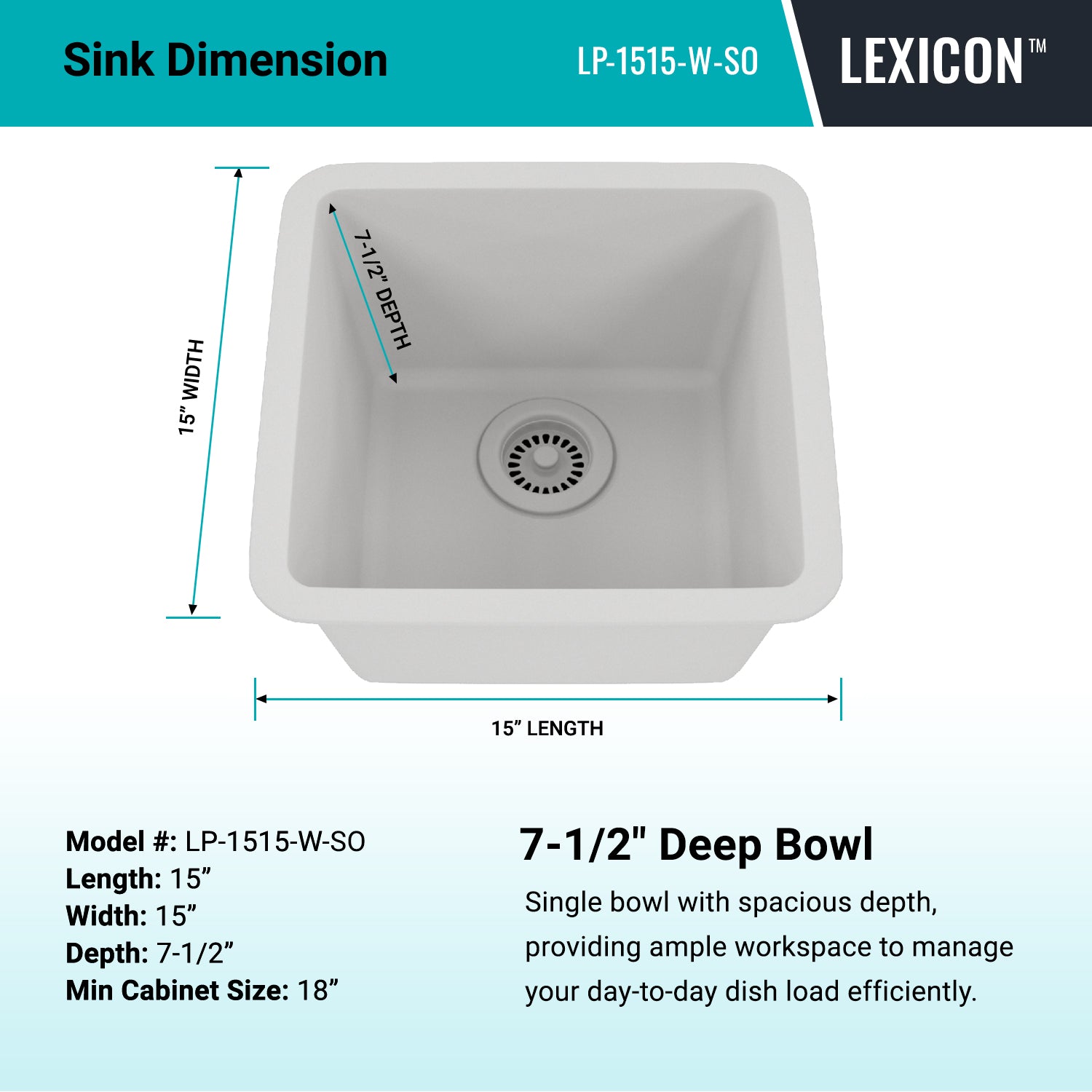 Elevate your Kitchen with the unmatched quality of the LEXICON™ Platinum Quartz Small Single Bowl Kitchen Sink. The LP-1515 White contemporary design and unparalleled convenience. Experience the luxury of a deep 7-1/2 inch bowl with rear positioned drain for optimal under-counter space utilization, and flawlessly smooth corner radius for effortless maintenance and care.