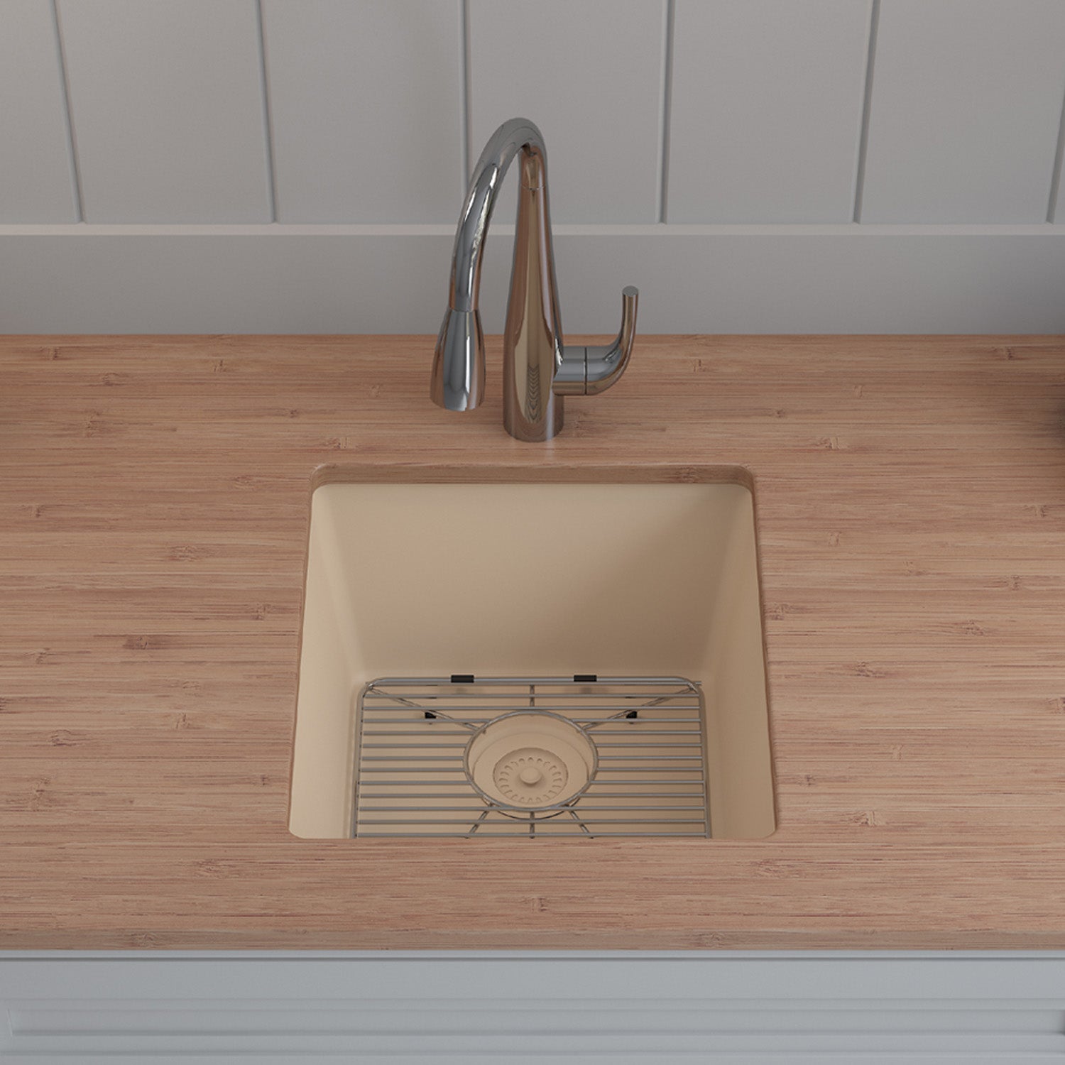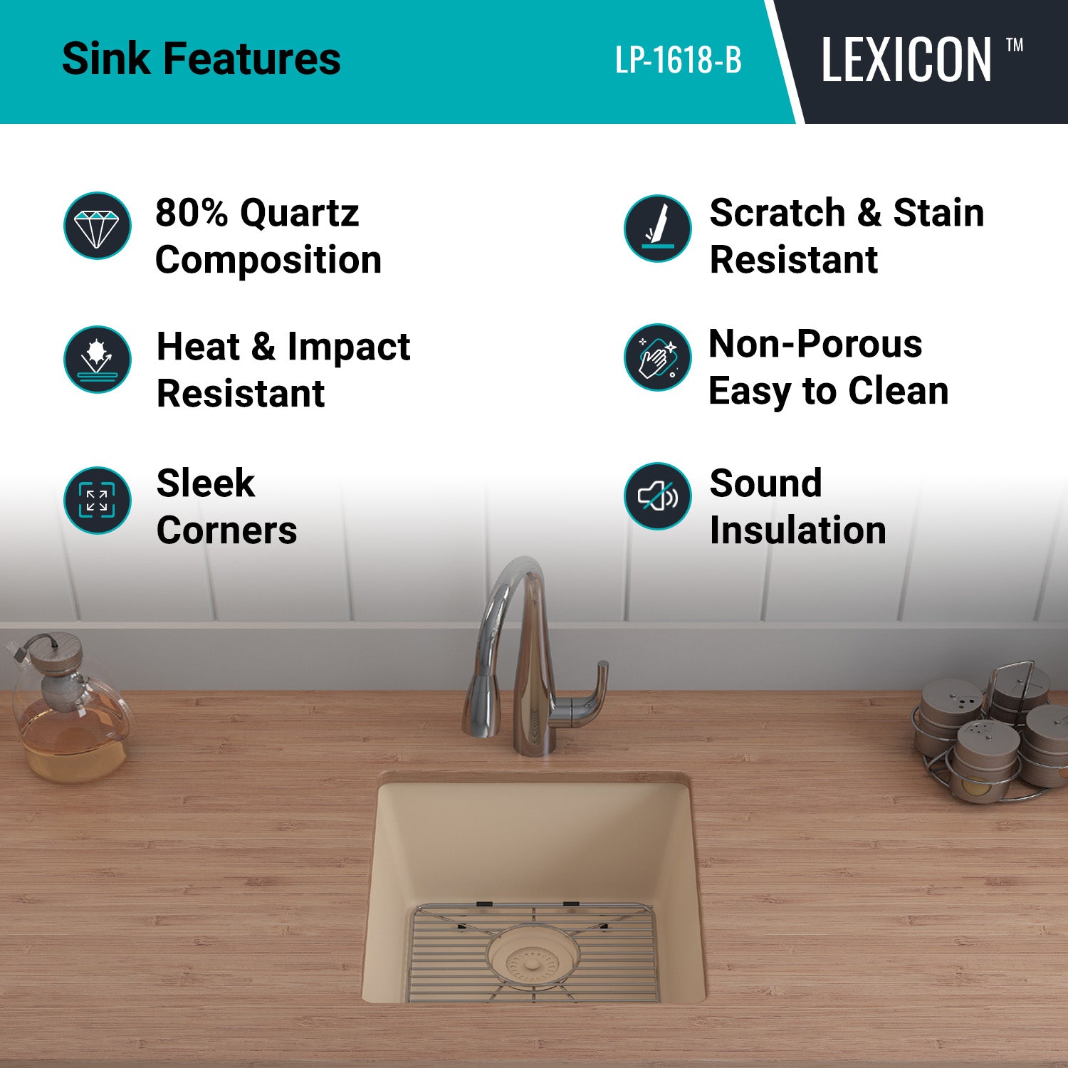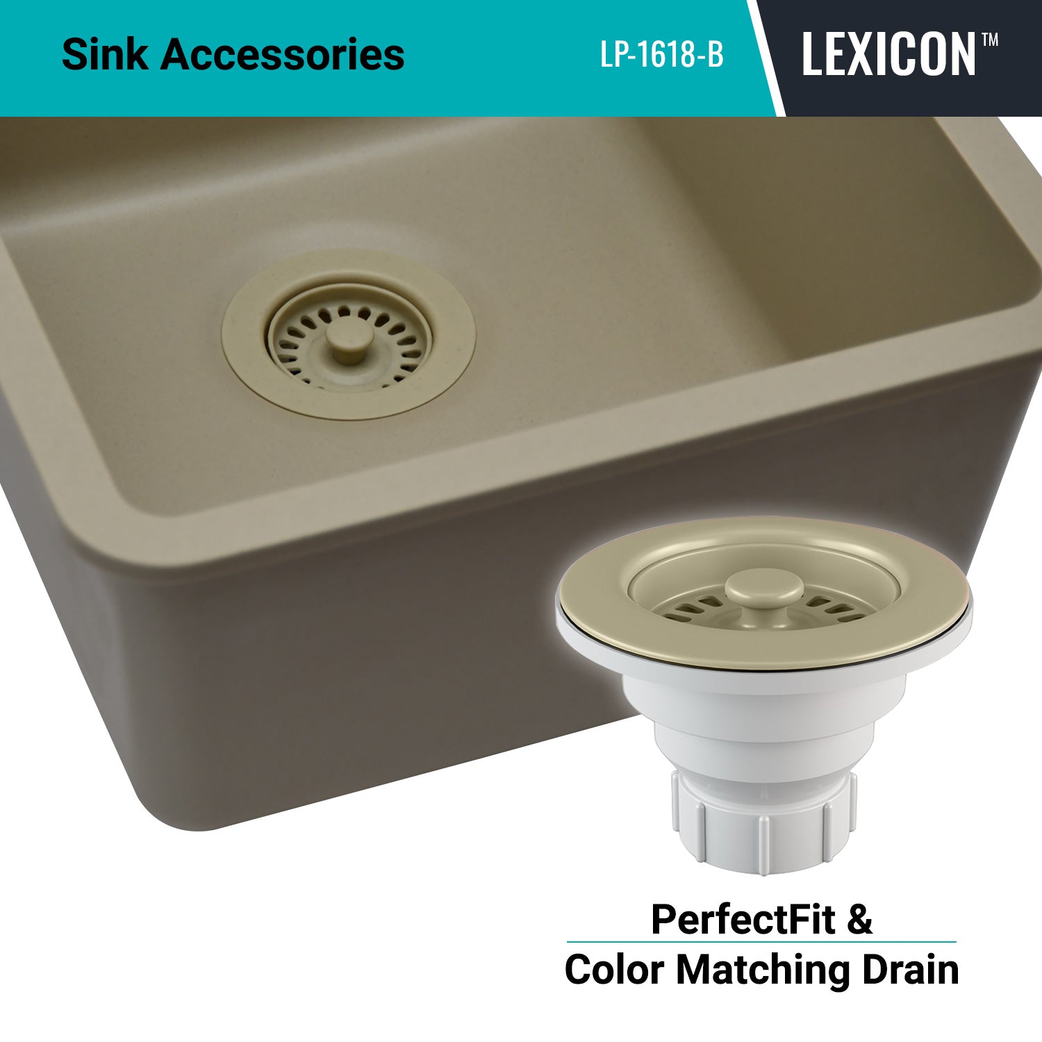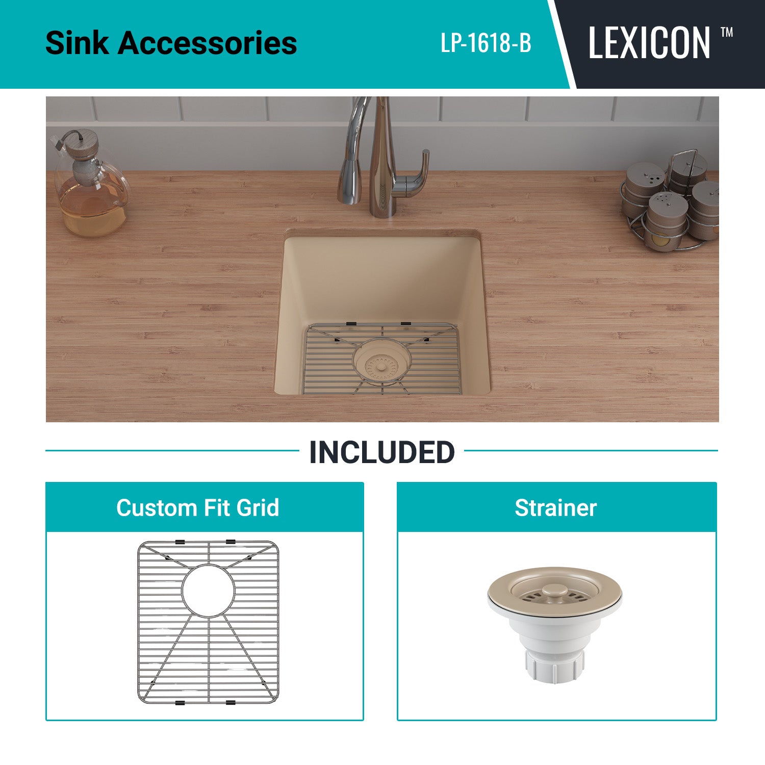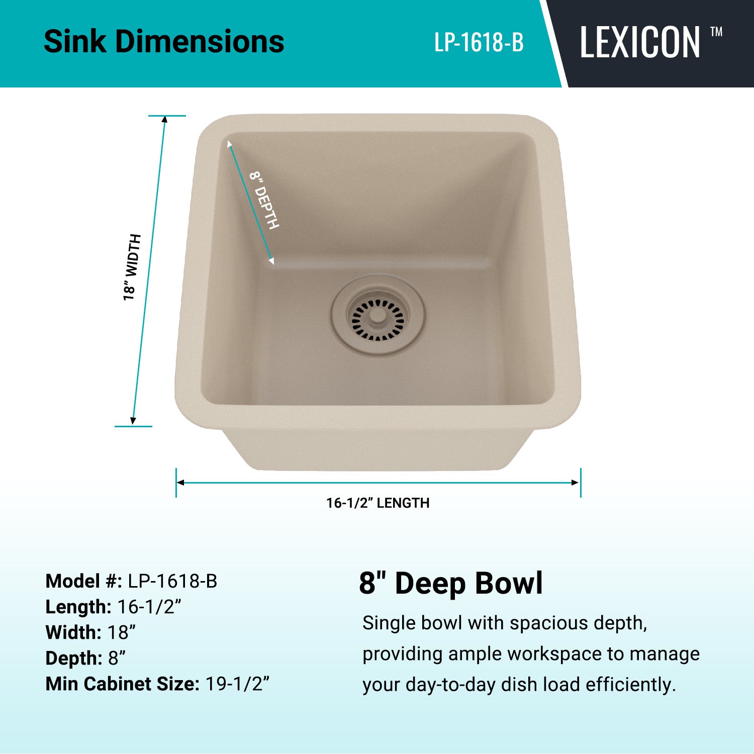 The Lexicon Platinum LP-1618 Beige Small Single Bowl Kitchen Sink offers cutting-edge design with a complete package that includes a matching drain and a stylish bottom grid. Features include an 8 Inch deep bowl, sleek corner radius for easy cleaning and rear drain placement for additional under counter space. The versatile dual-mount rim allows for both undermount and drop-in installations.