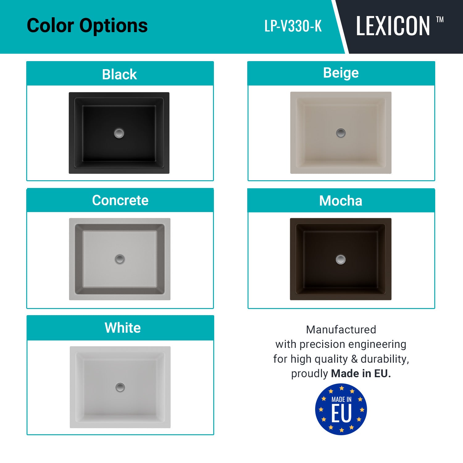 The LEXICON™ LP-V330-K Rectangle Black Bathroom Vanity Sink are constructed from 80% natural quartz, creating an incredibly durable Sink. Quartz has the smooth feel of stone with superb sound-absorption properties and provides maximum protection against heat, scratches and stains. LEXICON Sinks are backed by a limited lifetime warranty.