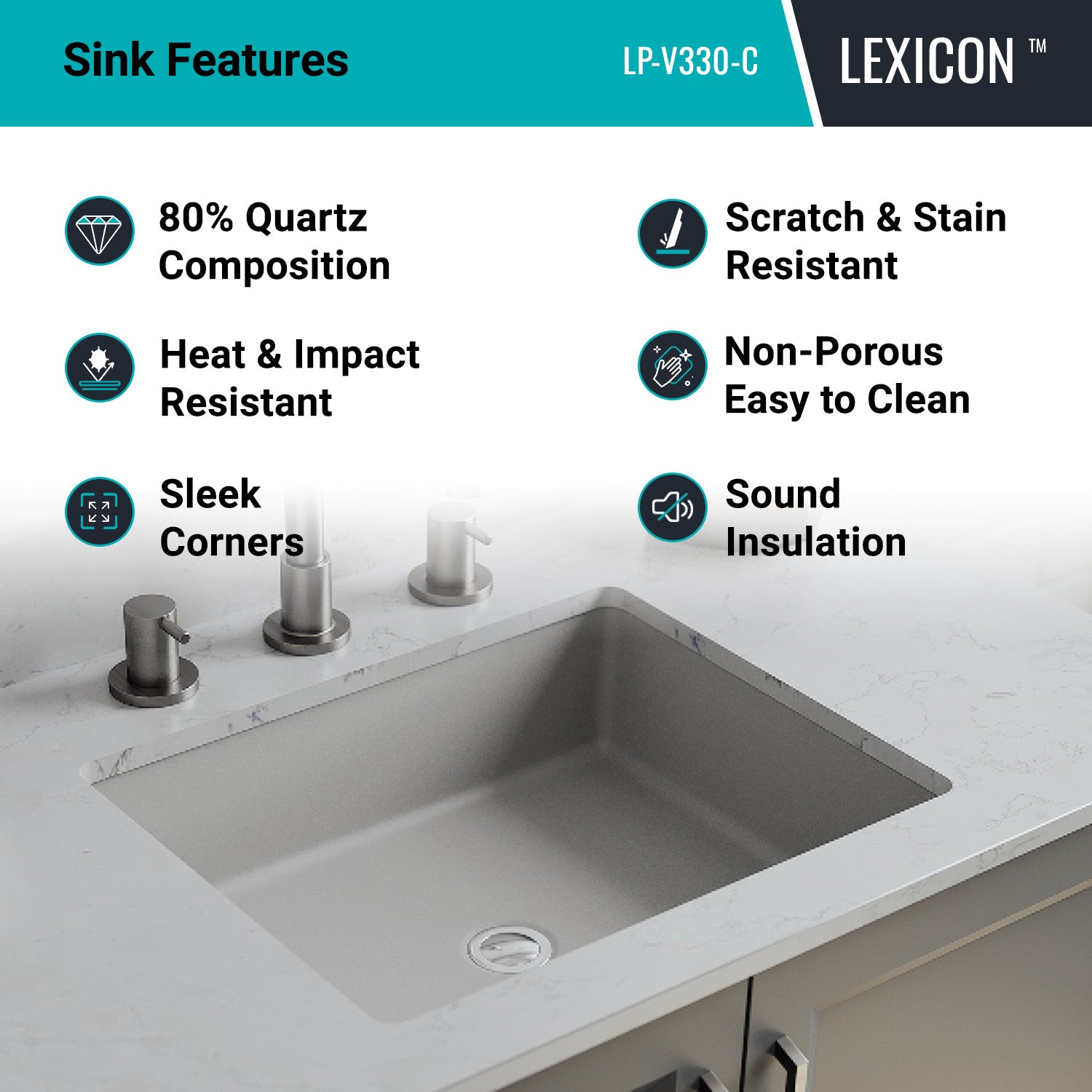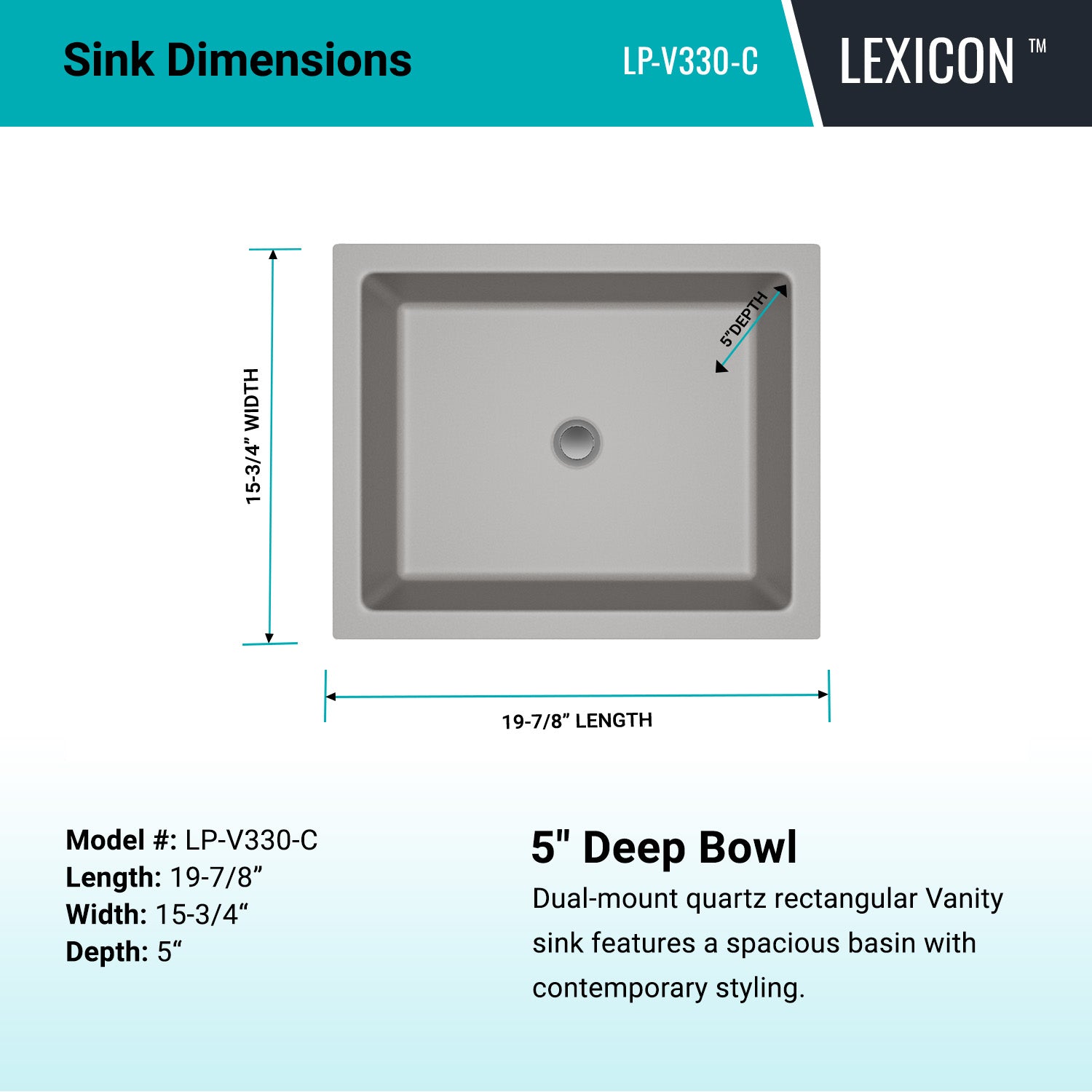 The LEXICON™ LP-V330-C Rectangle Concrete Bathroom Vanity Sink are constructed from 80% natural quartz, creating an incredibly durable Sink. Quartz has the smooth feel of stone with superb sound-absorption properties and provides maximum protection against heat, scratches and stains. LEXICON Sinks are backed by a limited lifetime warranty.