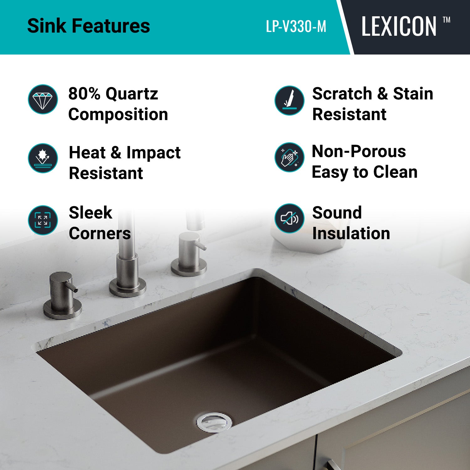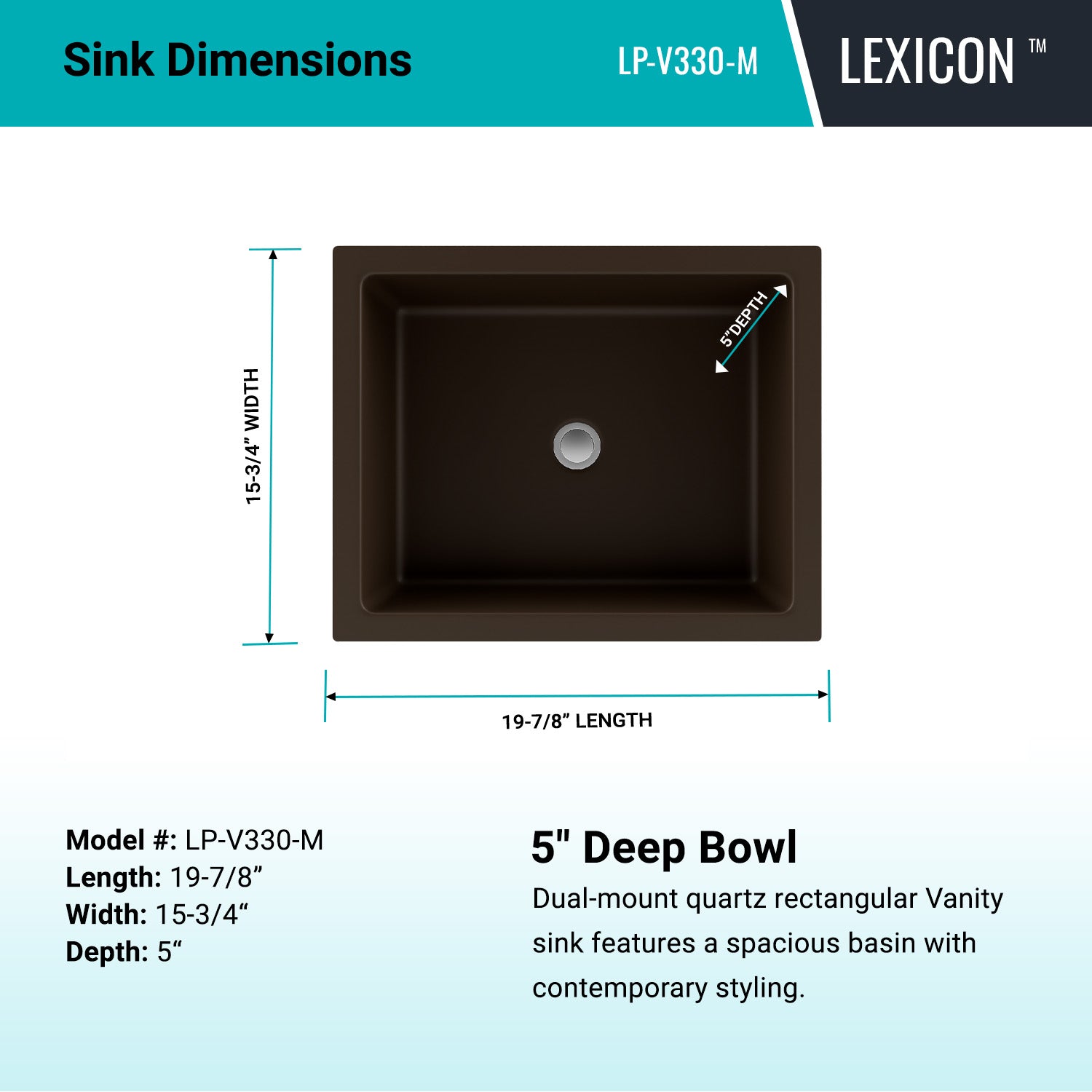 The LEXICON™ LP-V330-M Rectangle Mocha Bathroom Vanity Sink are constructed from 80% natural quartz, creating an incredibly durable Sink. Quartz has the smooth feel of stone with superb sound-absorption properties and provides maximum protection against heat, scratches and stains. LEXICON Sinks are backed by a limited lifetime warranty.
