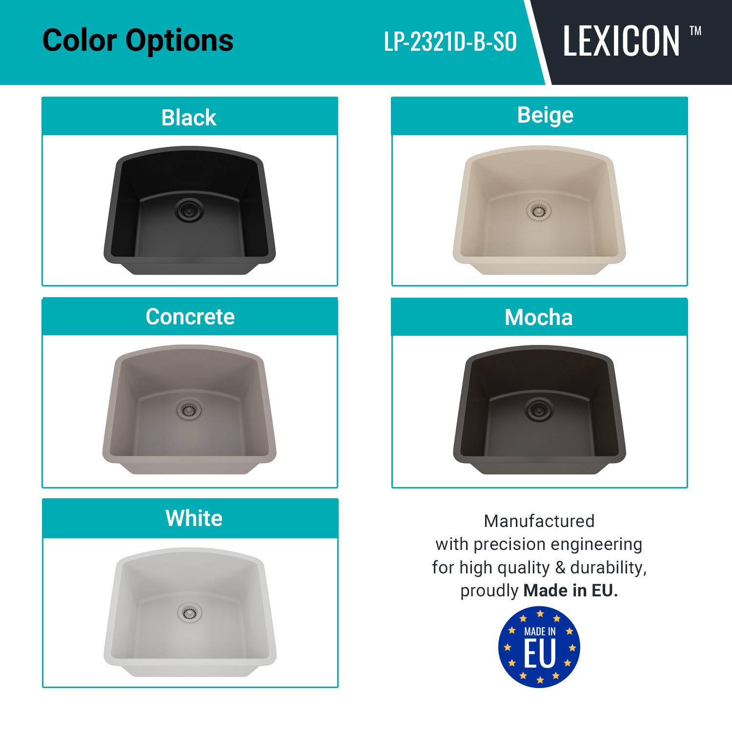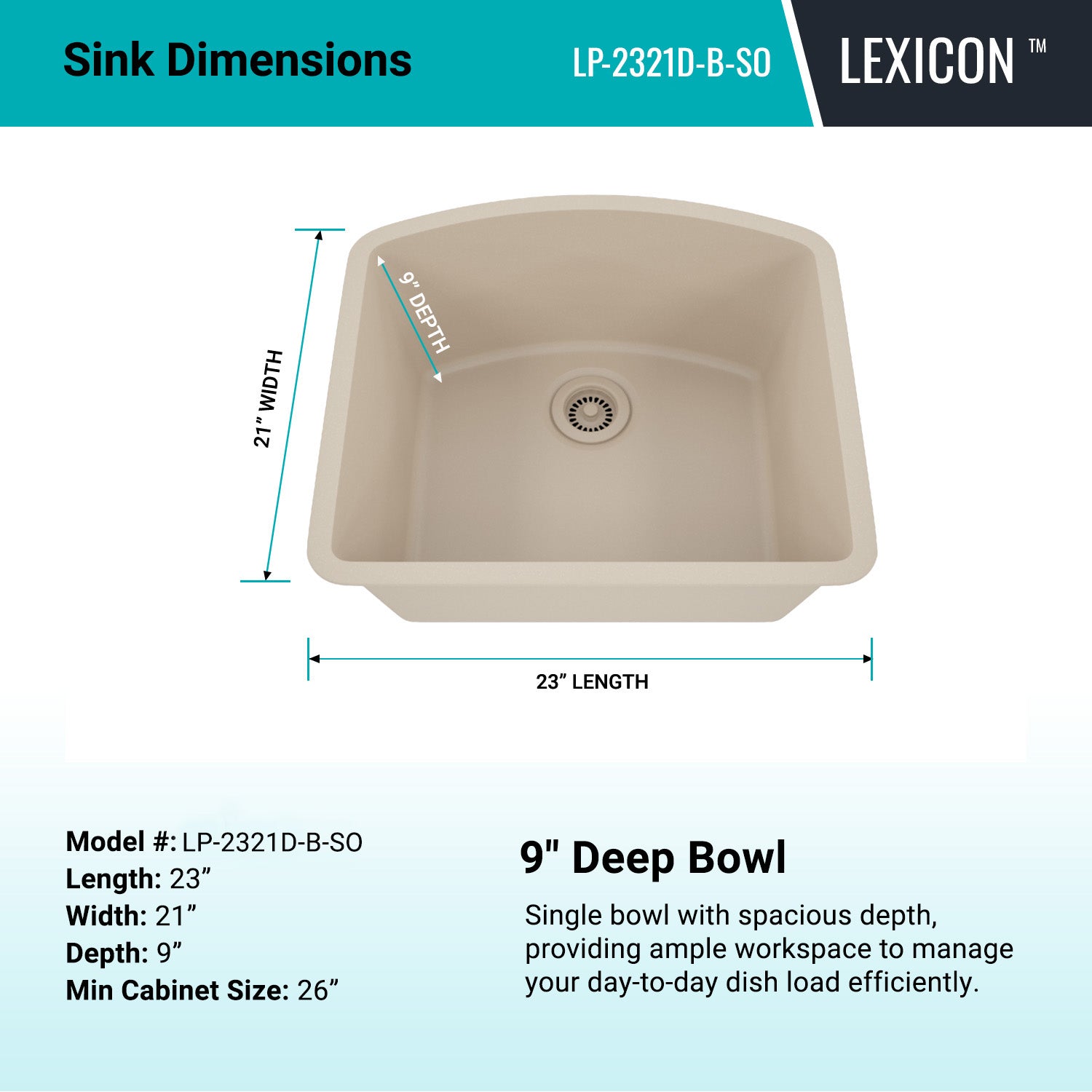 Elevate your kitchen with the unmatched quality of the Lexicon Platinum Quartz D-Shaped Single Bowl Kitchen Sink. The LP-2321D Beige epitomizes contemporary design and unparalleled convenience. Experience the luxury of a deep 9-inch bowl with rear positioned drain for optimal under-counter space utilization, and flawlessly smooth corner radiuses for effortless maintenance and care.