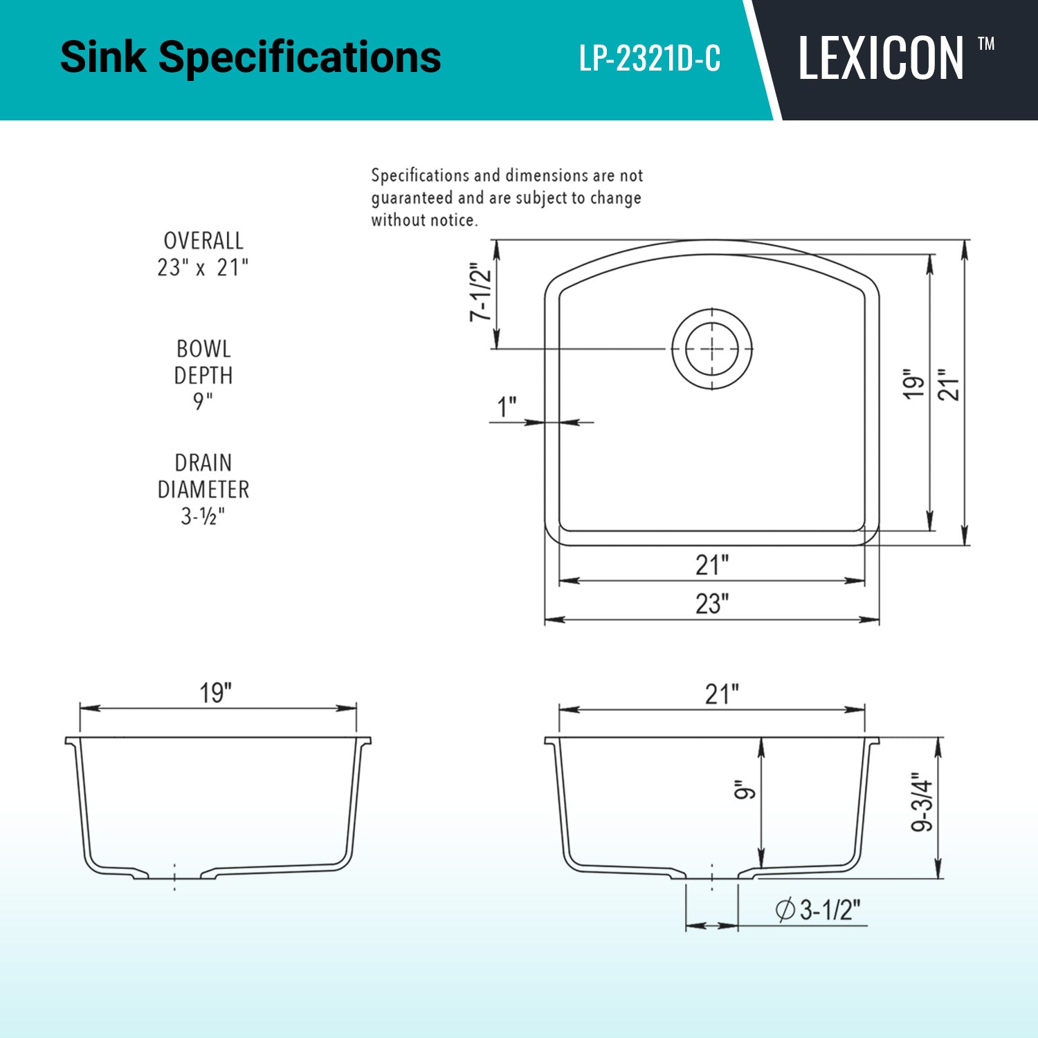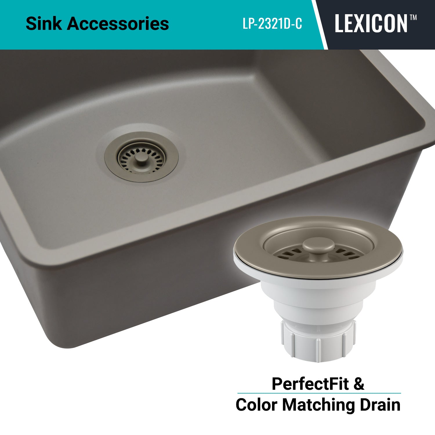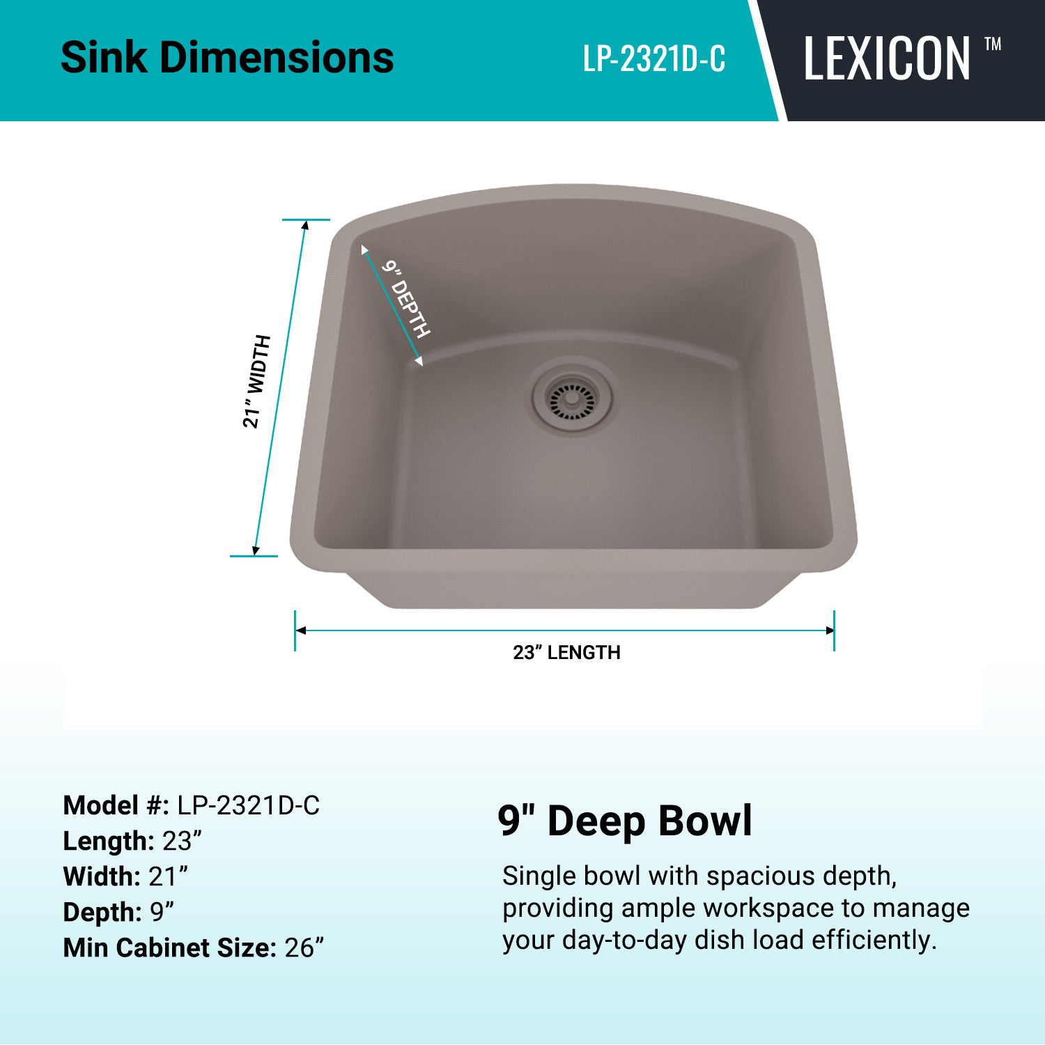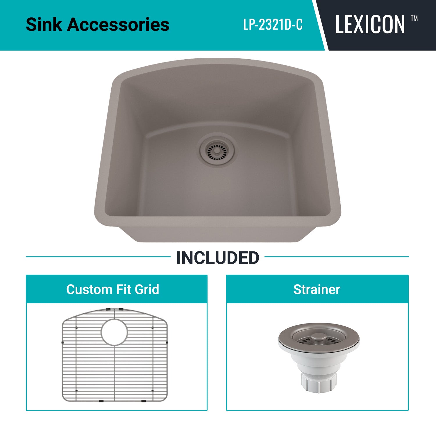 Elevate your Kitchen with the unmatched quality of the LEXICON™ Platinum Quartz D-Shaped Single Bowl Kitchen Sink. The LP-2321D Concrete contemporary design and unparalleled convenience, includes meticulously crafted matching drain and bottom grid. Experience the luxury of a deep 9-inch bowl with rear positioned drain for optimal under-counter space utilization, and flawlessly smooth corner radiuses for effortless maintenance and care.
