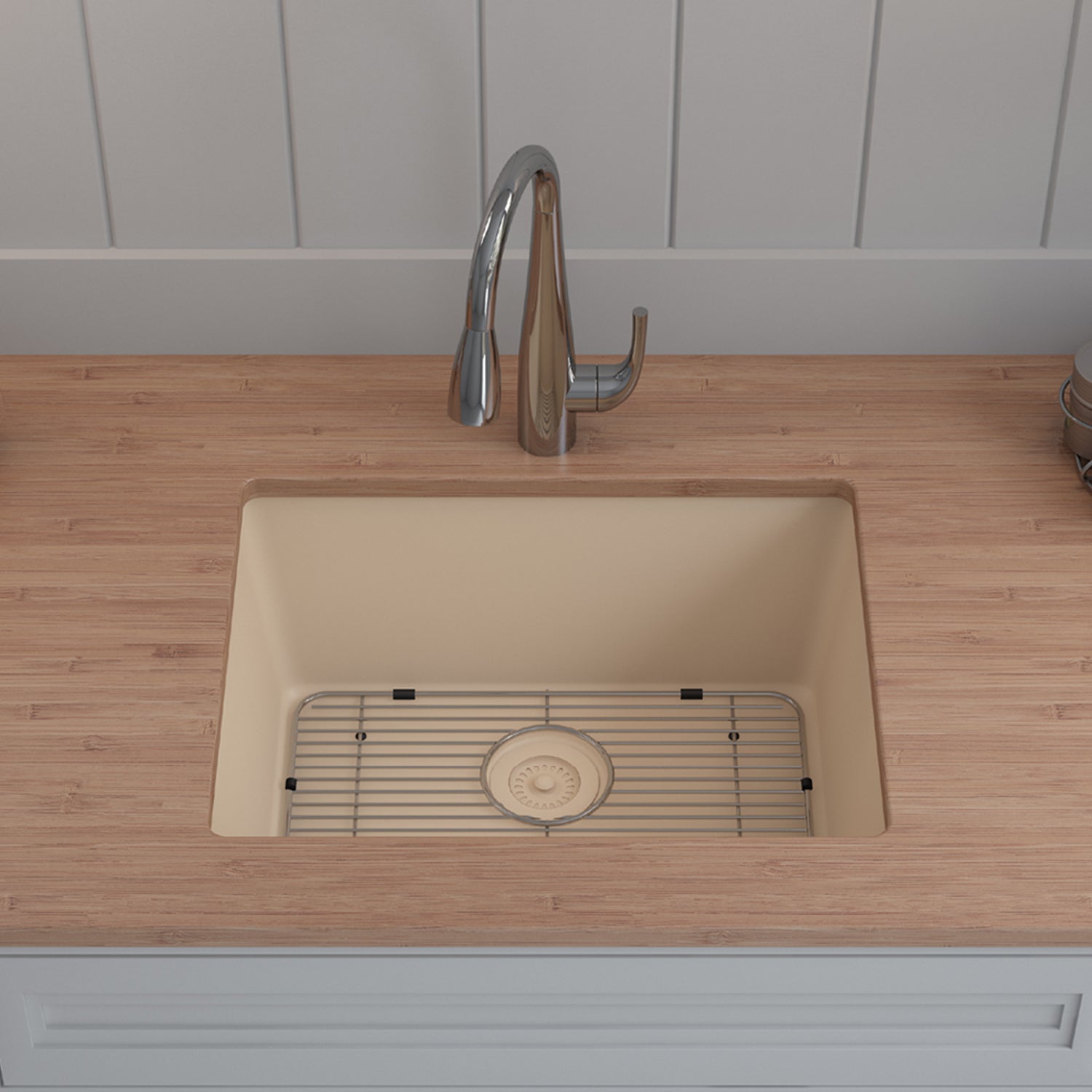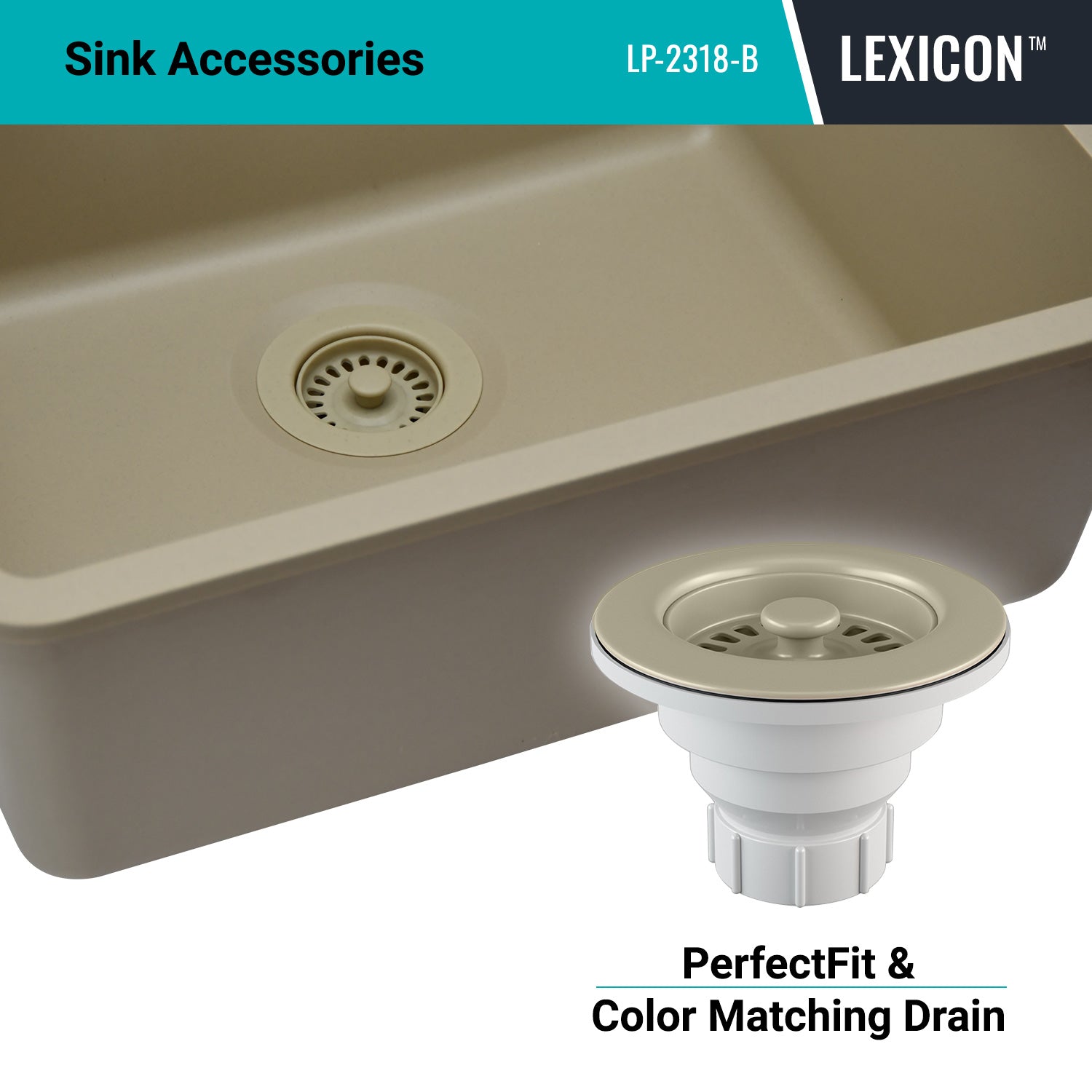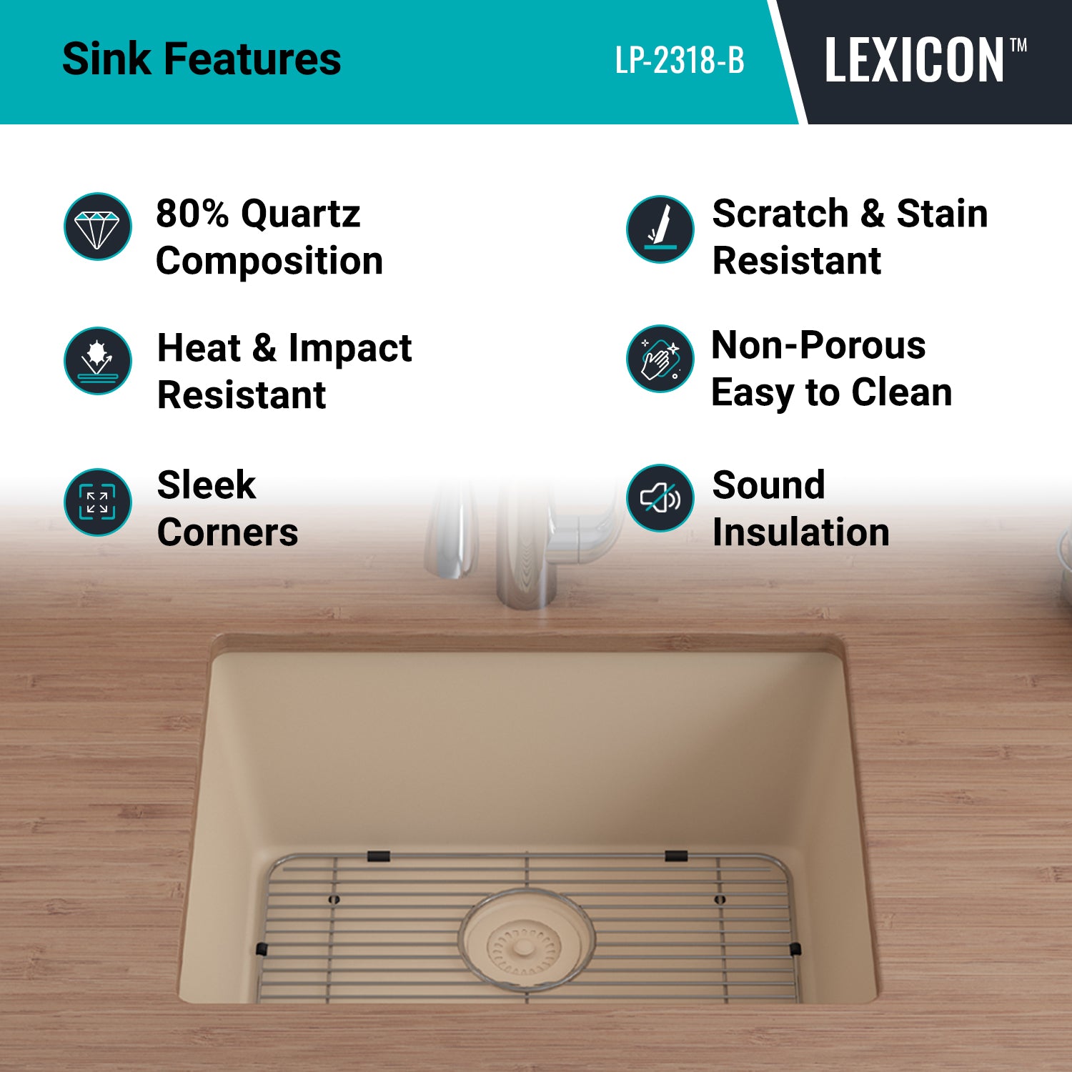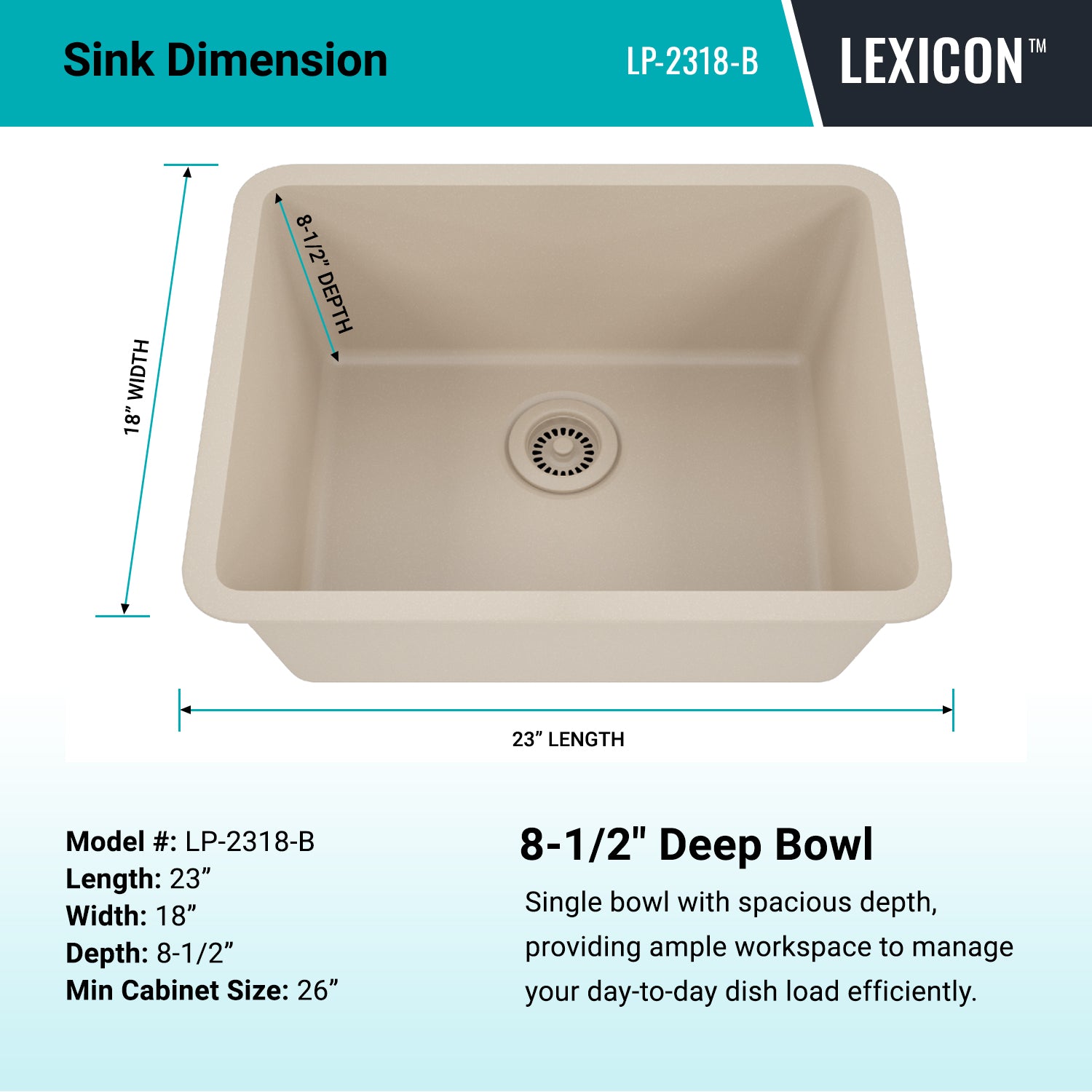 Elevate your Kitchen with the unmatched quality of the LEXICON™ Platinum Quartz Medium Single Bowl Kitchen Sink. The LP-2318 Beige epitomizes contemporary design and unparalleled convenience, includes meticulously crafted matching drain and bottom grid. Experience the luxury of a deep 8-1/2 inch bowl with rear positioned drain for optimal under-counter space utilization, and flawlessly smooth corner radiuses for effortless maintenance and care.