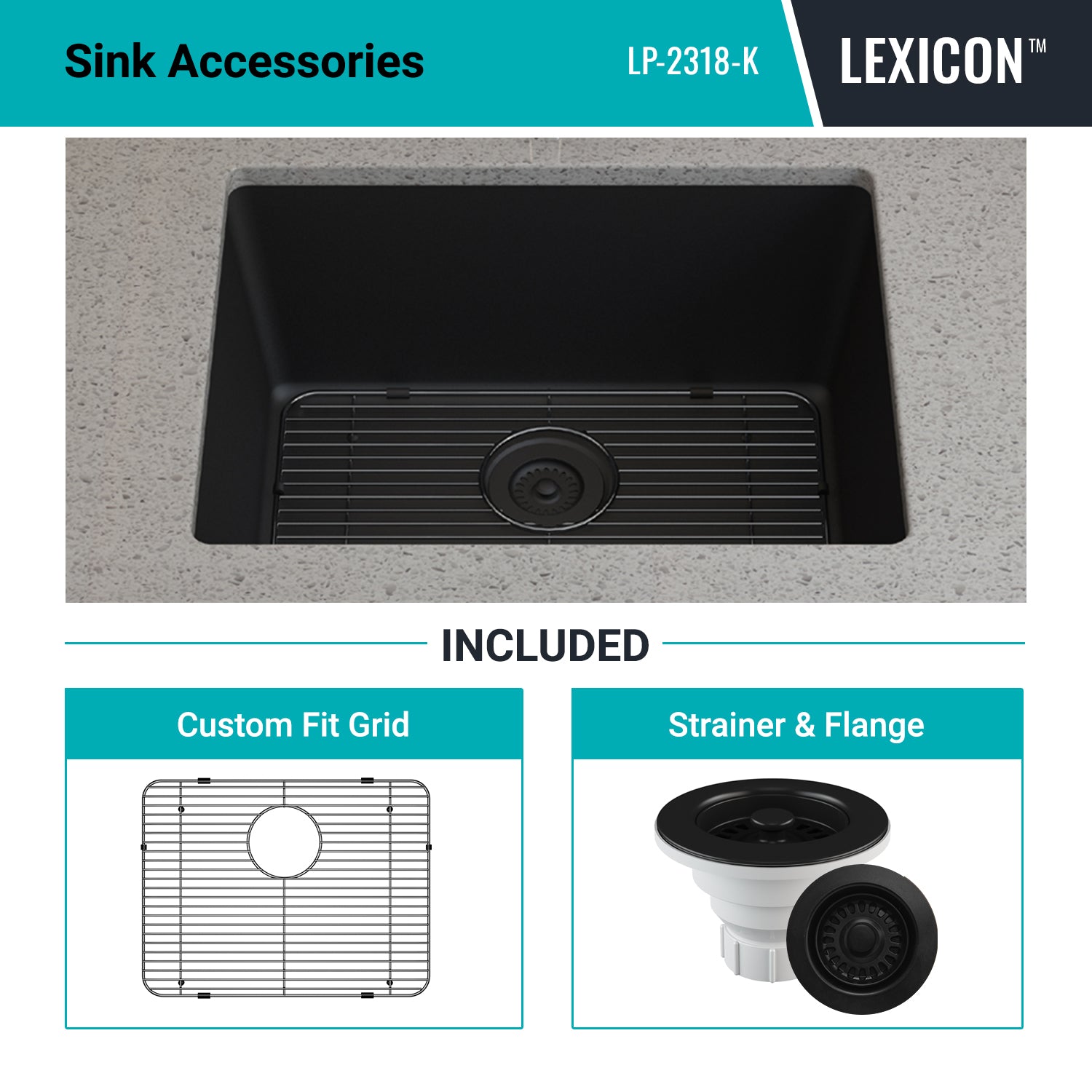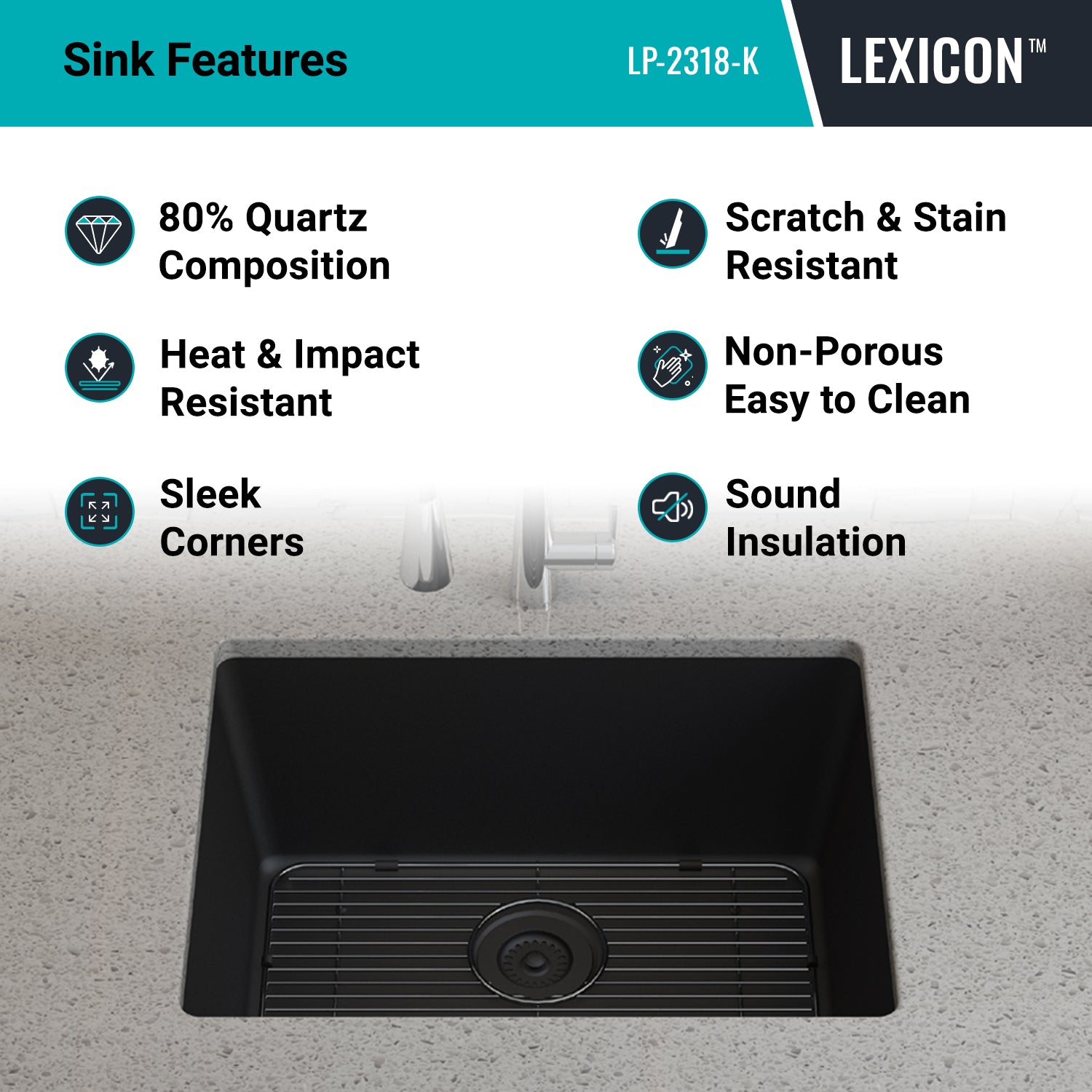 Elevate your Kitchen with the unmatched quality of the LEXICON™ Platinum Quartz Medium Single Bowl Kitchen Sink. The LP-2318 Metallic Black epitomizes contemporary design and unparalleled convenience, includes meticulously crafted matching drain and bottom grid. Experience the luxury of a deep 8-1/2 inch bowl with rear positioned drain for optimal under-counter space utilization, and flawlessly smooth corner radiuses for effortless maintenance and care.