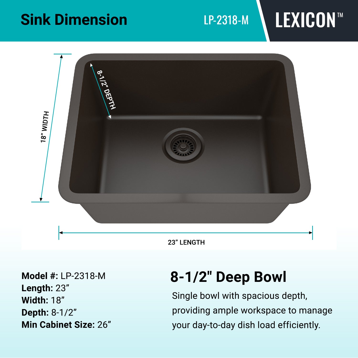 Elevate your Kitchen with the unmatched quality of the LEXICON™ Platinum Quartz Medium Single Bowl Kitchen Sink. The LP-2318 Mocha epitomizes contemporary design and unparalleled convenience, includes meticulously crafted matching drain and bottom grid. Experience the luxury of a deep 8-1/2 inch bowl with rear positioned drain for optimal under-counter space utilization, and flawlessly smooth corner radiuses for effortless maintenance and care.