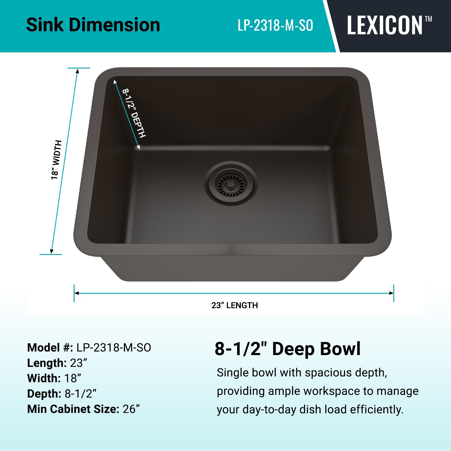 Elevate your kitchen with the unmatched quality of the Lexicon Platinum Quartz Single Bowl Kitchen Sink. The LP-2318 Mocha epitomizes contemporary design and unparalleled convenience. Experience the luxury of a deep 8-1/2-inch bowl with rear positioned drain for optimal under-counter space utilization, and flawlessly smooth corner radiuses for effortless maintenance and care.