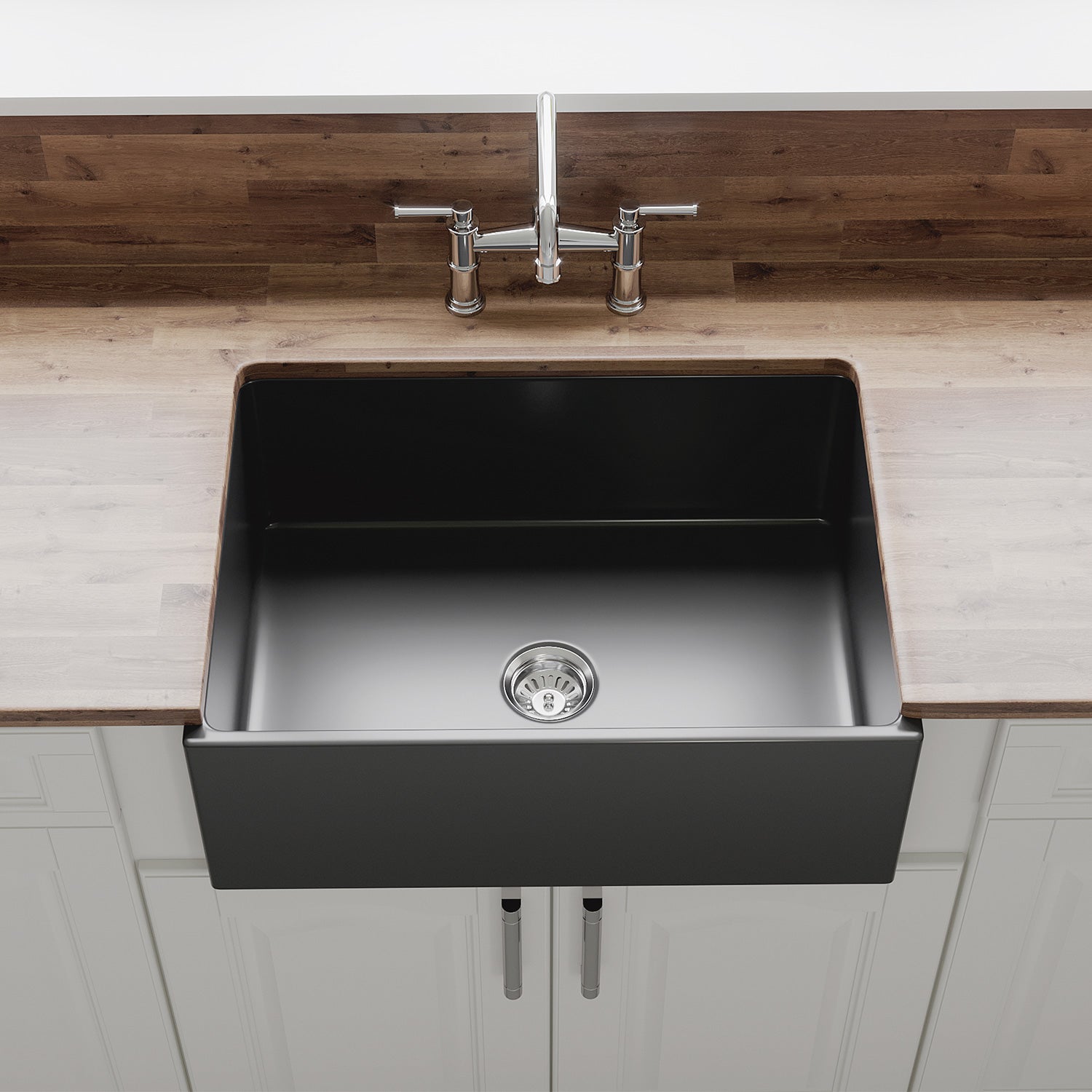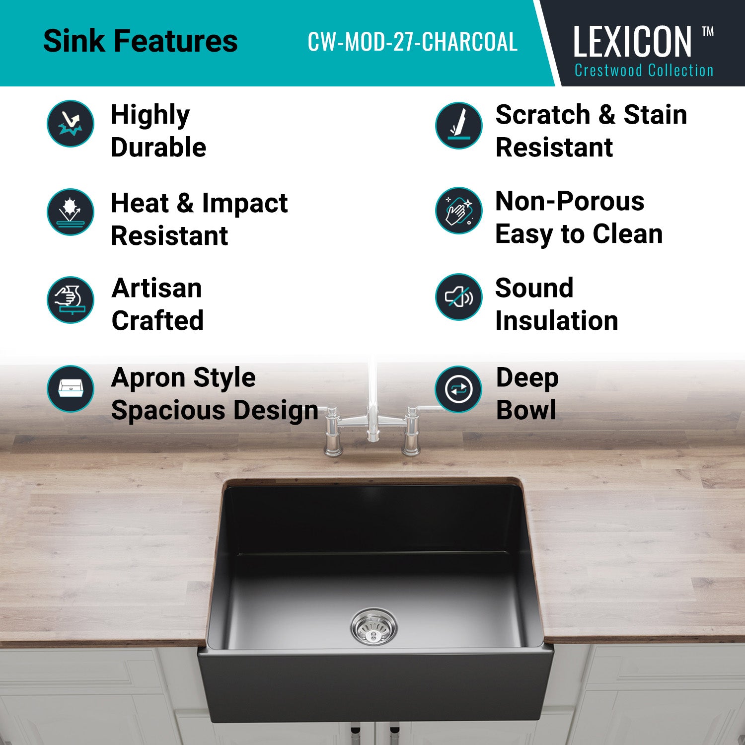 The 27-Inch Crestwood™ Gloss Charcoal Fireclay Kitchen Sink Single Bowl Basin is expertly crafted using time-honored techniques, offering a highly durable and modern stylish addition to your kitchen. Made from natural fireclay and fired at 1500°F, this sink boasts exceptional strength and is designed to withstand impact. The glossy charcoal surface resists chips, scratches, and abrasions, ensuring lasting beauty and functionality.