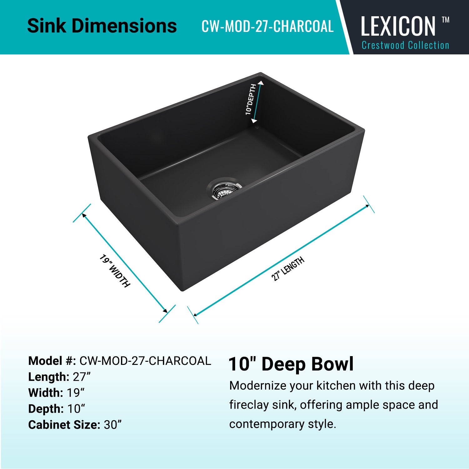 27-Inch Crestwood™ Gloss Charcoal Fireclay Kitchen Sink Modern Farmhouse Flat Apron-Front Single Bowl Basin, CW-MOD-27