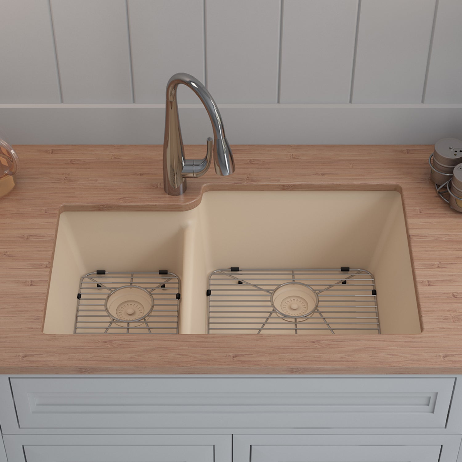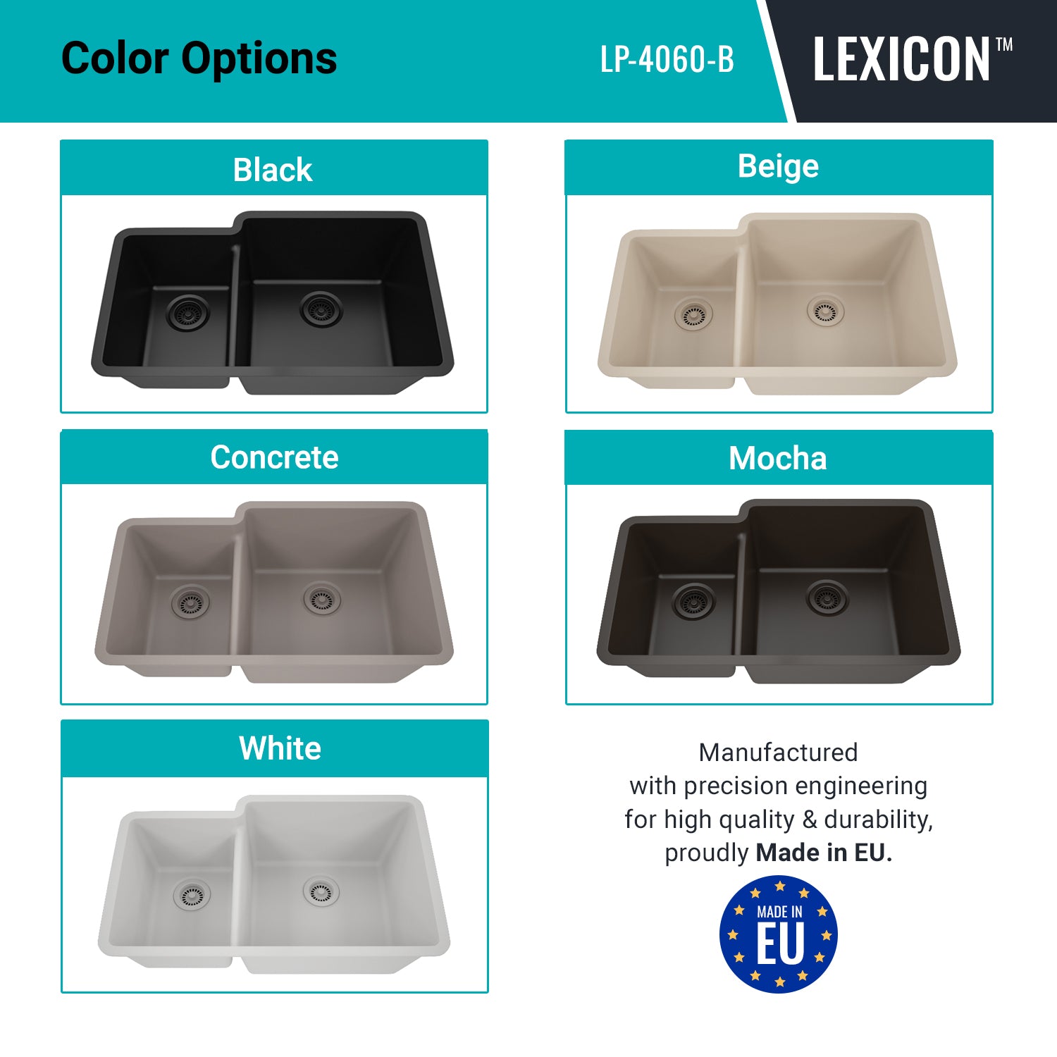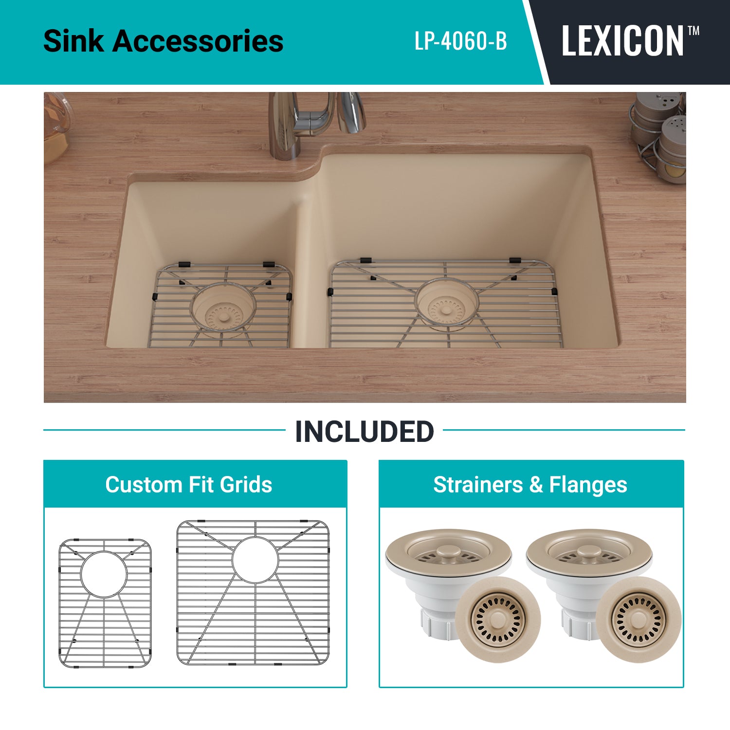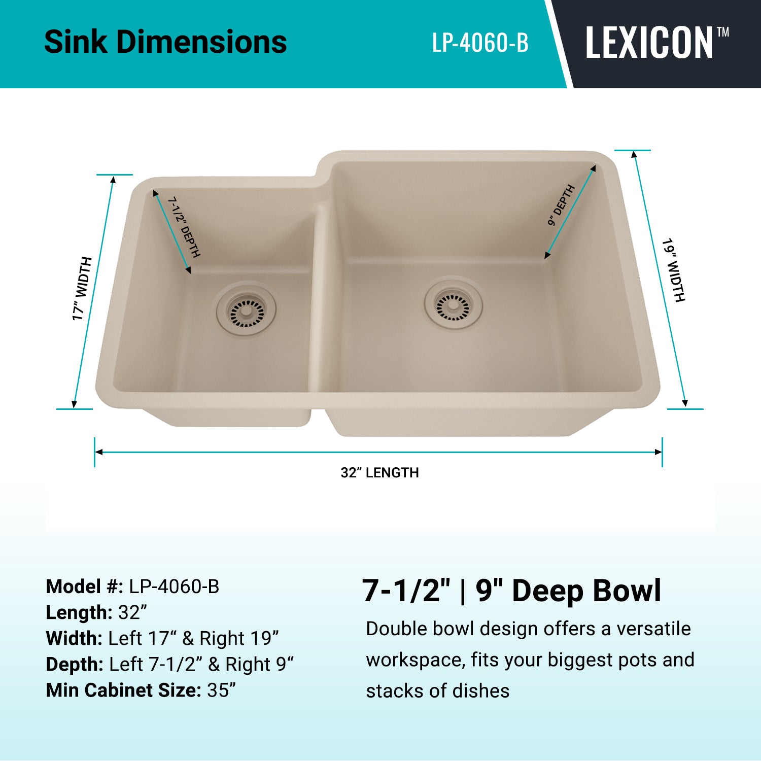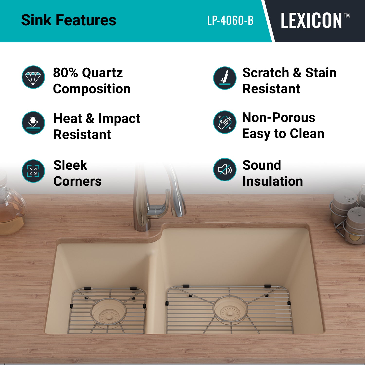 Elevate your Kitchen with the unmatched quality of the LEXICON™ Platinum Quartz Offset Double Bowl Kitchen Sink. The LP-4060 Beige epitomizes contemporary design and unparalleled convenience, includes meticulously crafted matching drain and bottom grid. Experience the luxury of a deep 9 inch and 7-1/2 inch offset double bowls with rear positioned drain for optimal under-counter space utilization, and flawlessly smooth corner radiuses for effortless maintenance and care.