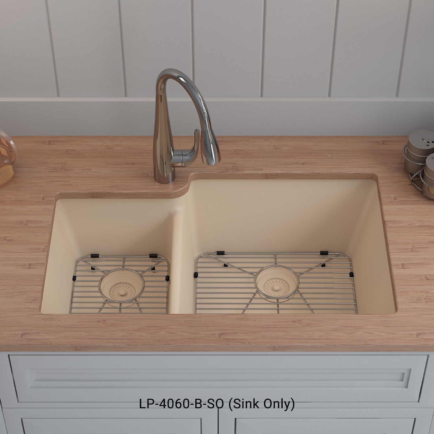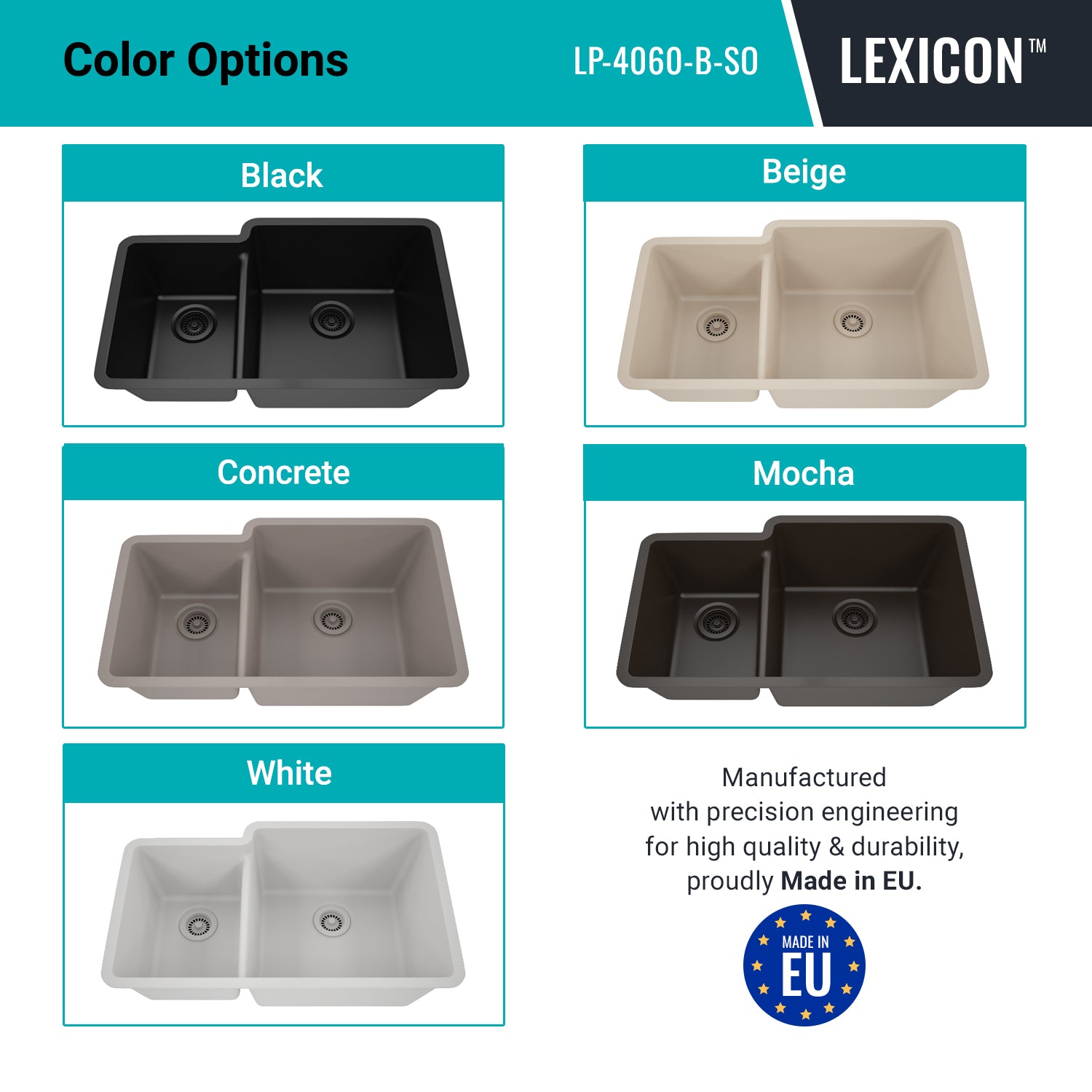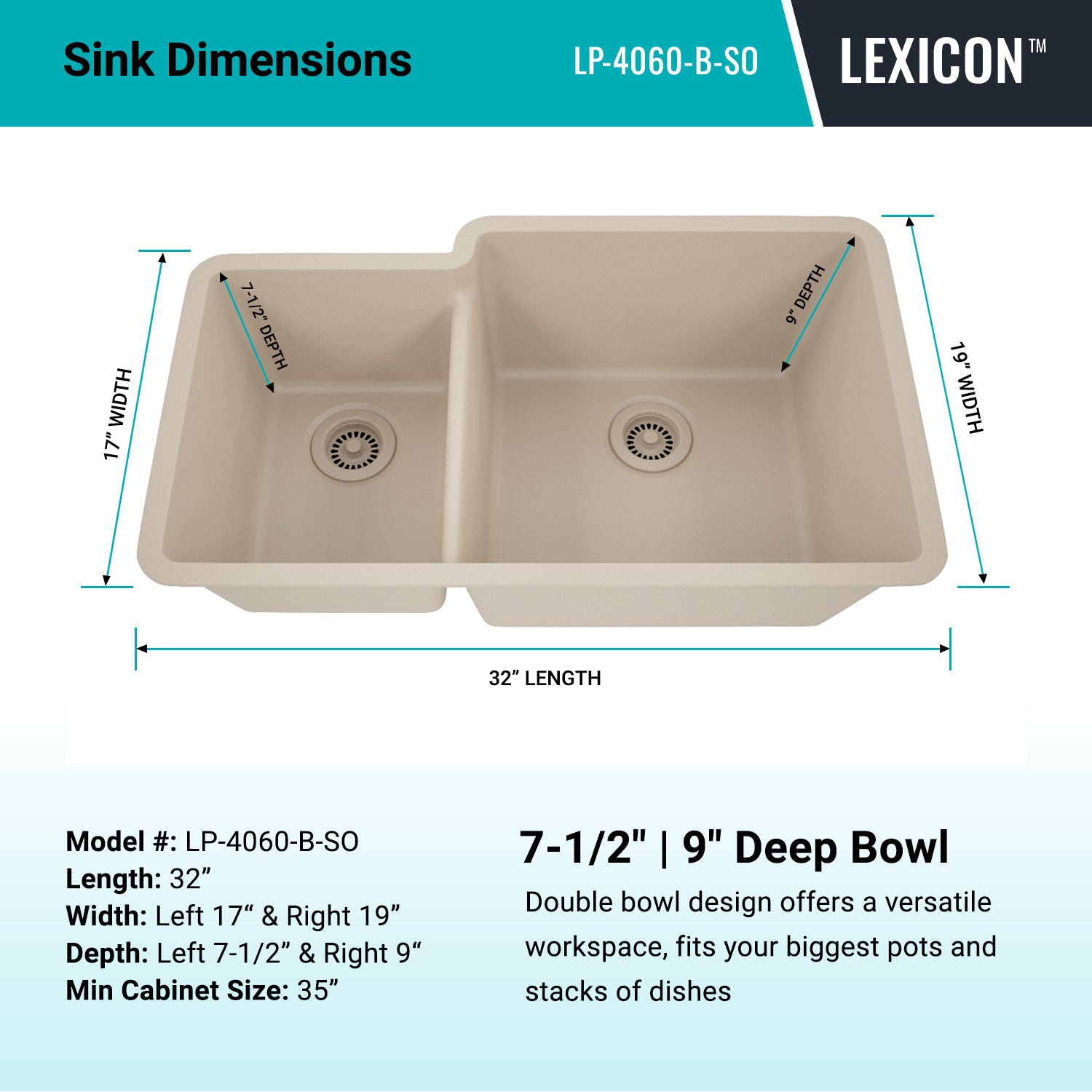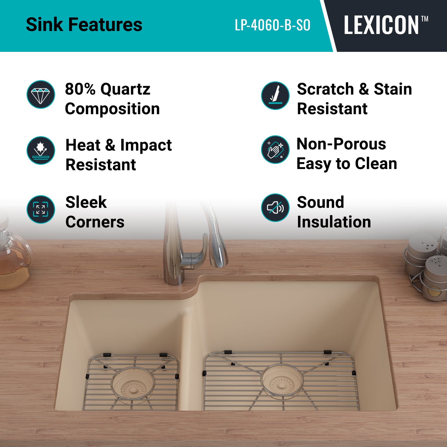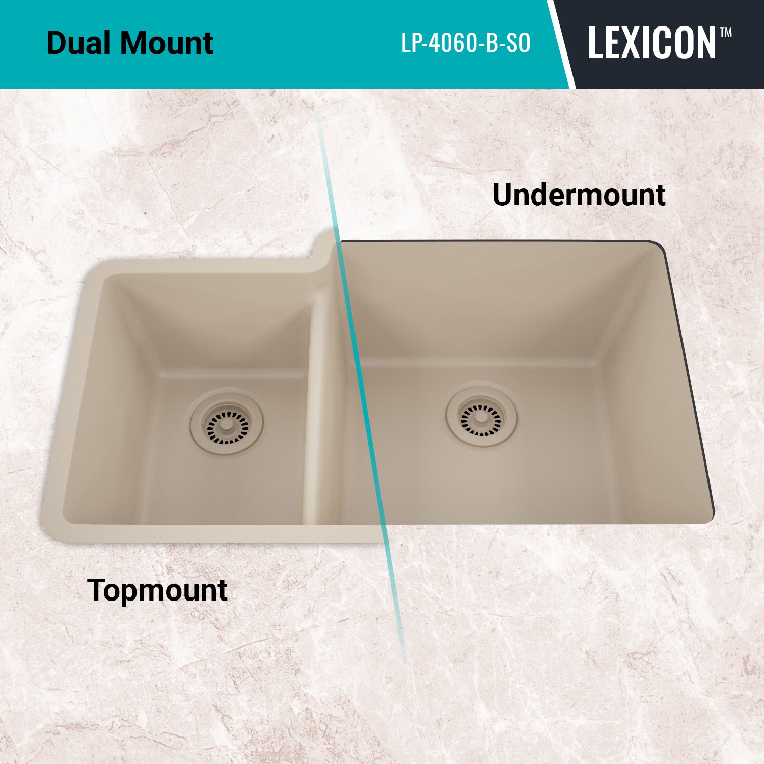 Elevate your kitchen with the unmatched quality of the Lexicon Platinum Quartz Offset Double Bowl Kitchen Sink. The LP-4060 Beige epitomizes contemporary design and unparalleled convenience. Experience the luxury of a deep 9 inch and 7-1/2 inch offset double bowl with rear positioned drain for optimal under-counter space utilization, and flawlessly smooth corner radiuses for effortless maintenance and care.