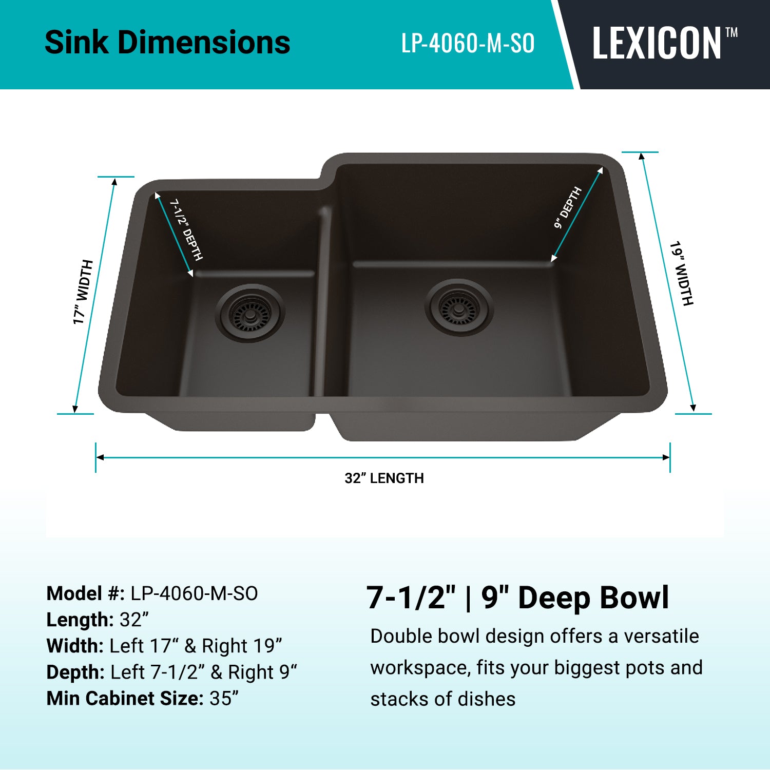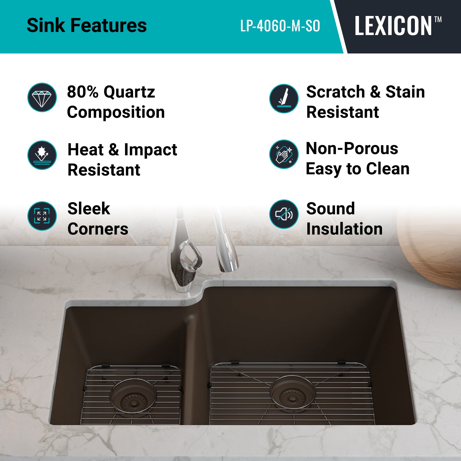 Elevate your kitchen with the unmatched quality of the Lexicon Platinum Quartz Offset Double Bowl Kitchen Sink. The LP-4060 Mocha epitomizes contemporary design and unparalleled convenience. Experience the luxury of a deep 9 inch and 7-1/2 inch offset double bowl with rear positioned drain for optimal under-counter space utilization, and flawlessly smooth corner radiuses for effortless maintenance and care.