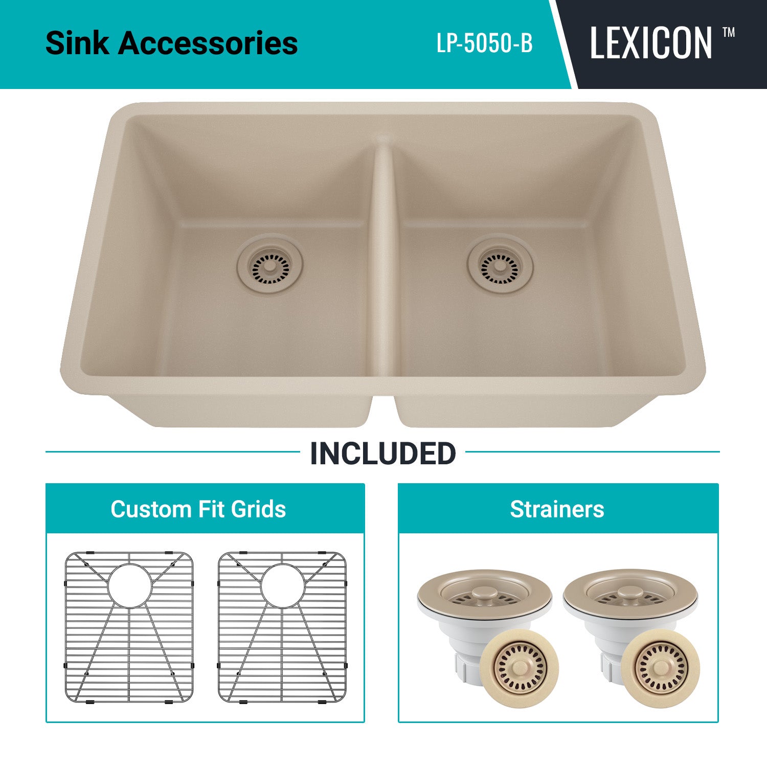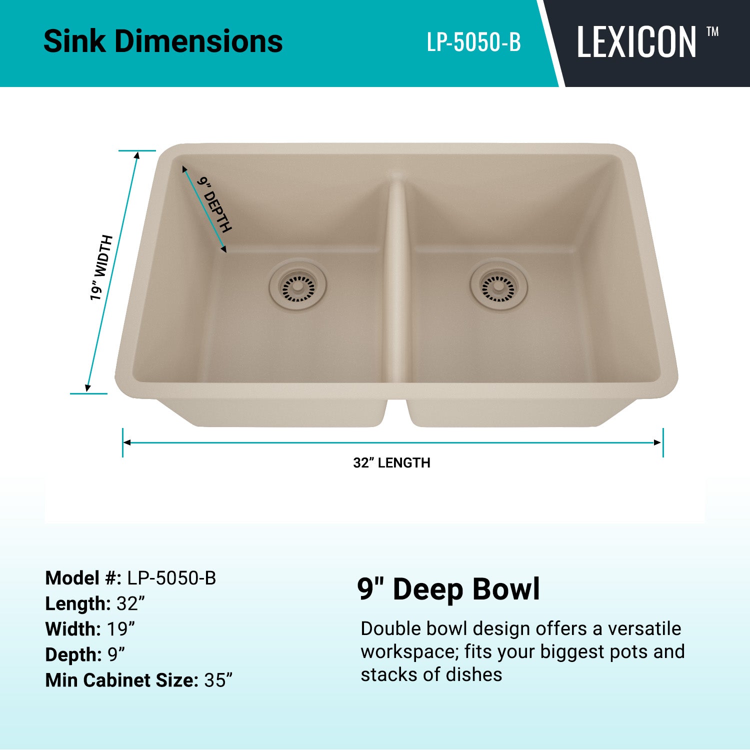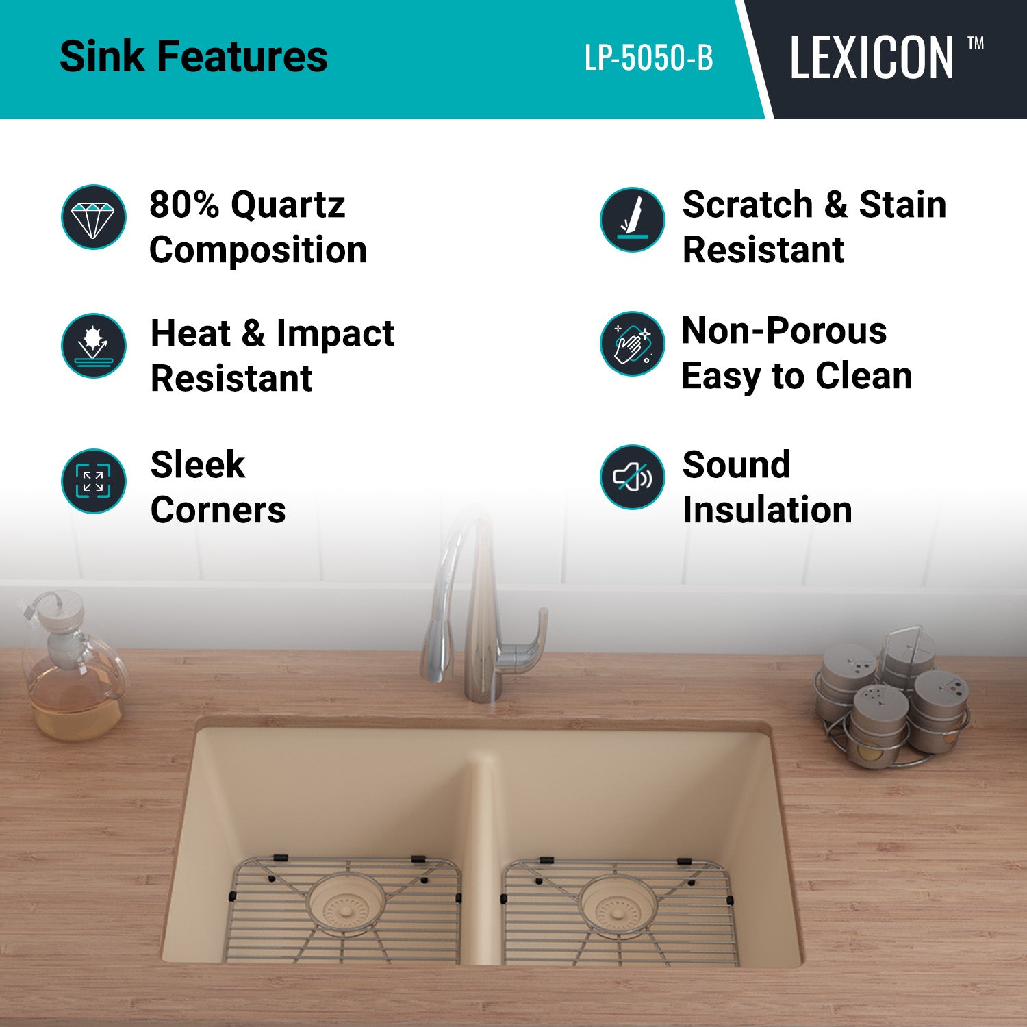 Elevate your Kitchen with the unmatched quality of the LEXICON™ Platinum Quartz Offset Double Bowl Kitchen Sink. The LP-5050 Beige contemporary design and unparalleled convenience, includes meticulously crafted matching drain and bottom grid. Experience the luxury of a deep 9 inch offset double bowls with rear positioned drain for optimal under-counter space utilization, and flawlessly smooth corner radiuses for effortless maintenance and care.