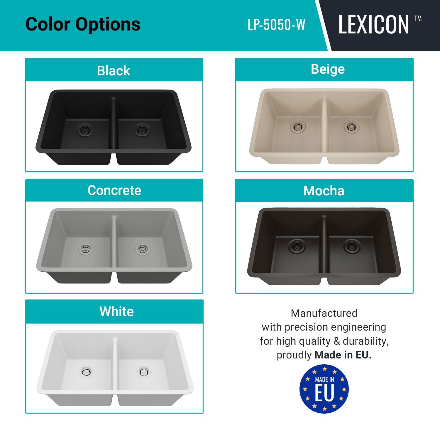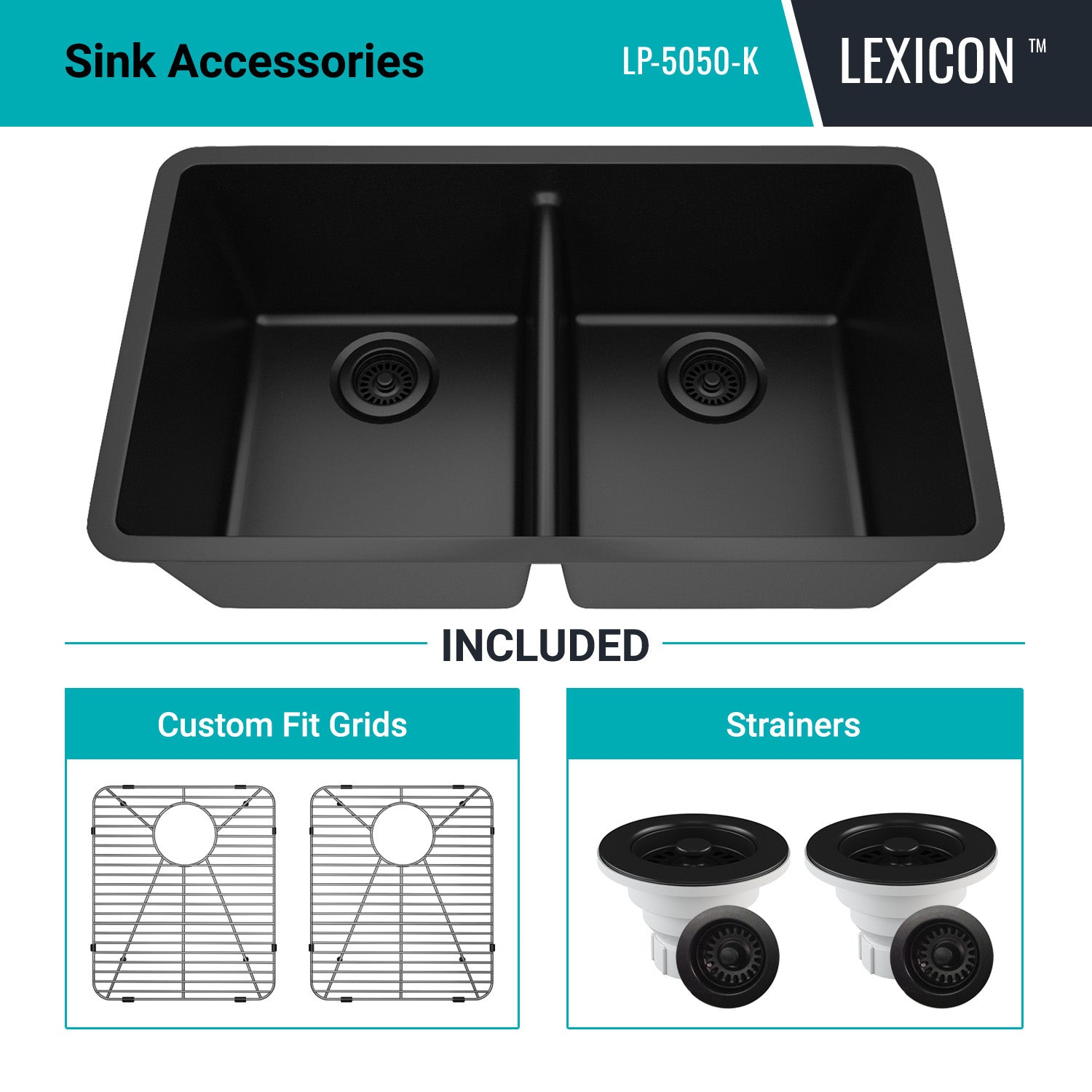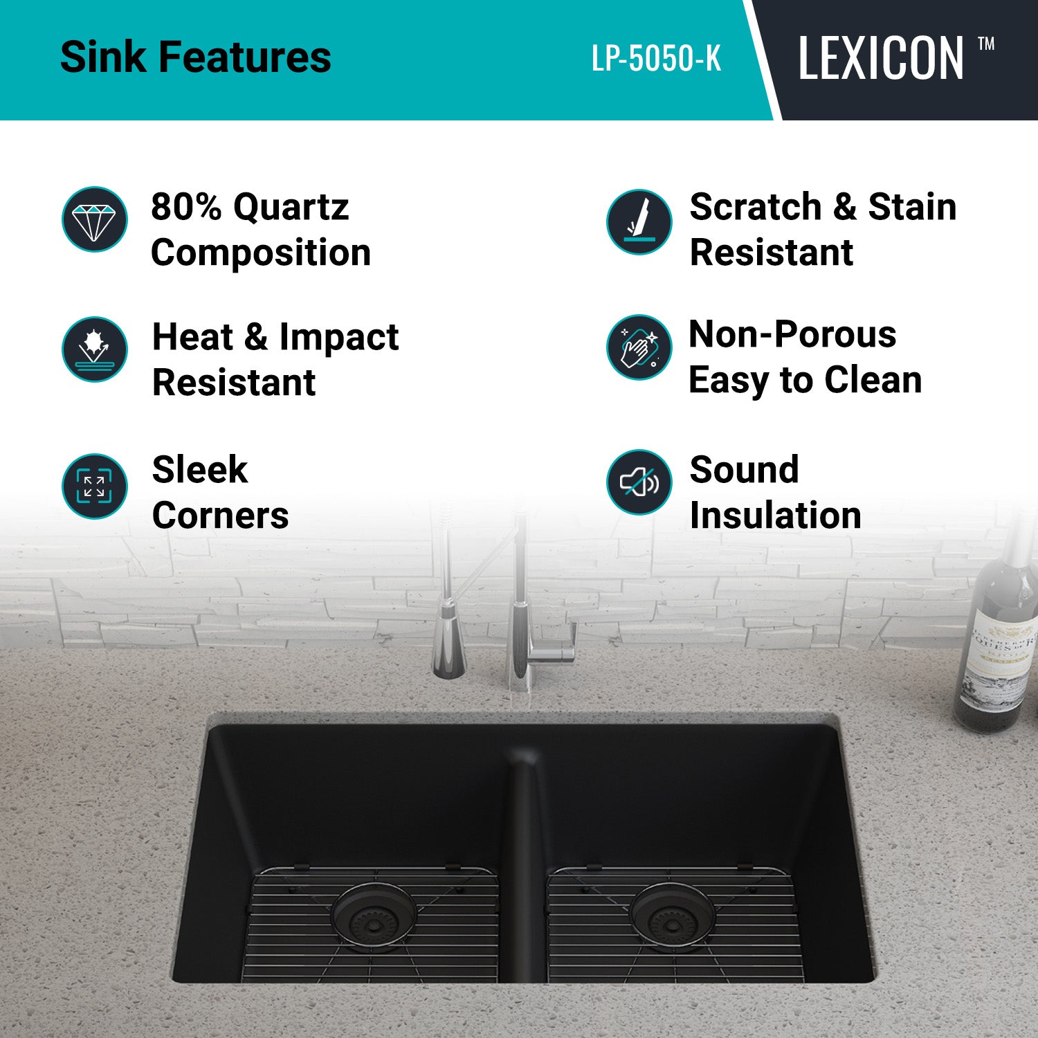 Elevate your Kitchen with the unmatched quality of the LEXICON™ Platinum Quartz Offset Double Bowl Kitchen Sink. The LP-5050 Metallic Black contemporary design and unparalleled convenience, includes meticulously crafted matching drain and bottom grid. Experience the luxury of a deep 9 inch offset double bowls with rear positioned drain for optimal under-counter space utilization, and flawlessly smooth corner radiuses for effortless maintenance and care.