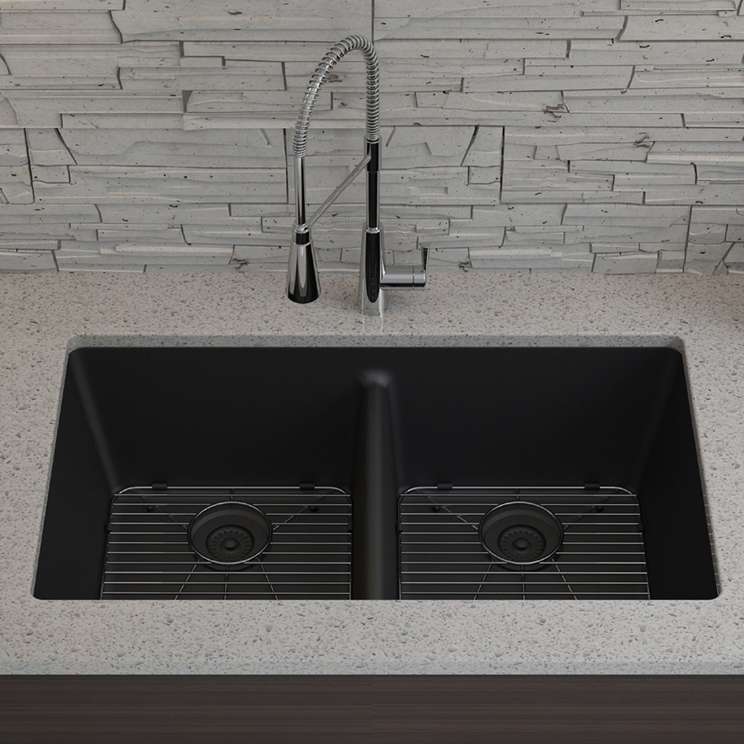 32-Inch Platinum Quartz Composite Drop-in Undermount 50/50 Double Bowl Galaxy Black Kitchen Sink includes Accessories LP-5050-K