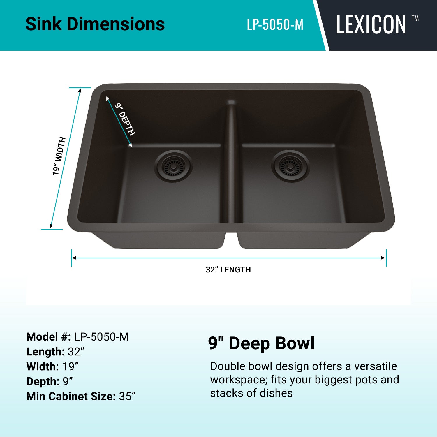 Elevate your Kitchen with the unmatched quality of the LEXICON™ Platinum Quartz Offset Double Bowl Kitchen Sink. The LP-5050 Mocha contemporary design and unparalleled convenience, includes meticulously crafted matching drain and bottom grid. Experience the luxury of a deep 9 inch offset double bowls with rear positioned drain for optimal under-counter space utilization, and flawlessly smooth corner radiuses for effortless maintenance and care.