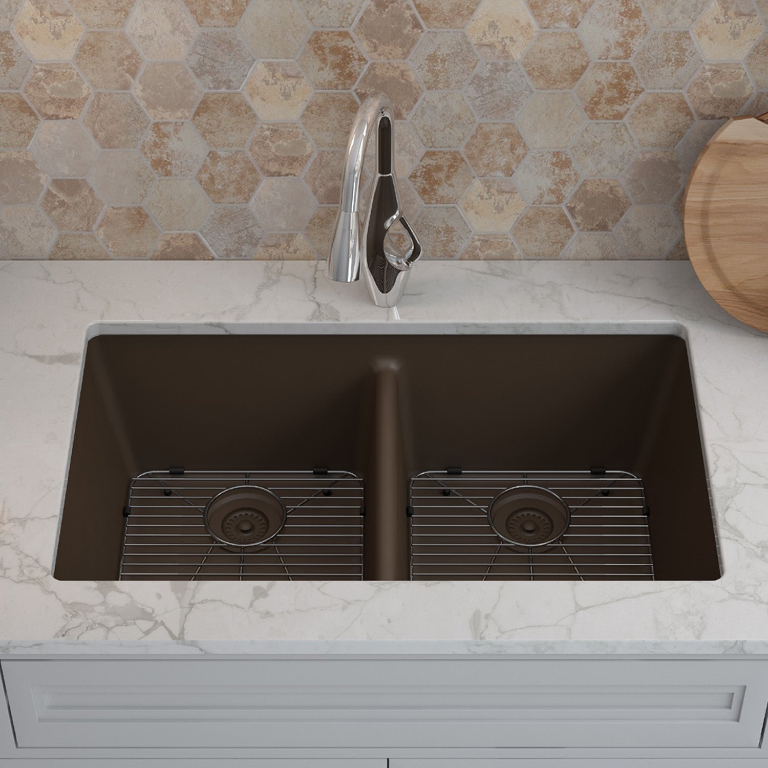 32-Inch Platinum Quartz Composite Drop-in Undermount 50/50 Double Bowl Galaxy Mocha Kitchen Sink includes Accessories LP-5050-M