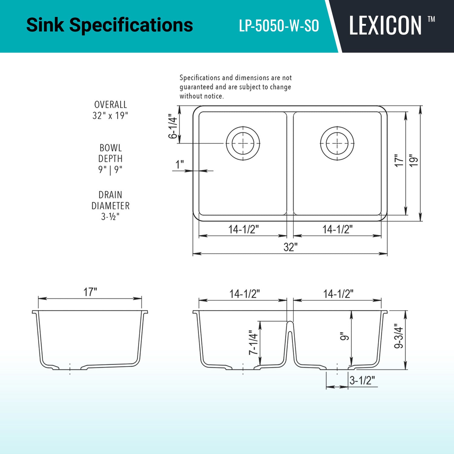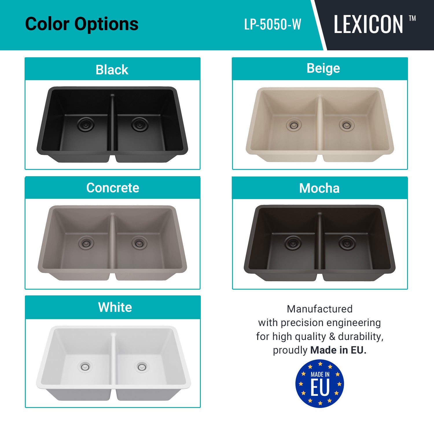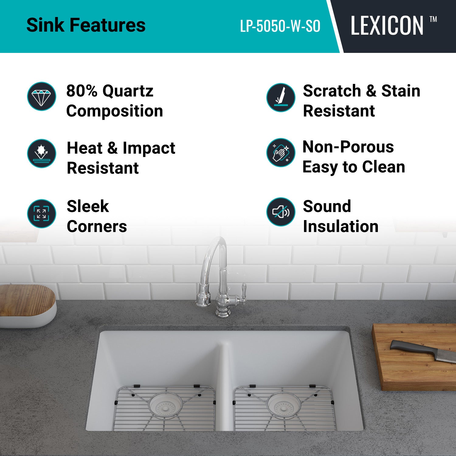 Elevate your kitchen with the unmatched quality of the Lexicon Platinum Quartz Equal Double Bowl Kitchen Sink. The LP-5050 White epitomizes contemporary design and unparalleled convenience. Experience the luxury of a deep 9 inch double bowl with rear positioned drain for optimal under-counter space utilization, and flawlessly smooth corner radiuses for effortless maintenance and care.