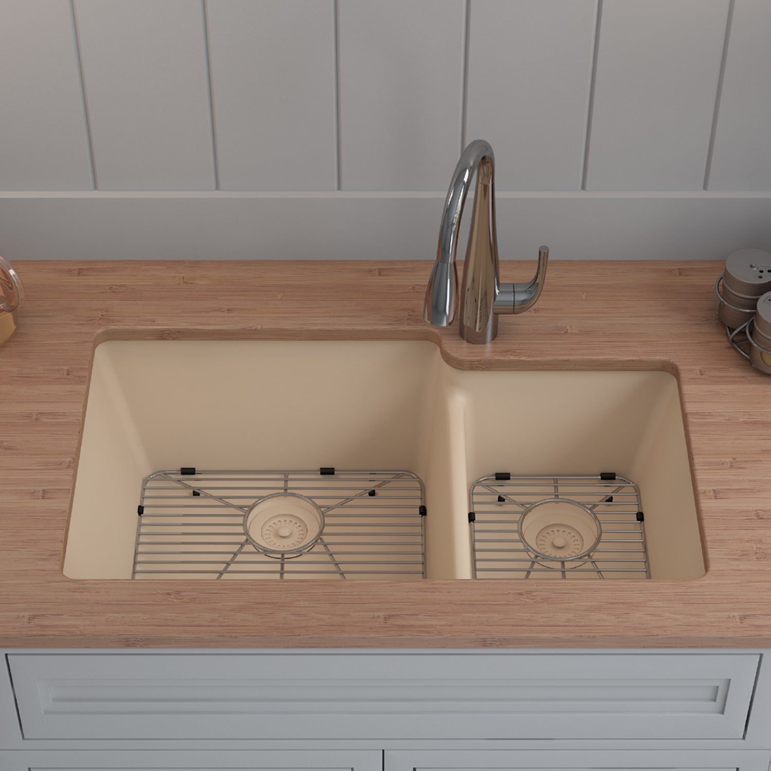 Elevate your Kitchen with the unmatched quality of the LEXICON™ Platinum Quartz Offset Double Bowl Kitchen Sink. The LP-6040 Beige epitomizes contemporary design and unparalleled convenience, includes meticulously crafted matching drain and bottom grid. Experience the luxury of a deep 9 inch and 7-1/2 inch offset double bowls with rear positioned drain for optimal under-counter space utilization, and flawlessly smooth corner radiuses for effortless maintenance and care.