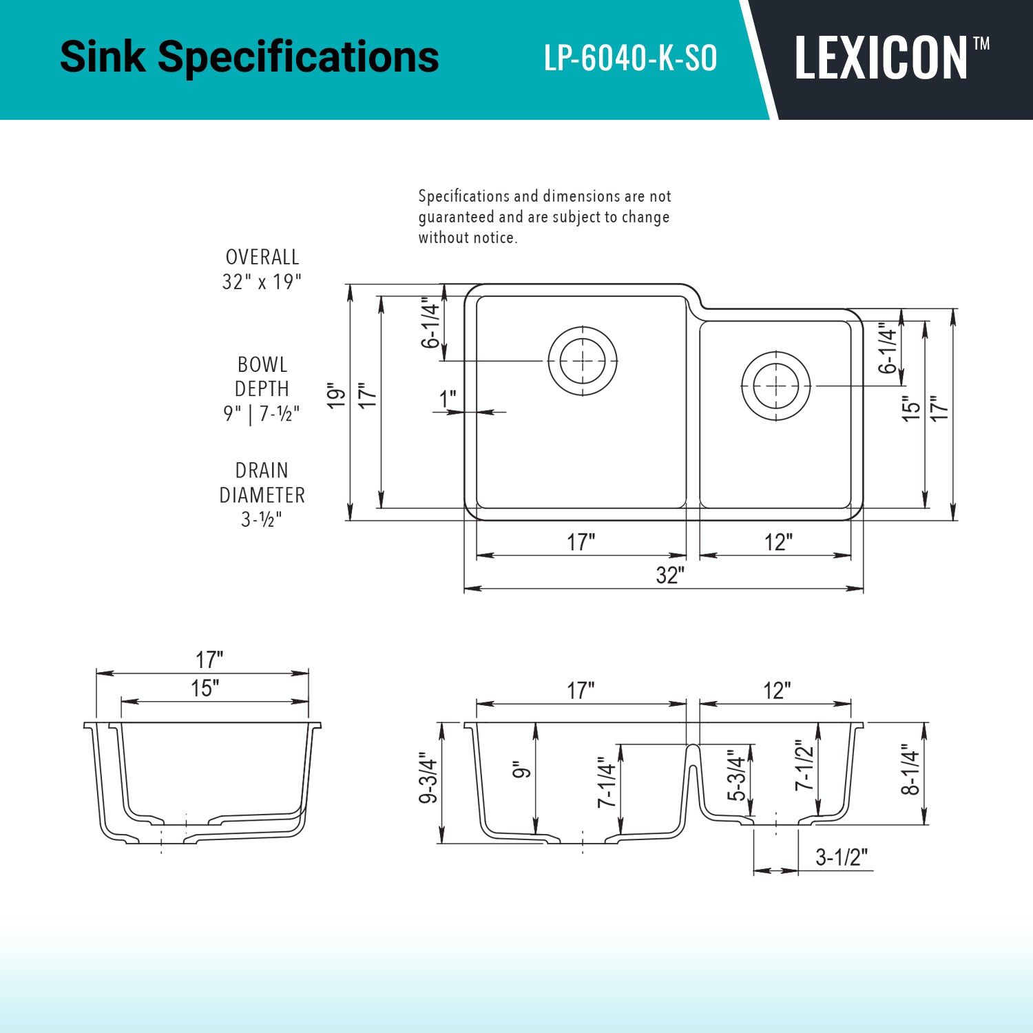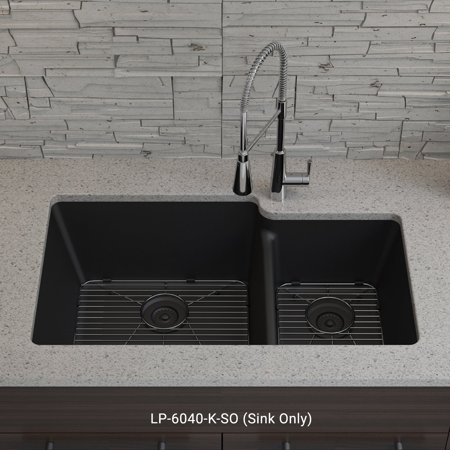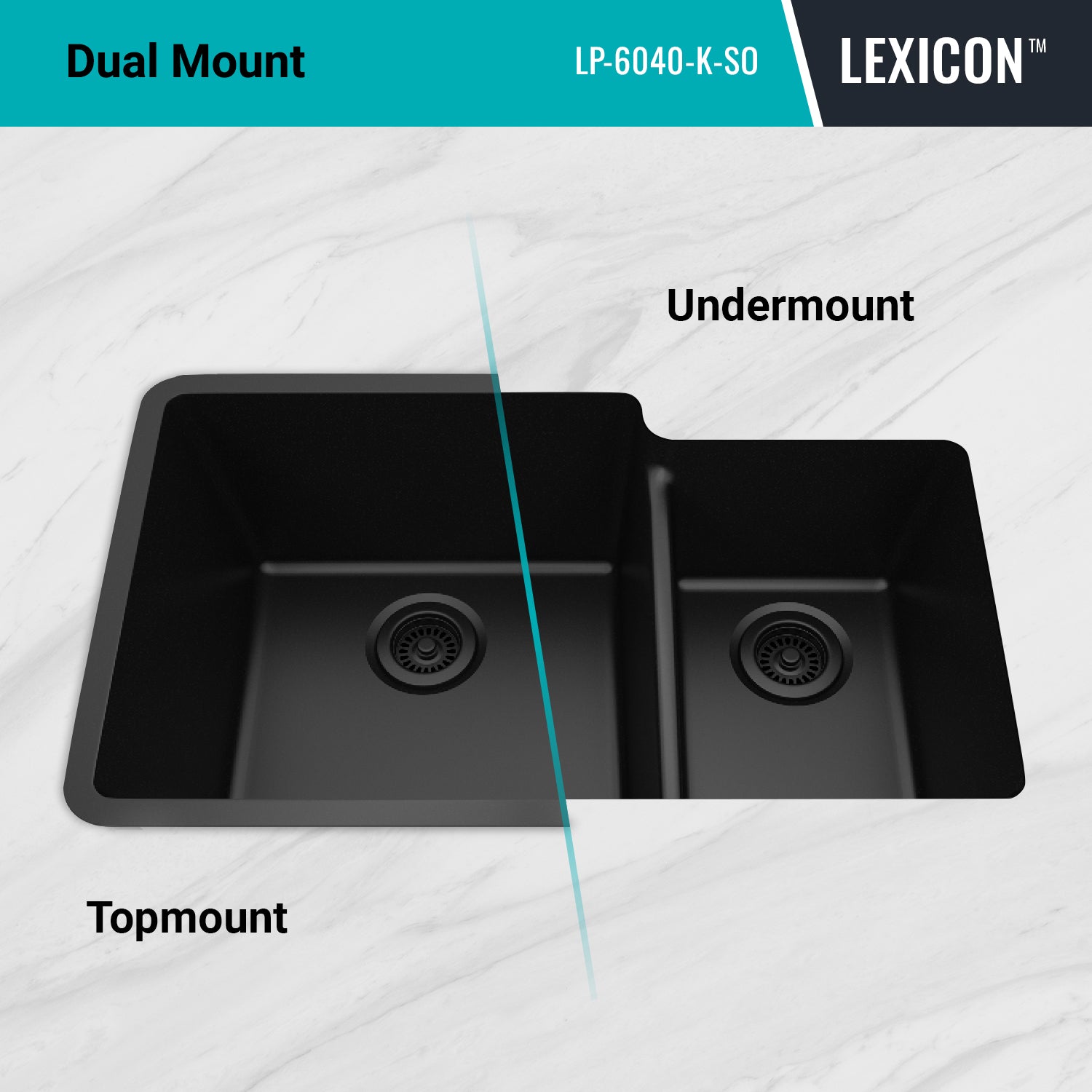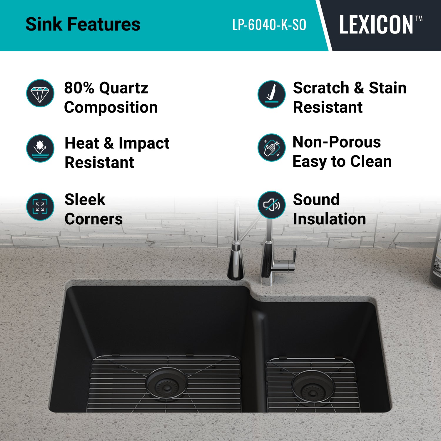 Elevate your kitchen with the unmatched quality of the Lexicon Platinum Quartz Offset Double Bowl Kitchen Sink. The LP-6040 Black epitomizes contemporary design and unparalleled convenience. Experience the luxury of a deep 9 inch and 7-1/2 inch offset double bowl with rear positioned drain for optimal under-counter space utilization, and flawlessly smooth corner radiuses for effortless maintenance and care.