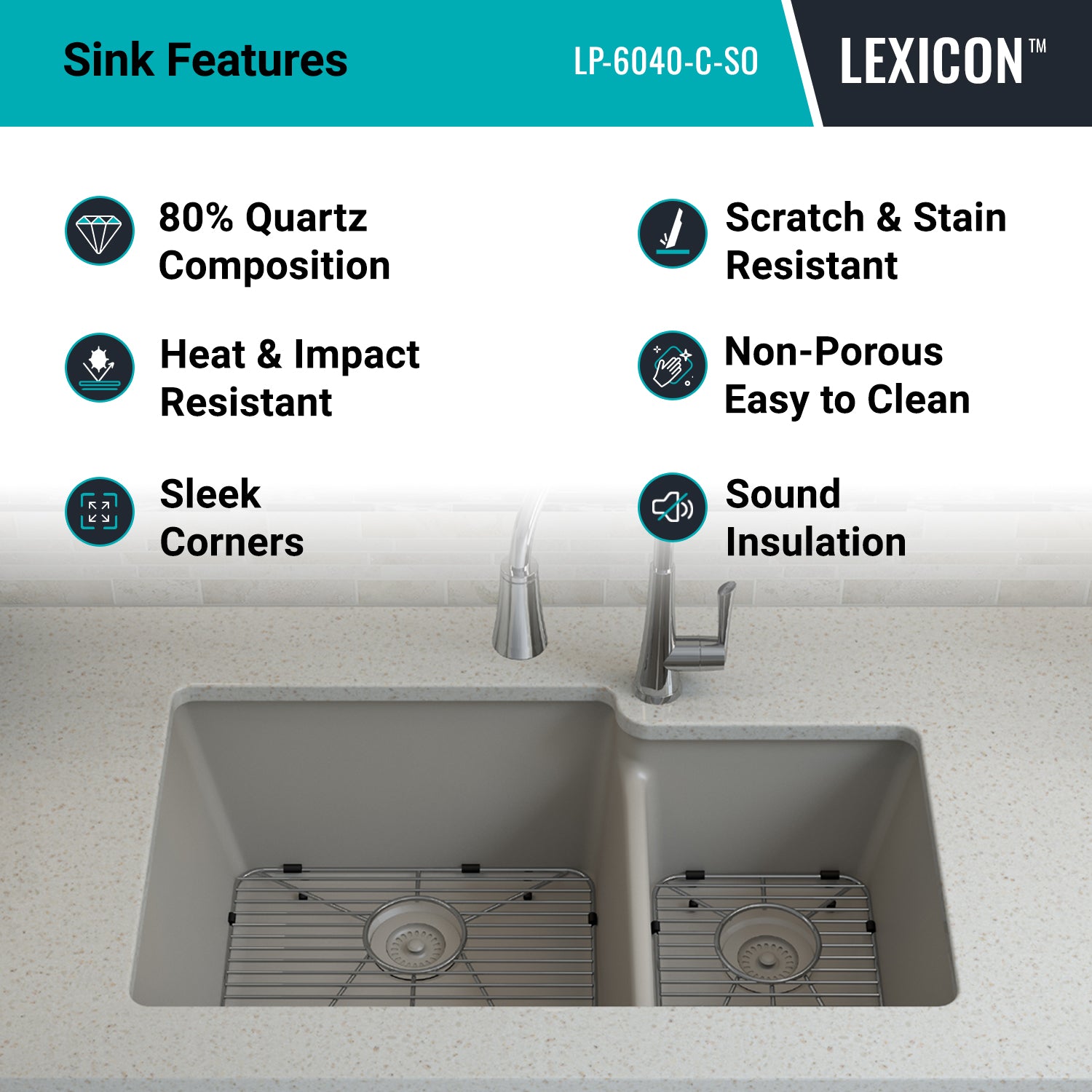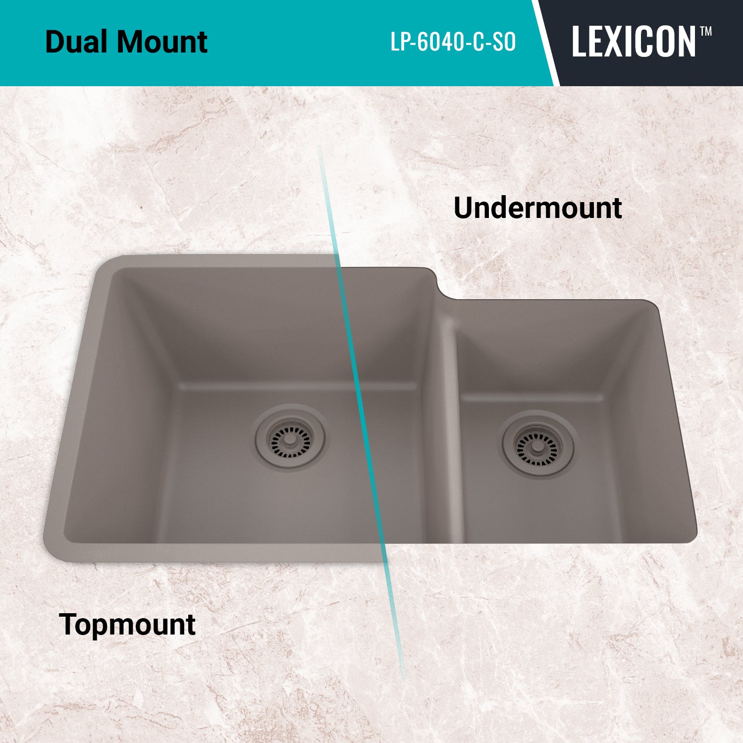 Elevate your kitchen with the unmatched quality of the Lexicon Platinum Quartz Offset Double Bowl Kitchen Sink. The LP-6040 Concrete epitomizes contemporary design and unparalleled convenience. Experience the luxury of a deep 9 inch and 7-1/2 inch offset double bowl with rear positioned drain for optimal under-counter space utilization, and flawlessly smooth corner radiuses for effortless maintenance and care.