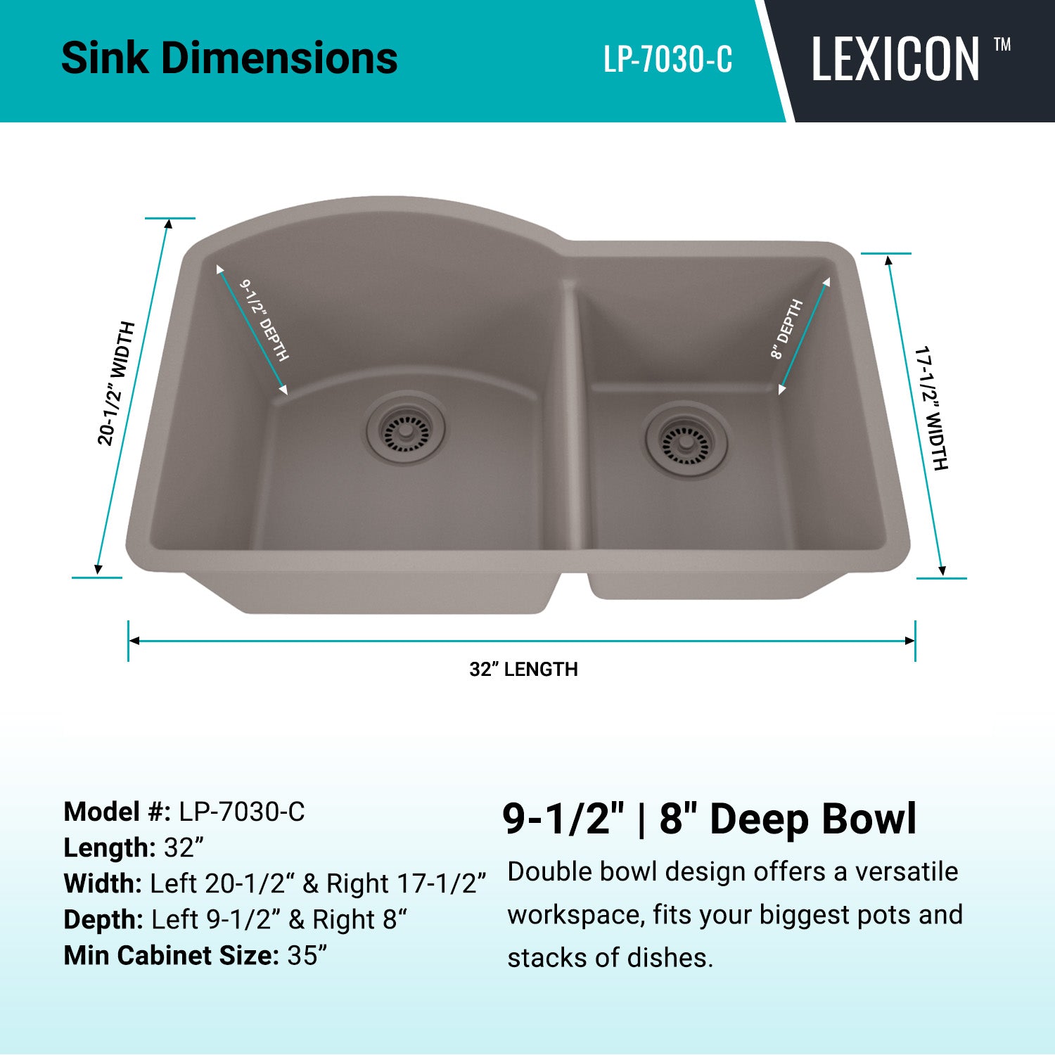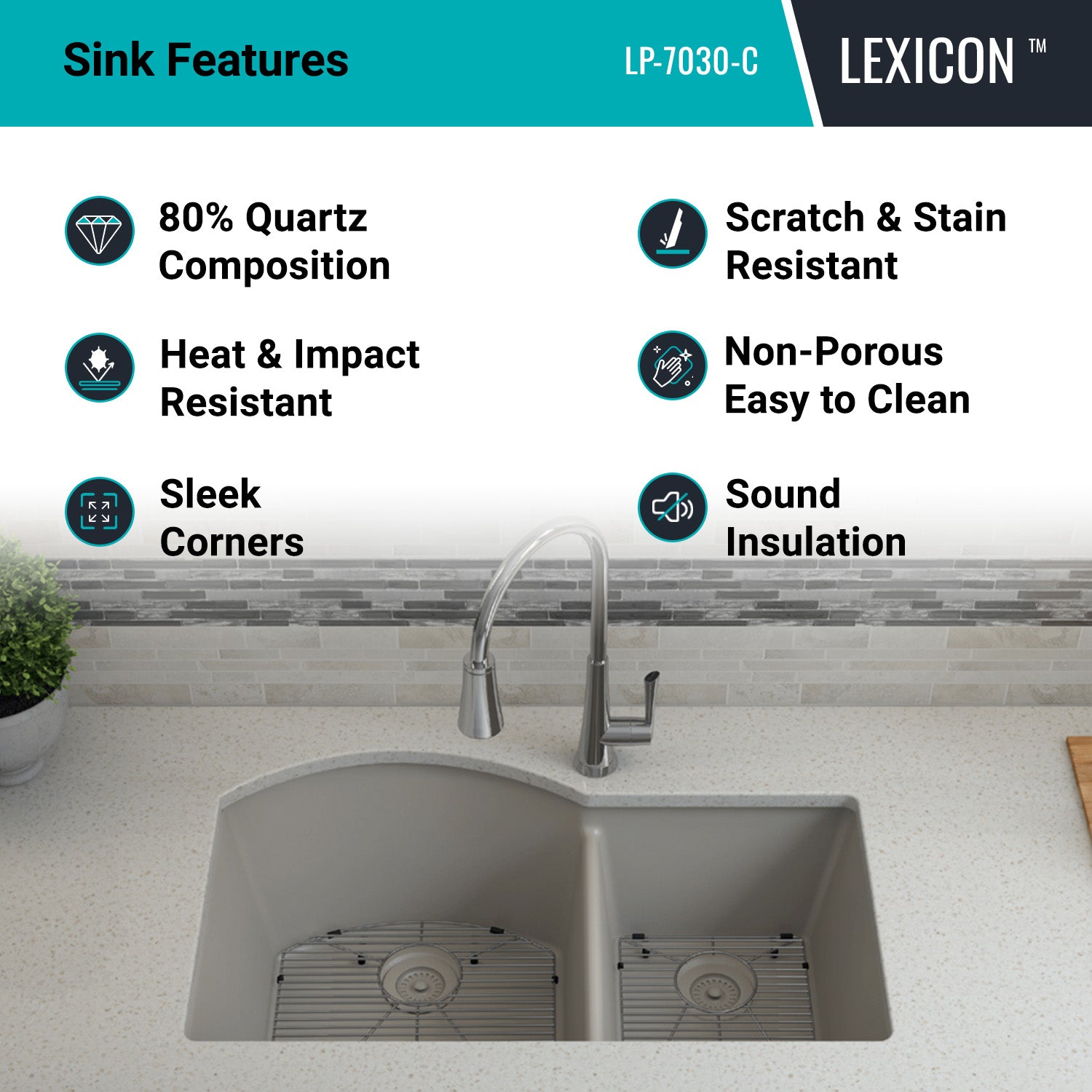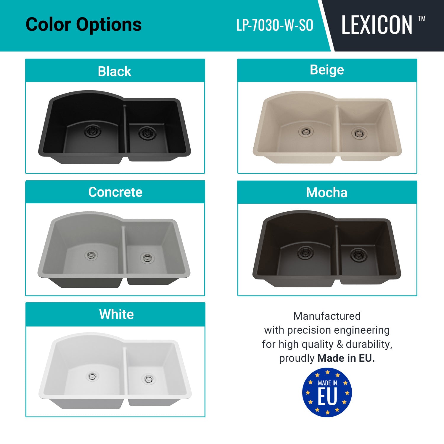 Elevate your Kitchen with the unmatched quality of the LEXICON™ Platinum Quartz Offset Double Bowl Kitchen Sink. The LP-7030 Concrete epitomizes contemporary design and unparalleled convenience, includes meticulously crafted matching drain and bottom grid. Experience the luxury of a deep 9-1/2 inch left bowl and 8 inch right bowl offset double bowls with rear positioned drain for optimal under-counter space utilization, and flawlessly smooth corner radiuses for effortless maintenance and care.