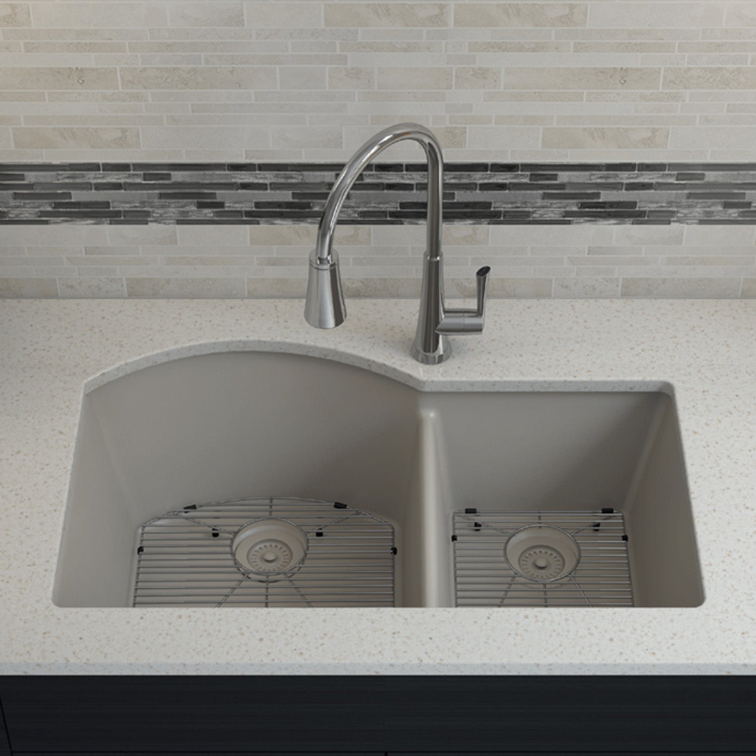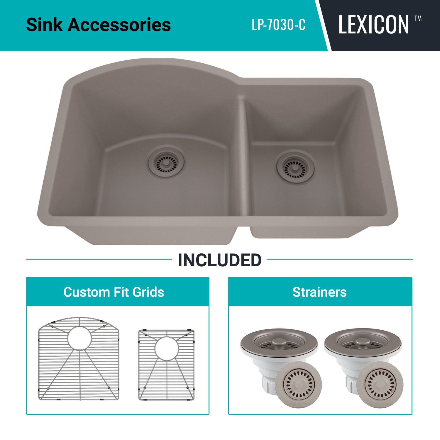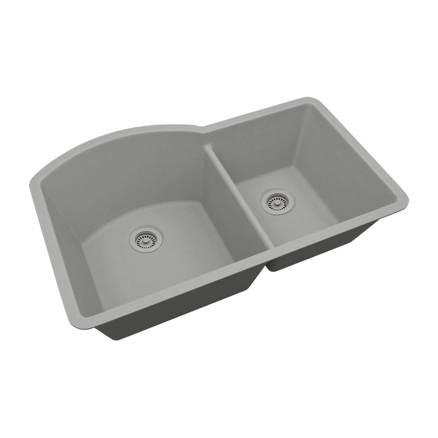 Elevate your Kitchen with the unmatched quality of the LEXICON™ Platinum Quartz Offset Double Bowl Kitchen Sink. The LP-7030 Concrete epitomizes contemporary design and unparalleled convenience, includes meticulously crafted matching drain and bottom grid. Experience the luxury of a deep 9-1/2 inch left bowl and 8 inch right bowl offset double bowls with rear positioned drain for optimal under-counter space utilization, and flawlessly smooth corner radiuses for effortless maintenance and care.
