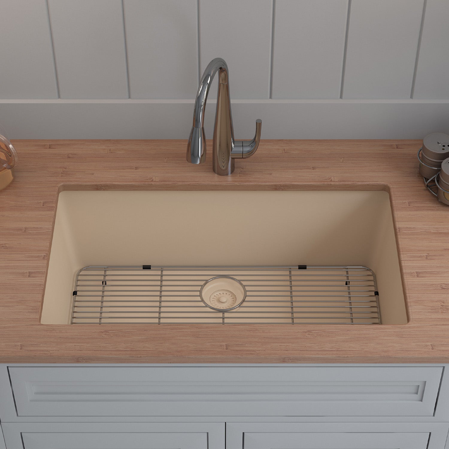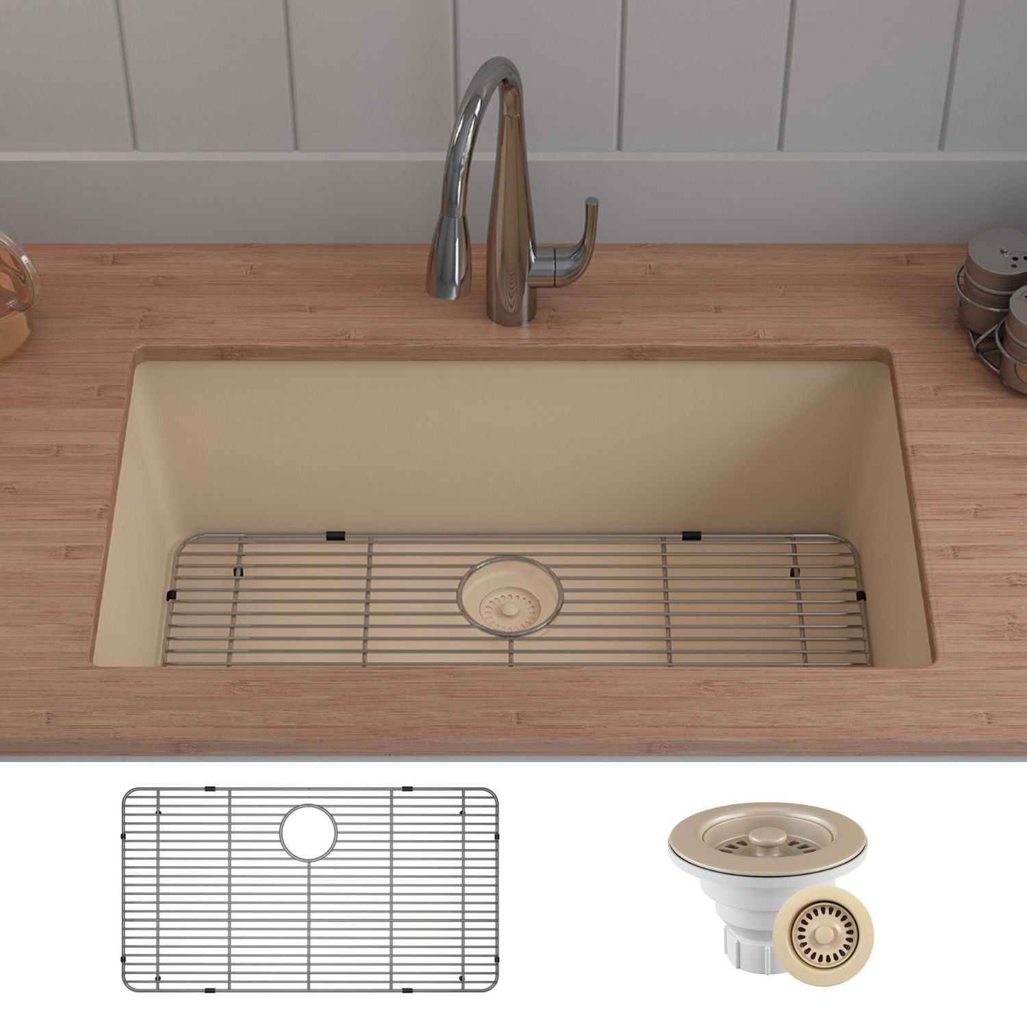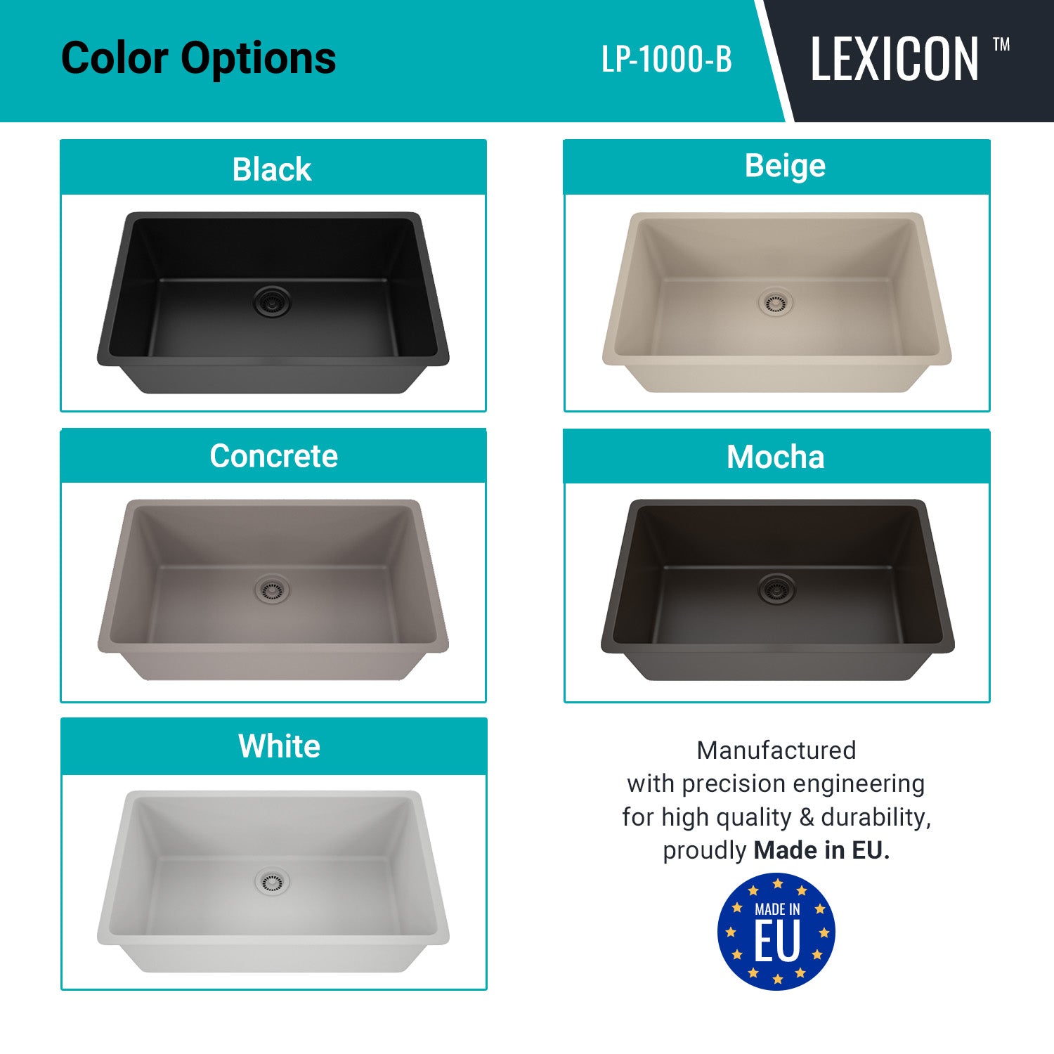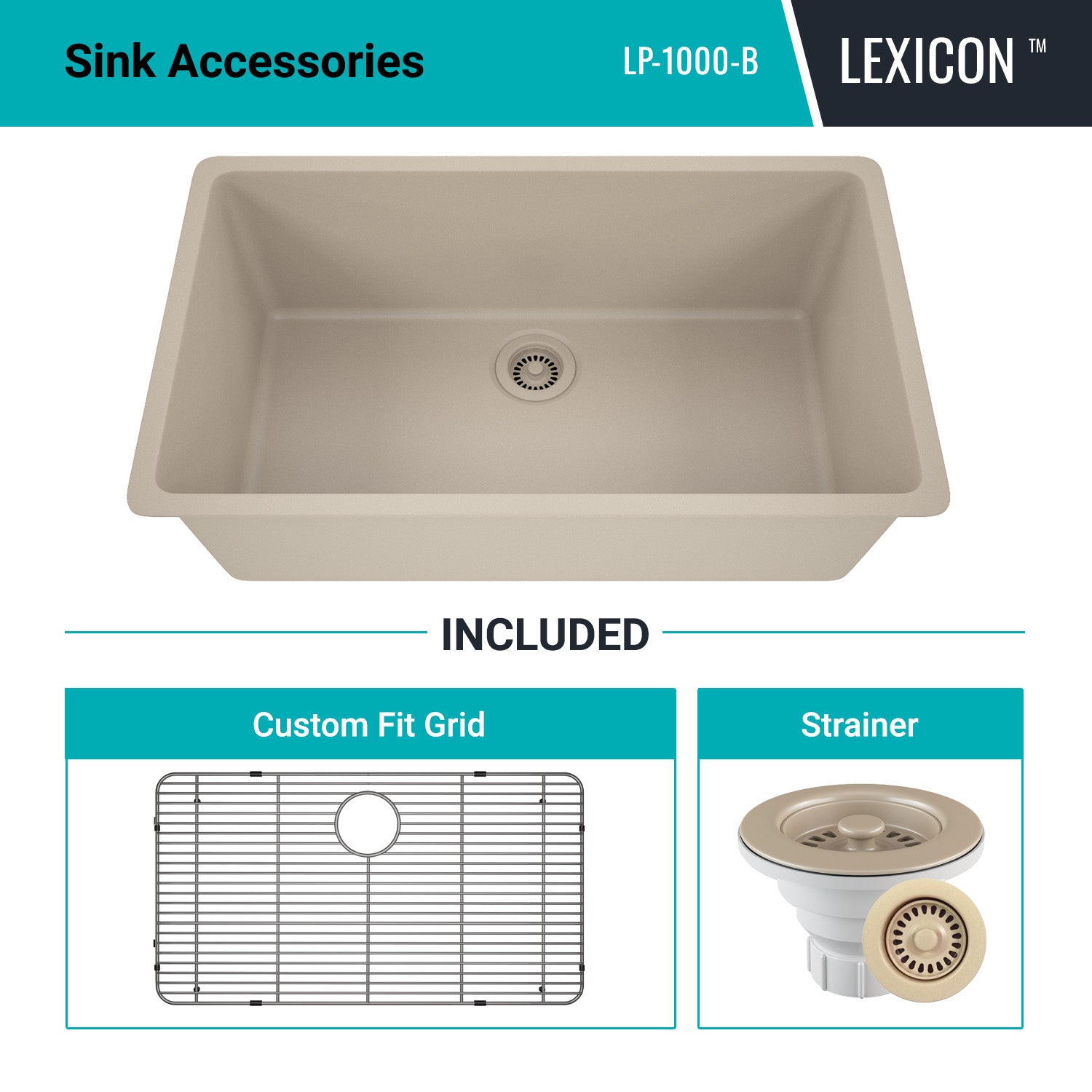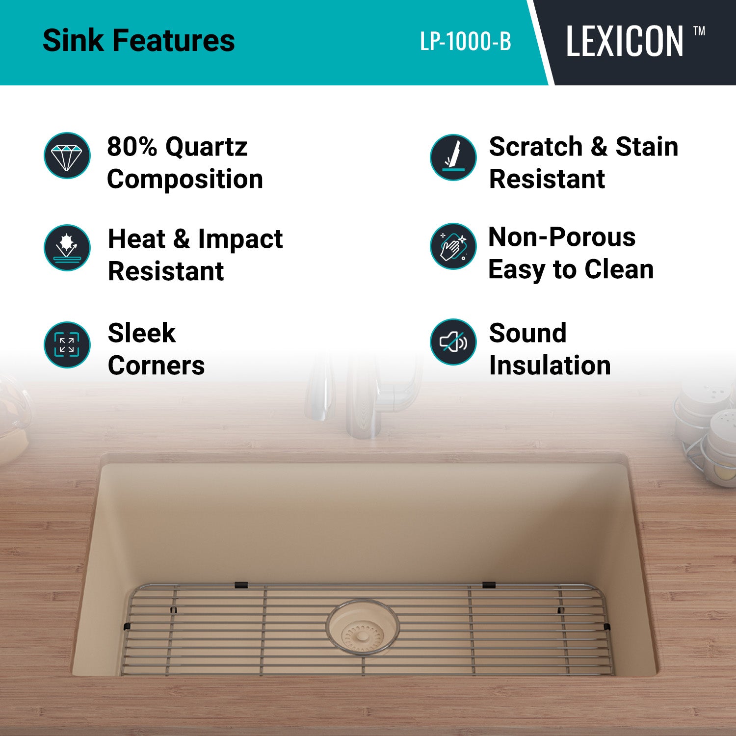 Elevate your Kitchen with the unmatched quality of the LEXICON™ Platinum Quartz Single Bowl Kitchen Sink. The LP-1000 Beige contemporary design and unparalleled convenience, includes meticulously crafted matching drain and bottom grid. Experience the luxury of a deep 9 inch bowl with rear positioned drain for optimal under-counter space utilization, and flawlessly smooth corner radiuses for effortless maintenance and care.
