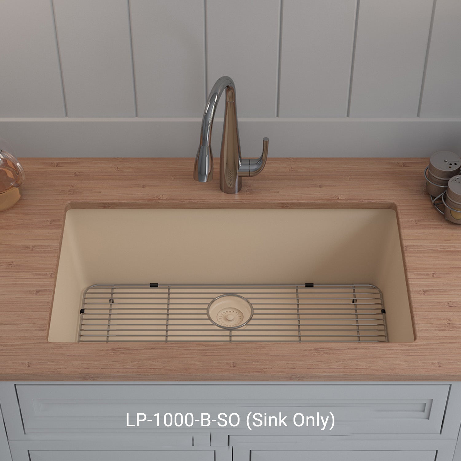 Elevate your kitchen with the unmatched quality of the Lexicon™ Platinum Quartz Large Single Bowl Kitchen Sink. The LP-1000 Beige epitomizes contemporary design and unparalleled convenience, includes meticulously crafted matching drain and bottom grid. Experience the luxury of a deep 9-inch bowl with rear positioned drain for optimal under-counter space utilization, and flawlessly smooth corner radiuses for effortless maintenance and care.