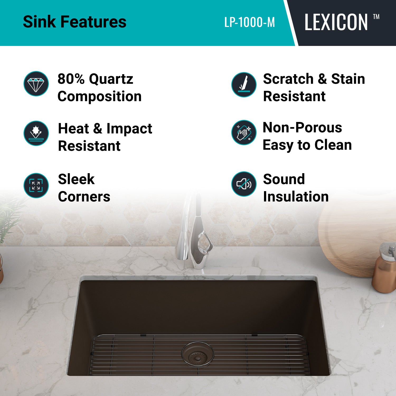 Elevate your Kitchen with the unmatched quality of the LEXICON™ Platinum Quartz Single Bowl Kitchen Sink. The LP-1000 Mocha contemporary design and unparalleled convenience, includes meticulously crafted matching drain and bottom grid. Experience the luxury of a deep 9 inch bowl with rear positioned drain for optimal under-counter space utilization, and flawlessly smooth corner radius for effortless maintenance and care.