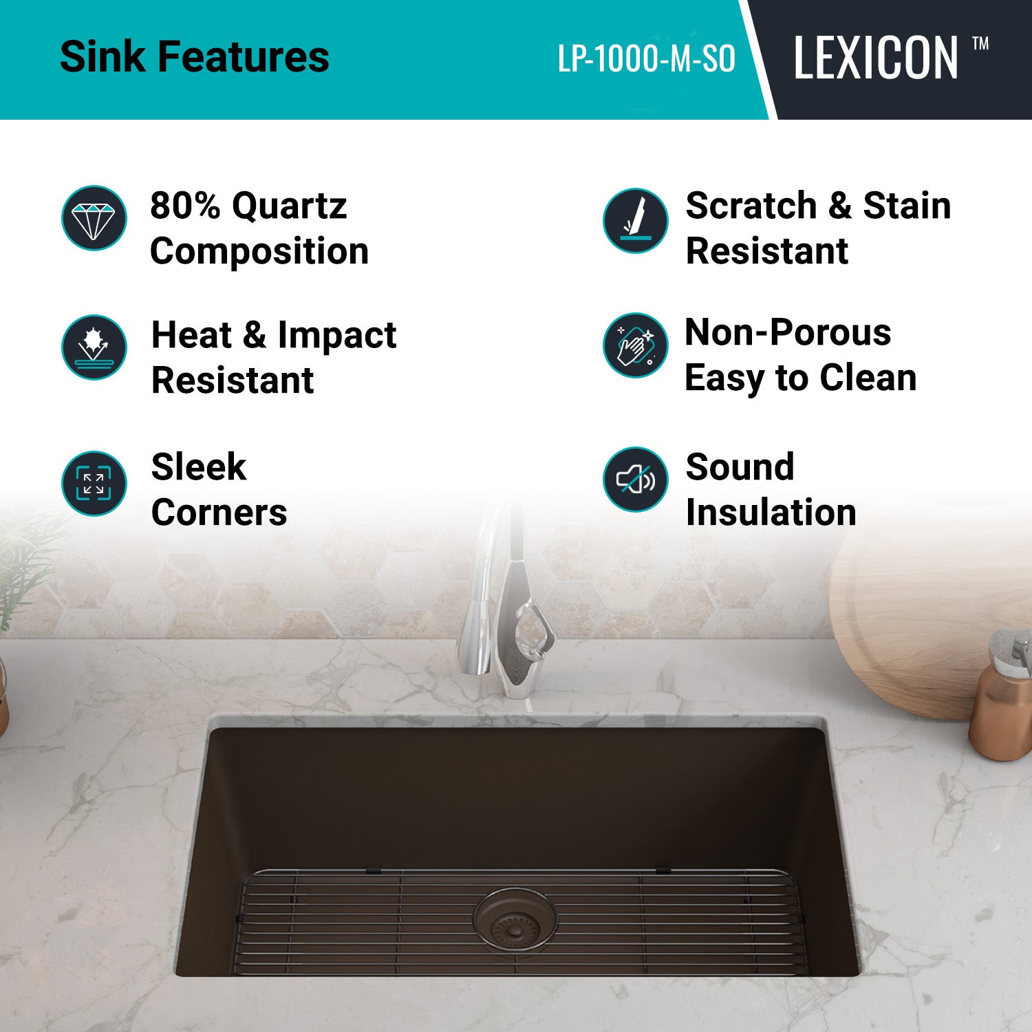 Elevate your kitchen with the unmatched quality of the Lexicon™ Platinum Quartz Large Single Bowl Kitchen Sink. The LP-1000 Mocha epitomizes contemporary design and unparalleled convenience. Experience the luxury of a deep 9-inch bowl with rear positioned drain for optimal under-counter space utilization, and flawlessly smooth corner radiuses for effortless maintenance and care.