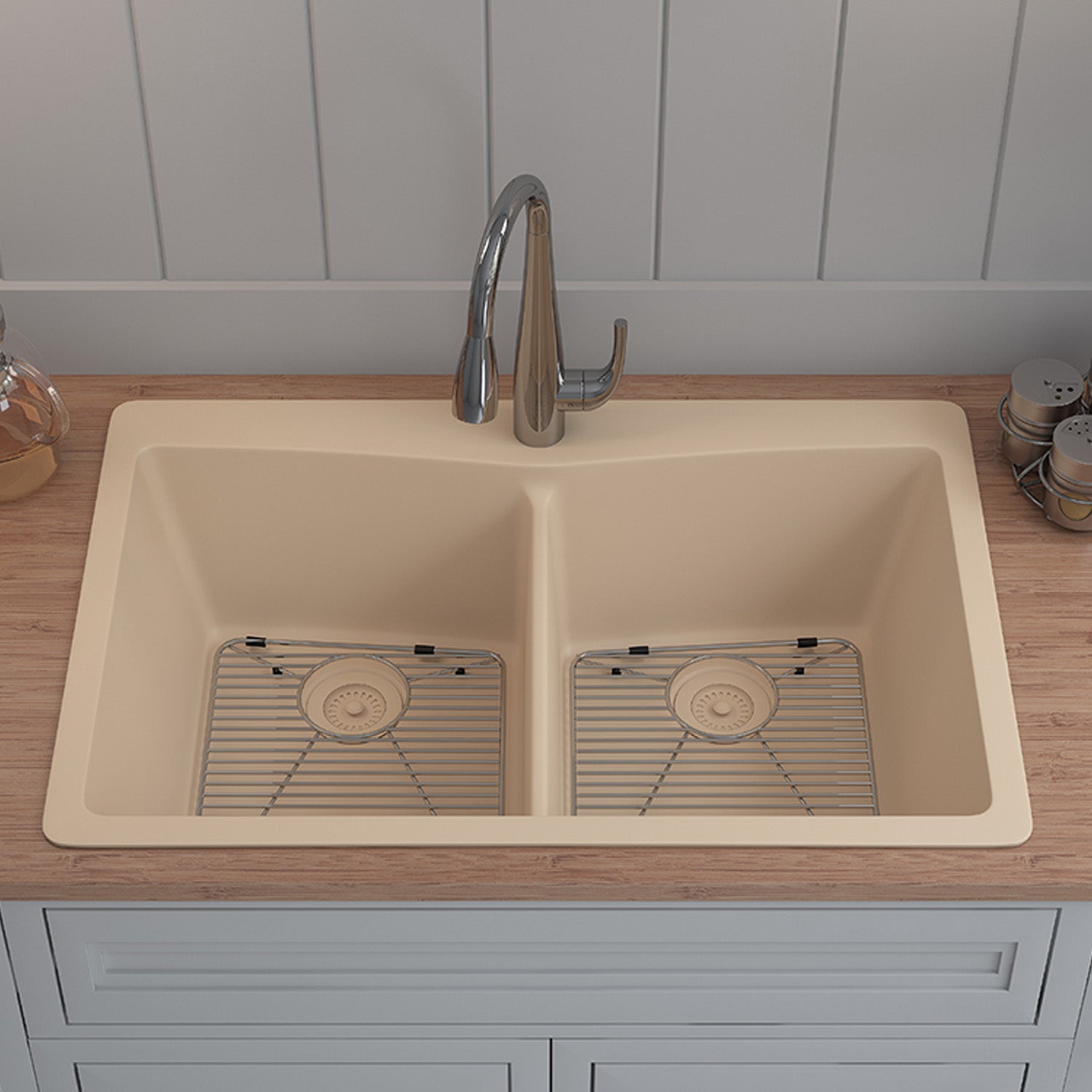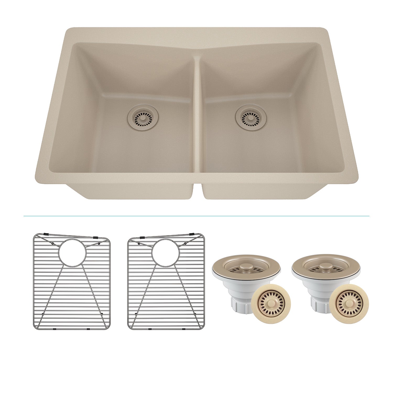 33-Inch Platinum Quartz Composite Drop-in Undermount 50/50 Double Bowl Galaxy Beige Kitchen Sink with Rear Drain Style includes Accessories Steel Grids, Drain Strainer, and Flange LP-800TM-B