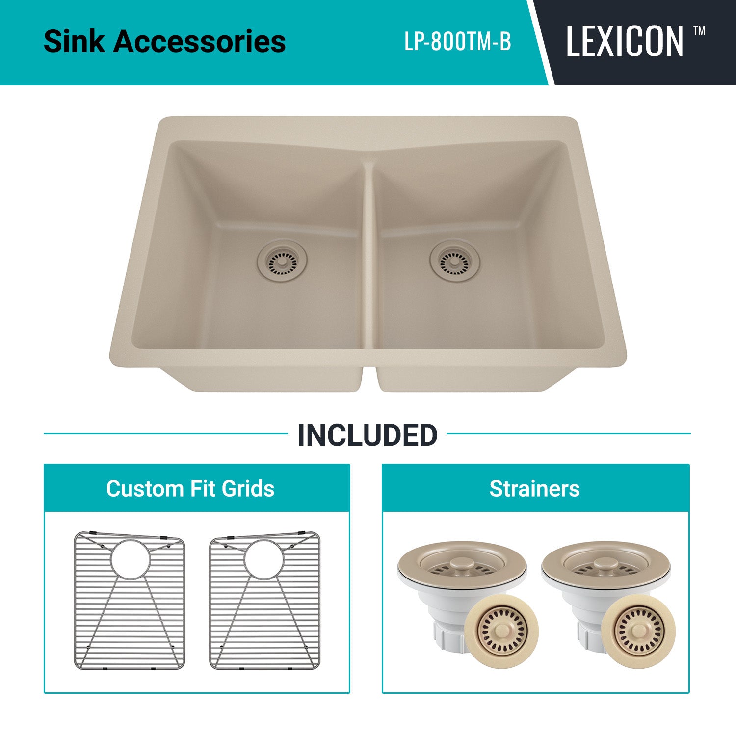 Elevate your Kitchen with the unmatched quality of the LEXICON™ Platinum Quartz Double Equal Bowl Kitchen Sink. The LP-800TM Beige epitomizes contemporary design and unparalleled convenience, includes meticulously crafted matching drain and bottom grid. Experience the luxury of a deep 9 inch bowls with rear positioned drain for optimal under-counter space utilization, and flawlessly smooth corner radiuses for effortless maintenance and care.