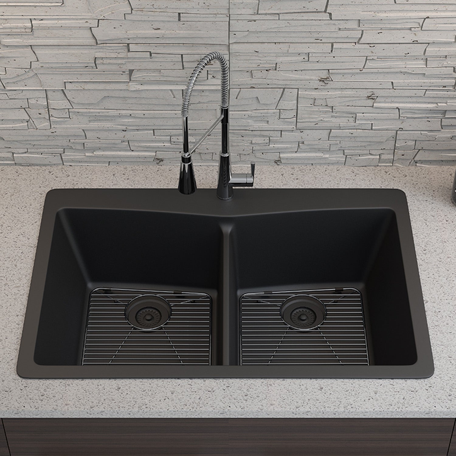 33-Inch Platinum Quartz Composite Drop-in Undermount 50/50 Double Bowl Galaxy Black Kitchen Sink with Rear Drain Style includes Accessories Steel Grids, Drain Strainer, and Flange LP-800TM-K