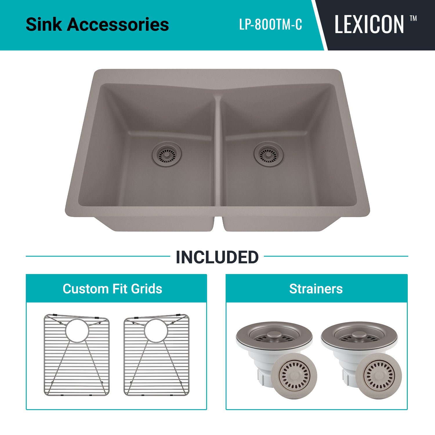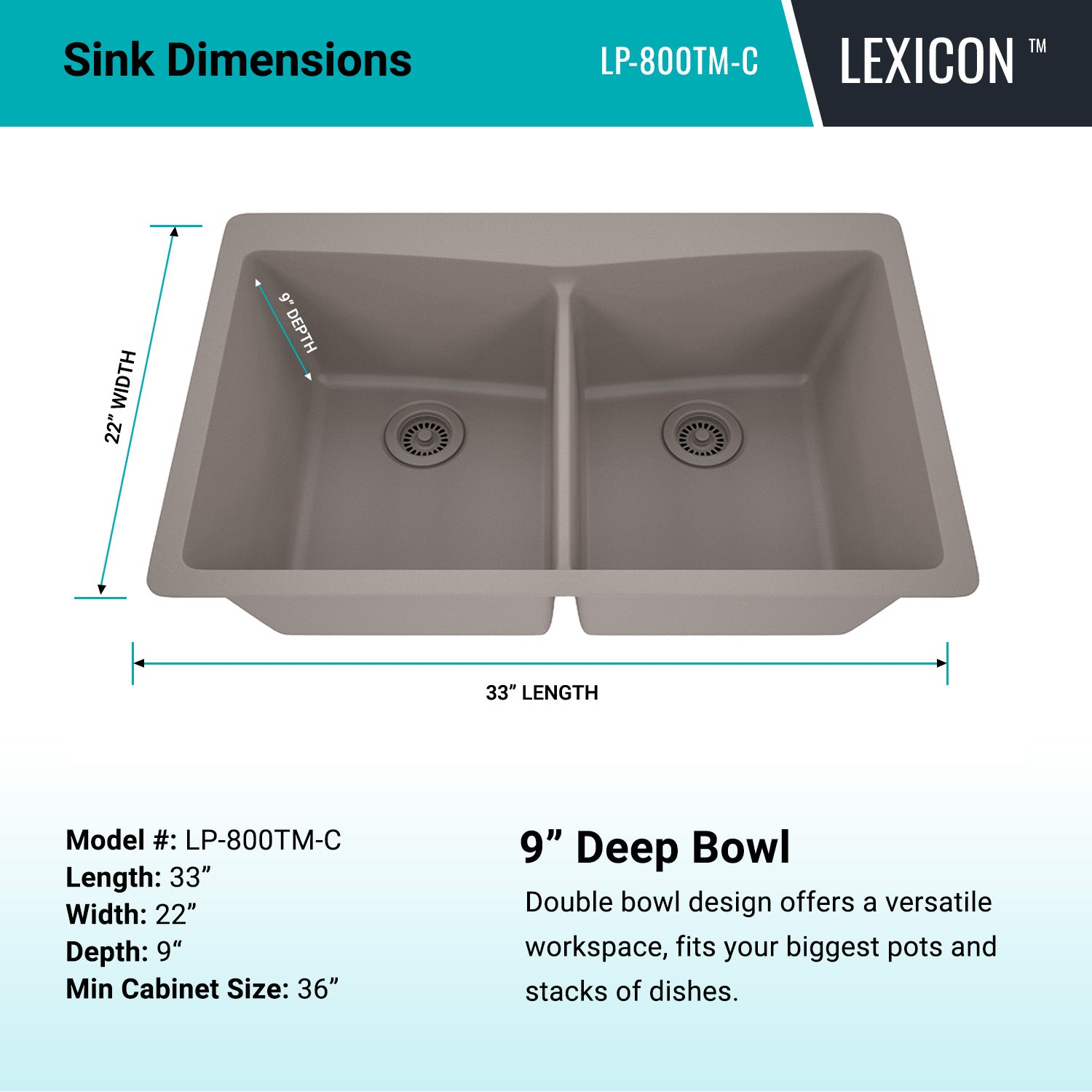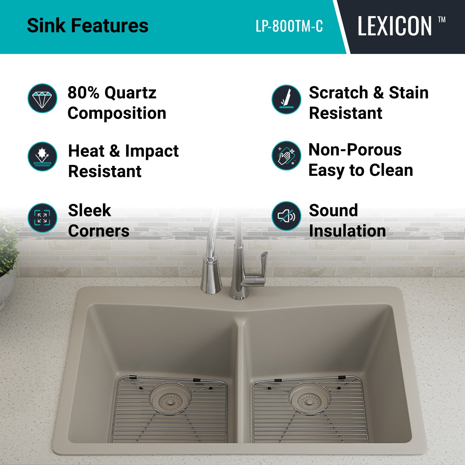 Elevate your Kitchen with the unmatched quality of the LEXICON™ Platinum Quartz Double Equal Bowl Kitchen Sink. The LP-800TM Concrete epitomizes contemporary design and unparalleled convenience, includes meticulously crafted matching drain and bottom grid. Experience the luxury of a deep 9 inch bowls with rear positioned drain for optimal under-counter space utilization, and flawlessly smooth corner radiuses for effortless maintenance and care.