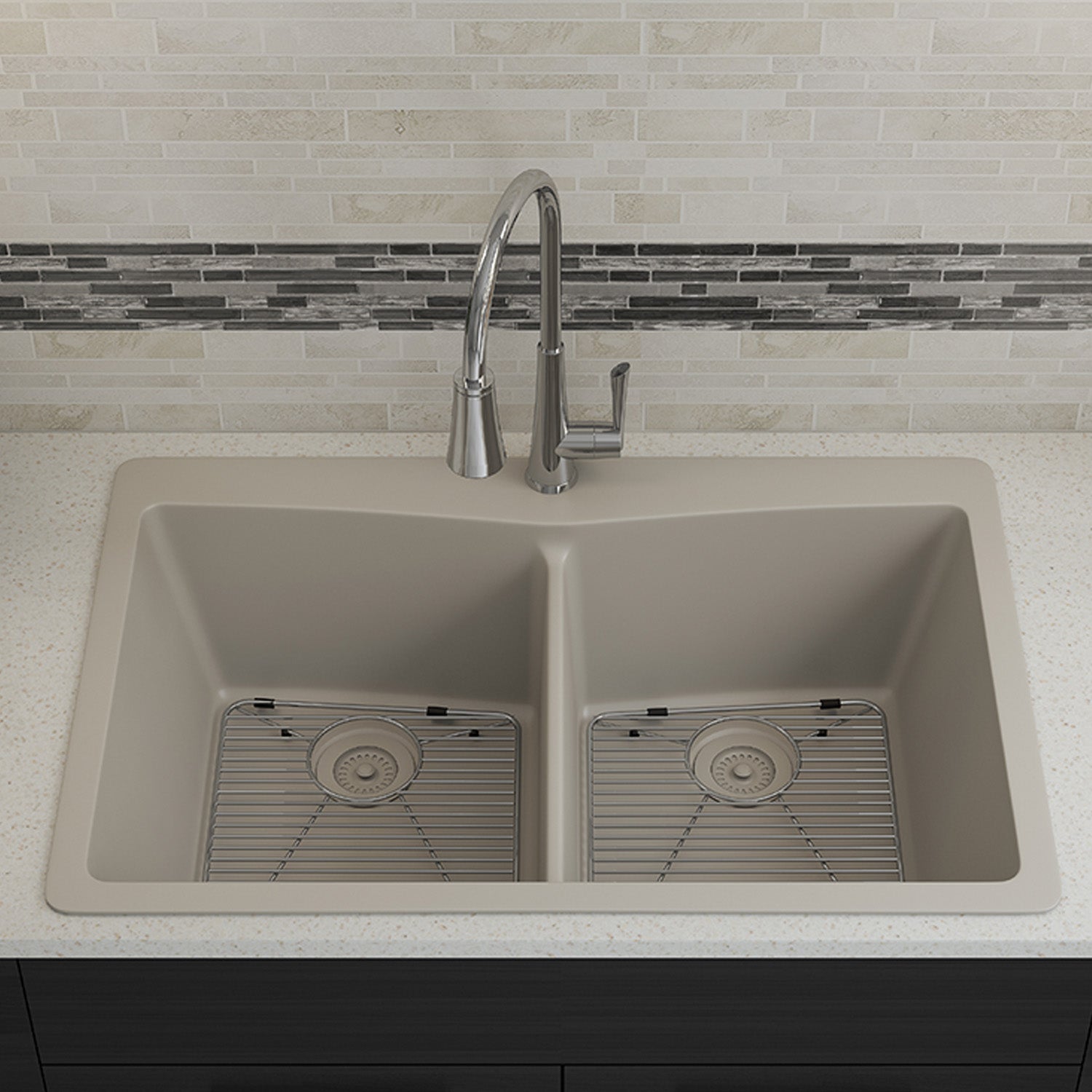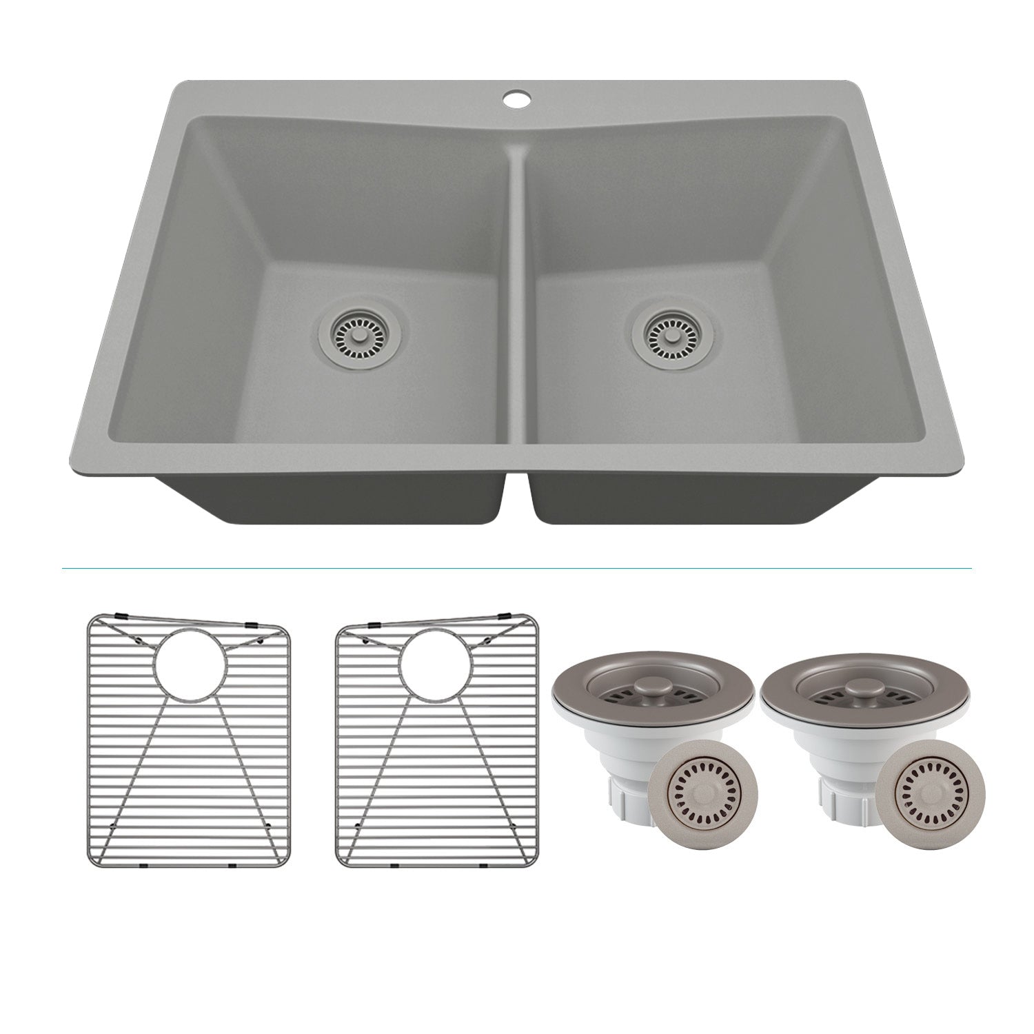 33-Inch Platinum Quartz Composite Drop-in Undermount 50/50 Double Bowl Galaxy Concrete Kitchen Sink with Rear Drain Style includes Accessories Steel Grids, Drain Strainer, and Flange LP-800TM-C