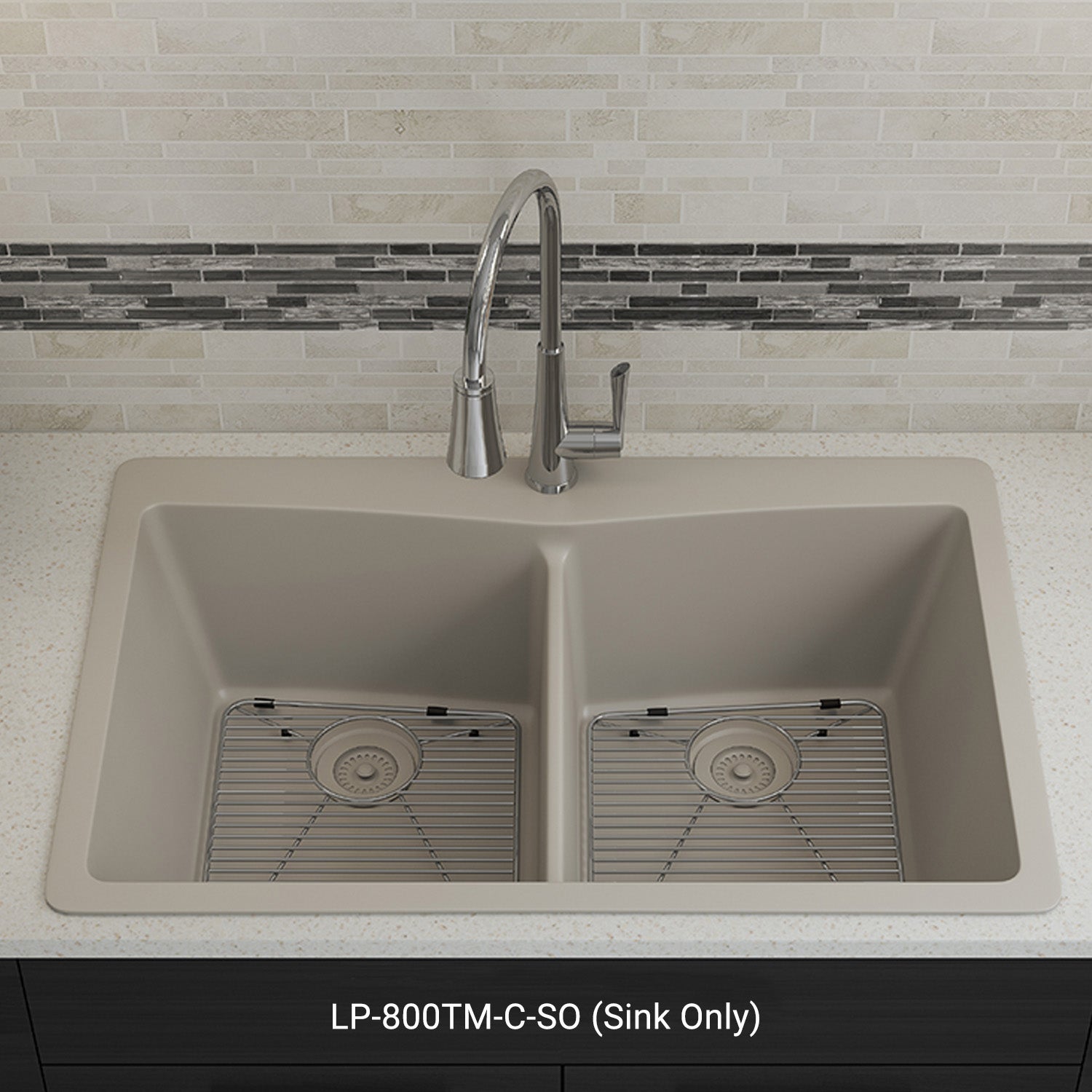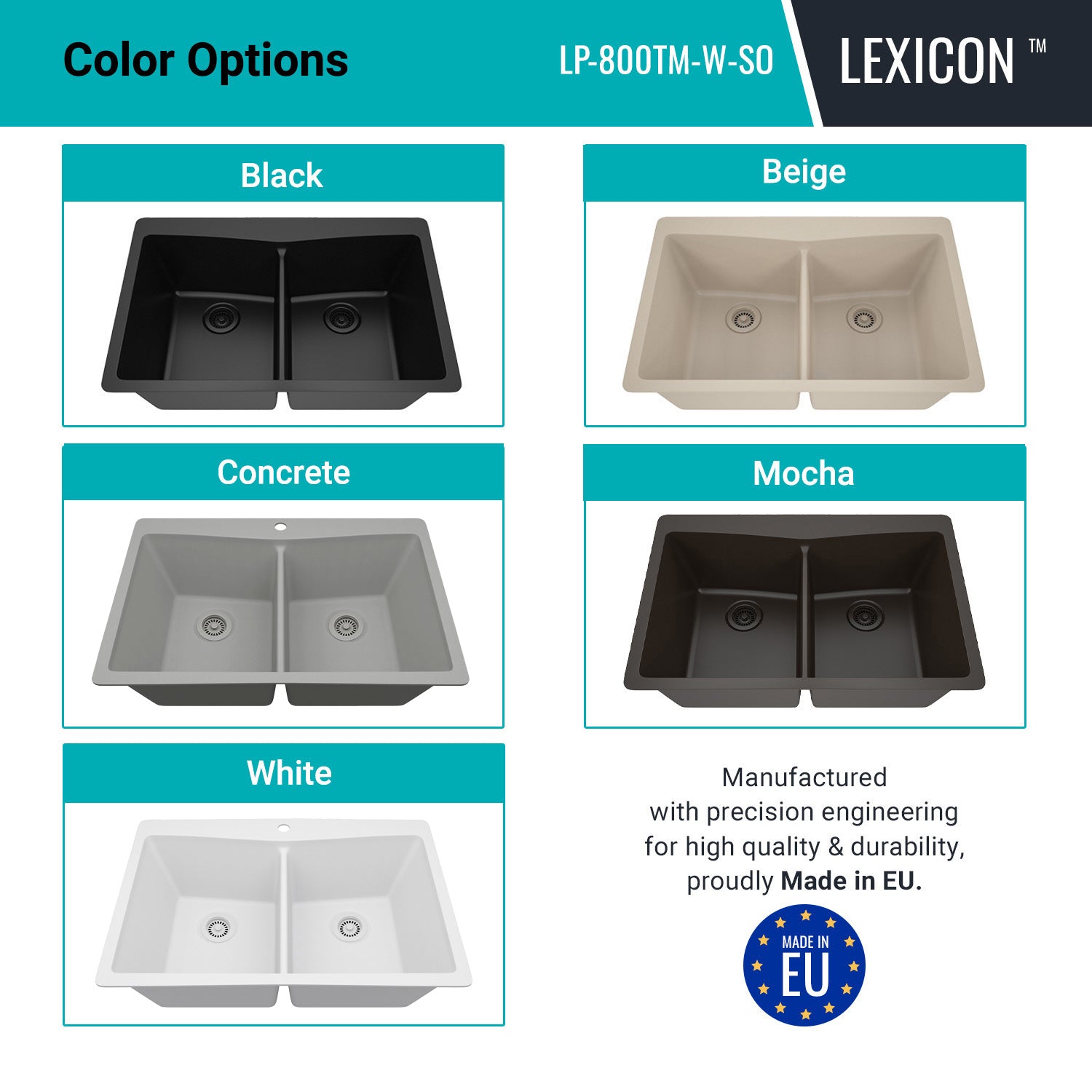 Elevate your kitchen with the unmatched quality of the Lexicon Platinum Quartz Equal Double Bowl Kitchen Sink. The LP-800TM Concrete epitomizes contemporary design and unparalleled convenience. Experience the luxury of a deep 9 inch double bowl with rear positioned drain for optimal under-counter space utilization, and flawlessly smooth corner radiuses for effortless maintenance and care.