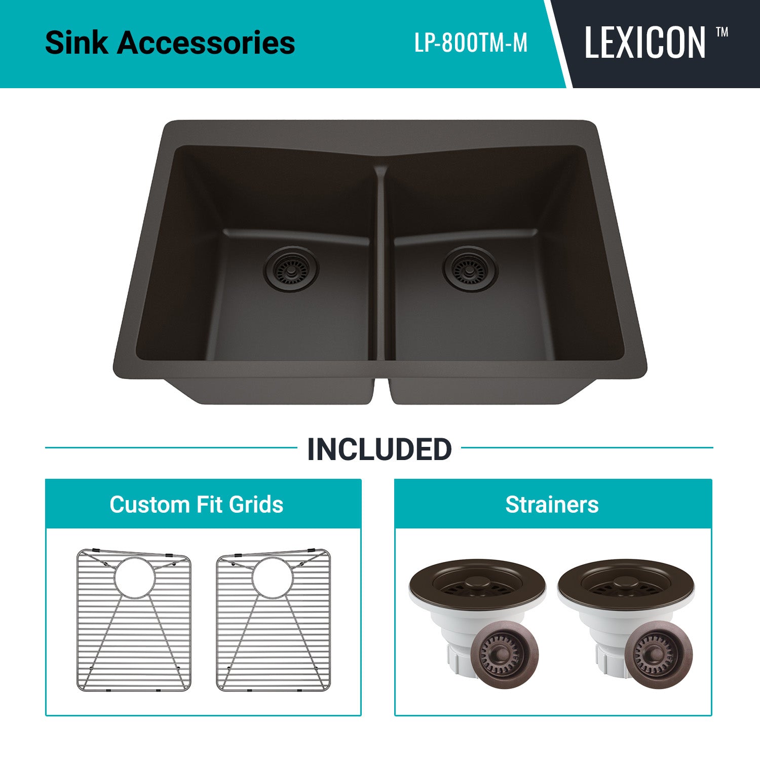 33-Inch Platinum Quartz Composite Drop-in Undermount 50/50 Double Bowl Galaxy Mocha Kitchen Sink with Rear Drain Style includes Accessories Steel Grids, Drain Strainer, and Flange LP-800TM-M