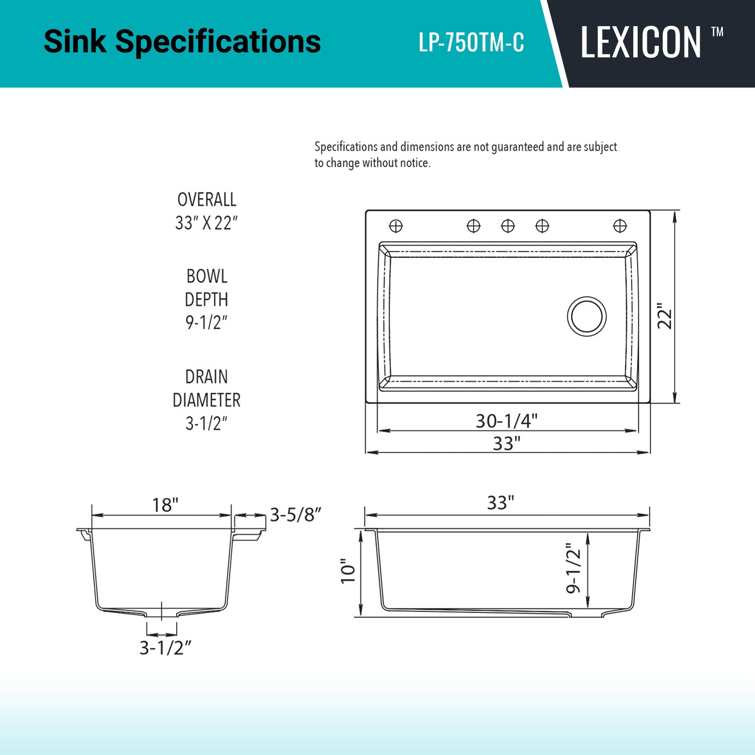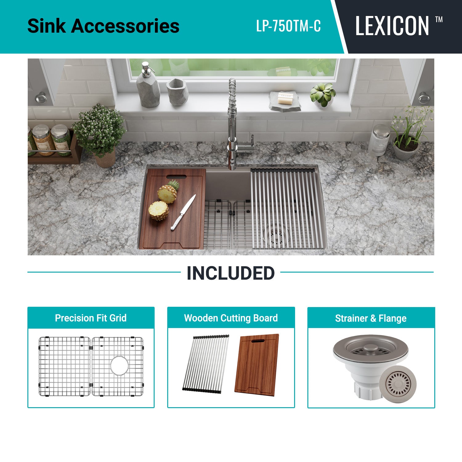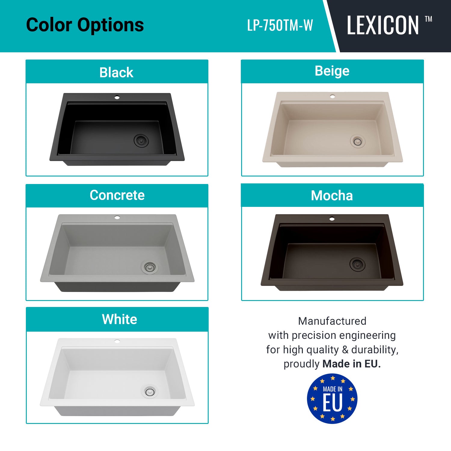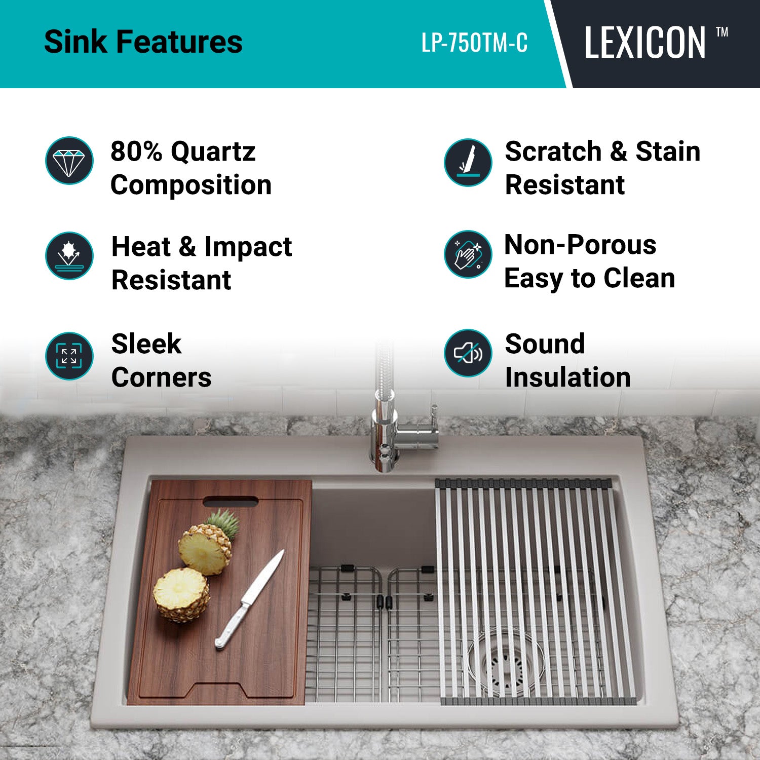 Elevate your Kitchen with the unmatched quality of the LEXICON™ Platinum Quartz Workstation Single Bowl Kitchen Sink. The LP-750TM Concrete epitomizes contemporary design and unparalleled convenience, includes meticulously crafted matching drain and bottom grid. Experience the luxury of a deep 9-1/2 inch bowl with Offset Side Drain placement for optimal under-counter space utilization, and flawlessly smooth corner radiuses for effortless maintenance and care.